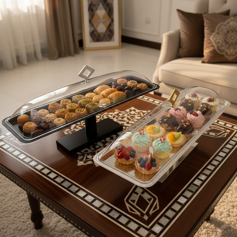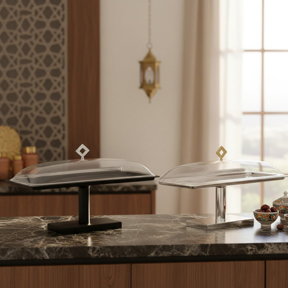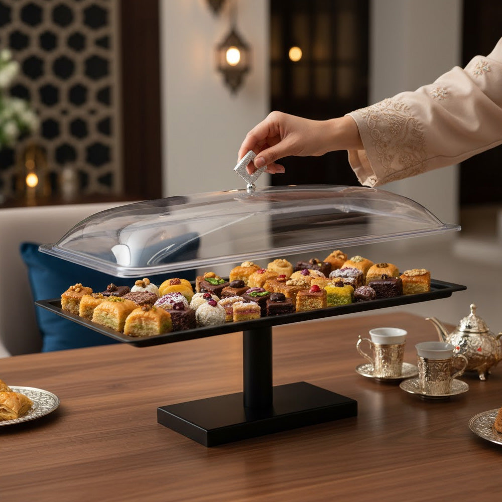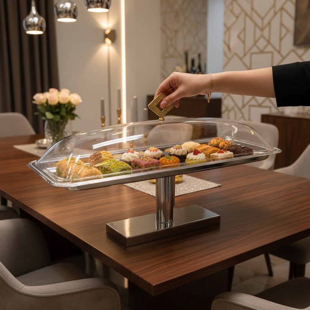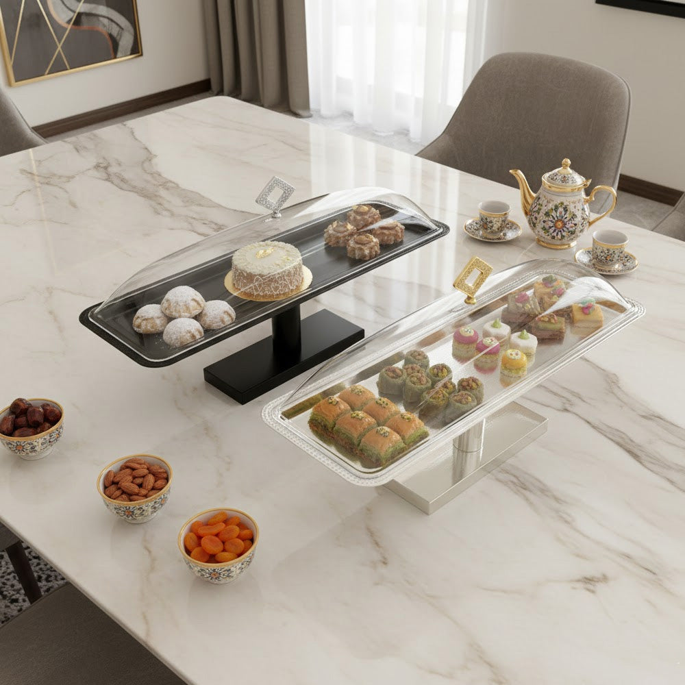 يسمح الغطاء المقبب الشفاف برؤية طعامك بوضوح مع حمايته من الغبار والهواء. تضفي القاعدة المرتفعة لمسة راقية، مما يجعله مثاليًا للمناسبات الخاصة، والبوفيهات، وحفلات الزفاف، والمقاهي، والاستخدام المنزلي.