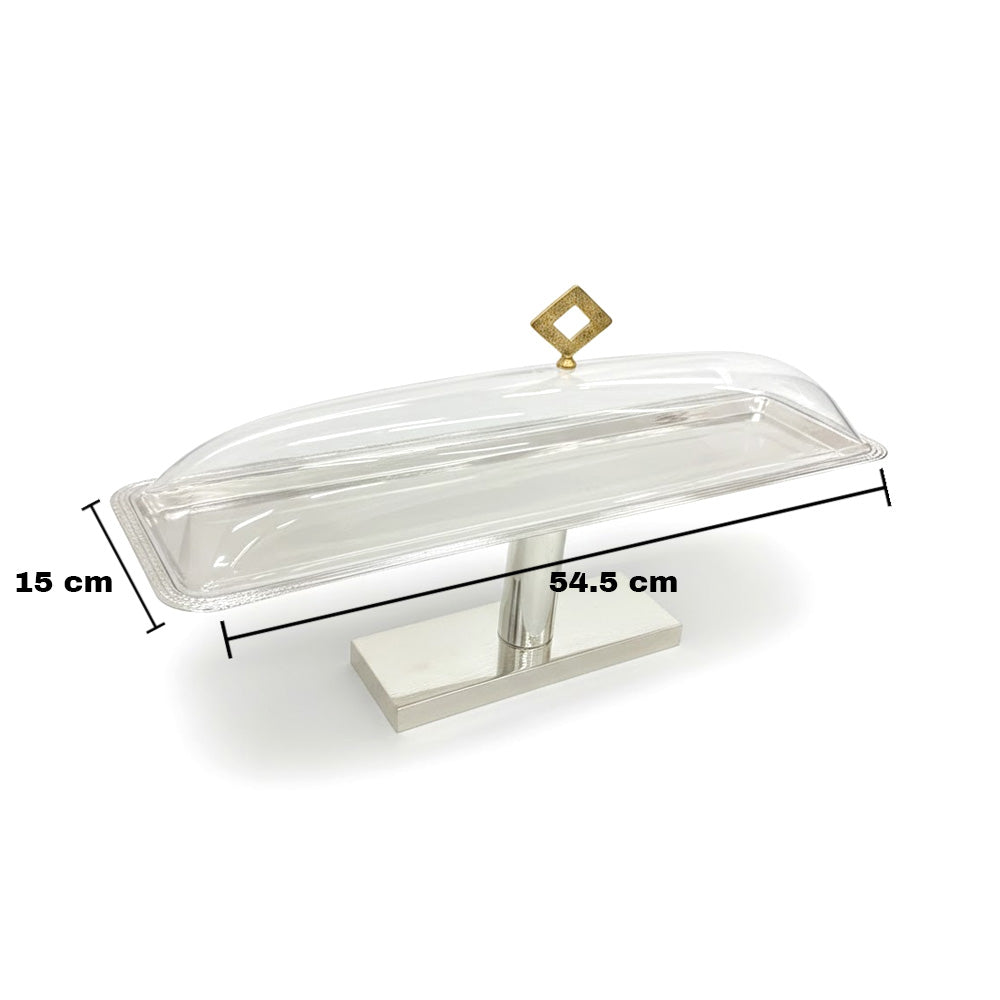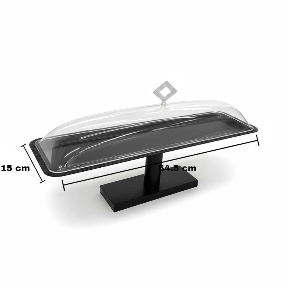 أضف لمسة جمالية إلى تقديم حلوياتك مع حامل الكيك المستطيل الأنيق ذي الغطاء المقبب، المصمم ليجمع بين الجمال والعملية. يبلغ طوله 54.5 سم وعرضه 15 سم، وهو مثالي لتقديم الكيك والمعجنات والحلويات والمقبلات مع الحفاظ عليها طازجة ومحمية.