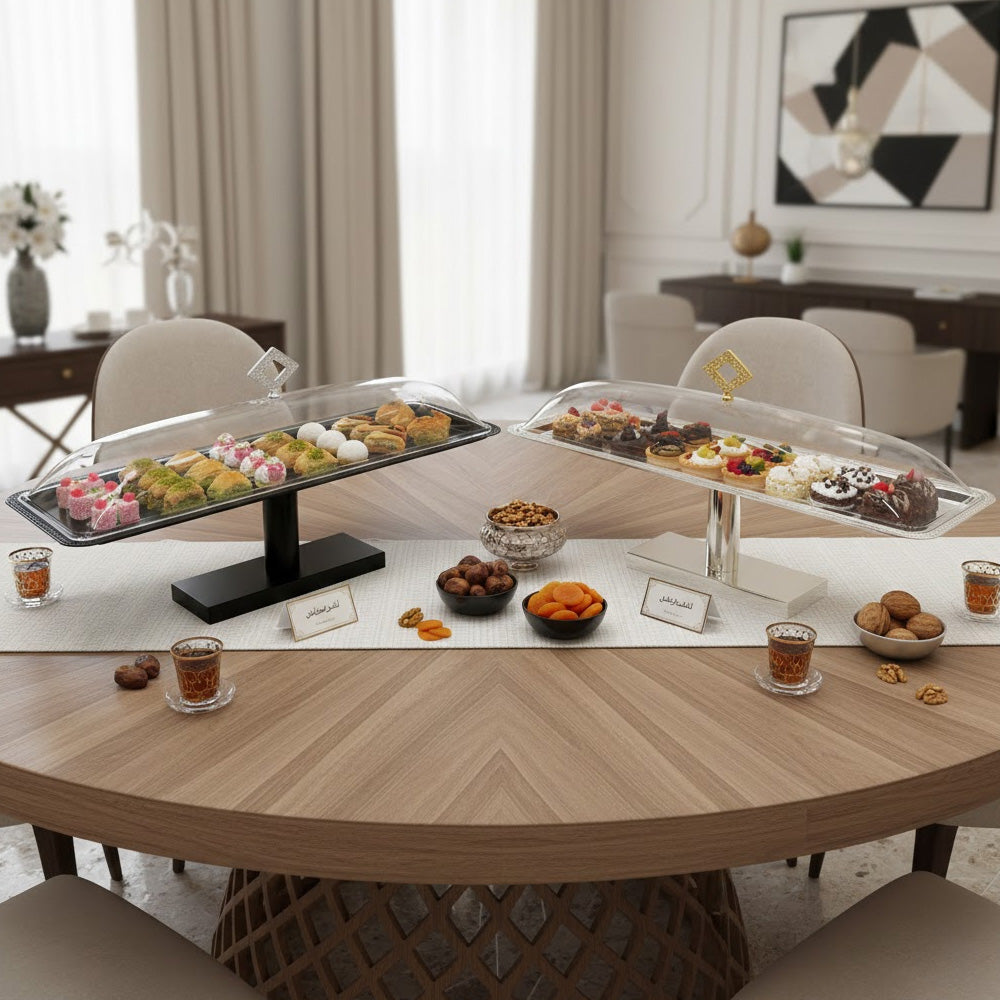 يتوفر حامل الكيك هذا بقاعدة سوداء أو فضية، ويتناغم بسلاسة مع ديكورات المائدة العصرية والكلاسيكية.
