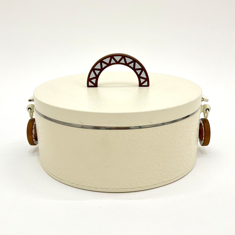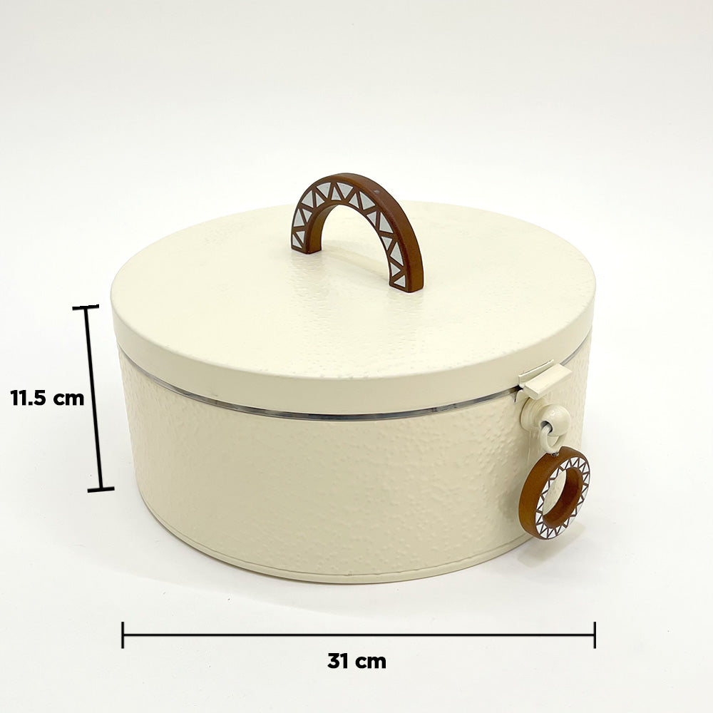 تجمع هذه الحافظة الدائرية الأنيقة والمعزولة لتخزين الطعام بين العملية والتصميم العصري. يبلغ قطرها 31 سم وارتفاعها 11.5 سم، مما يوفر مساحة واسعة لتخزين وتقديم مجموعة متنوعة من الأطباق. تتميز الحافظة بجزء داخلي معدني متين يساعد في الحفاظ على درجة حرارة الطعام، بينما يضفي الجزء الخارجي الكريمي المزخرف لمسة أنيقة على مطبخك.