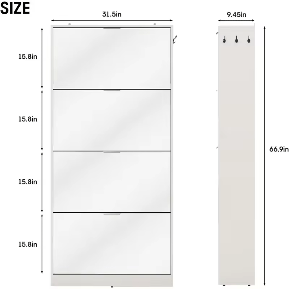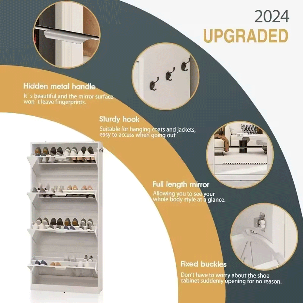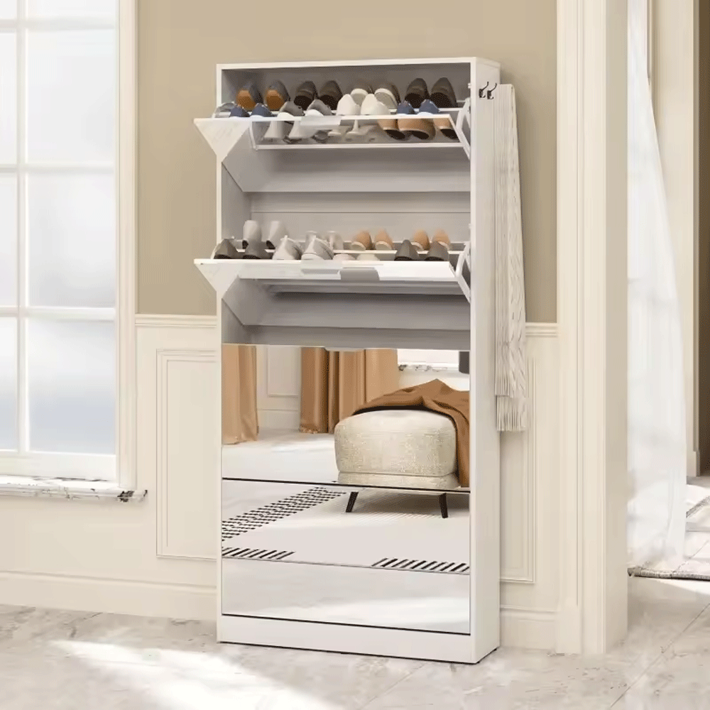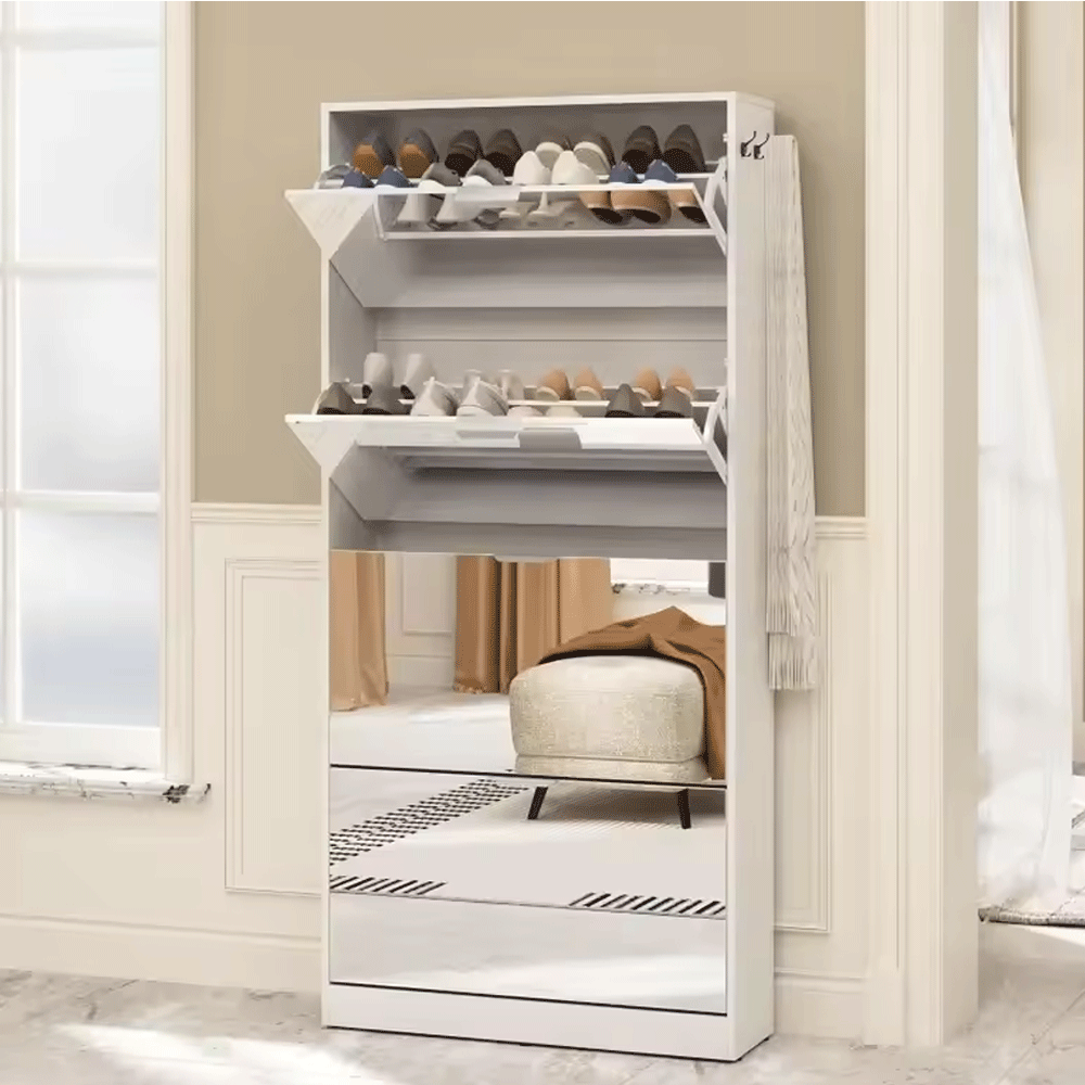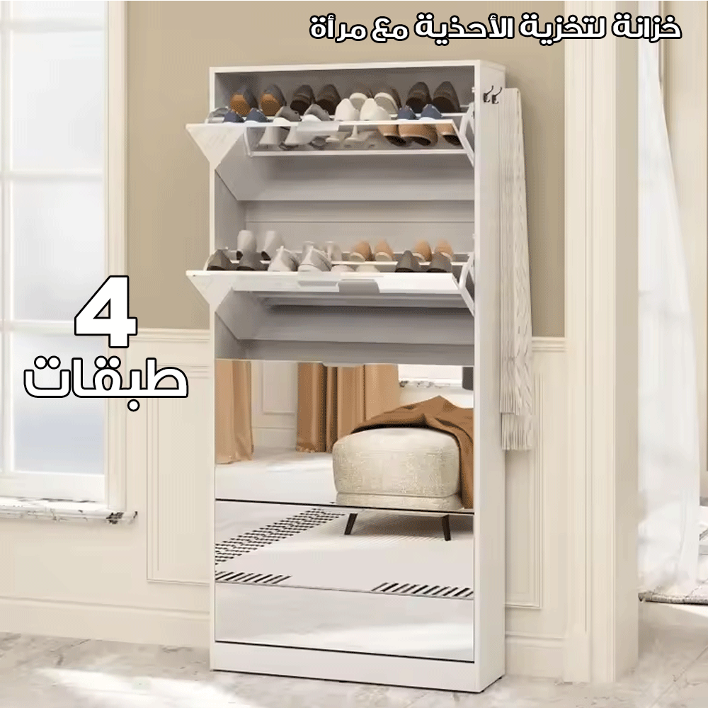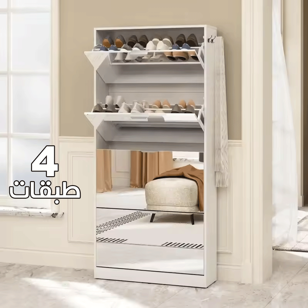 خزانة أحذية بمرآة مع أدراج قلاب ، منظم أحذية خشبي ، 4 طبقات للمساحات الصغيرة ، رف أحذية بمرآة كامل الطول
