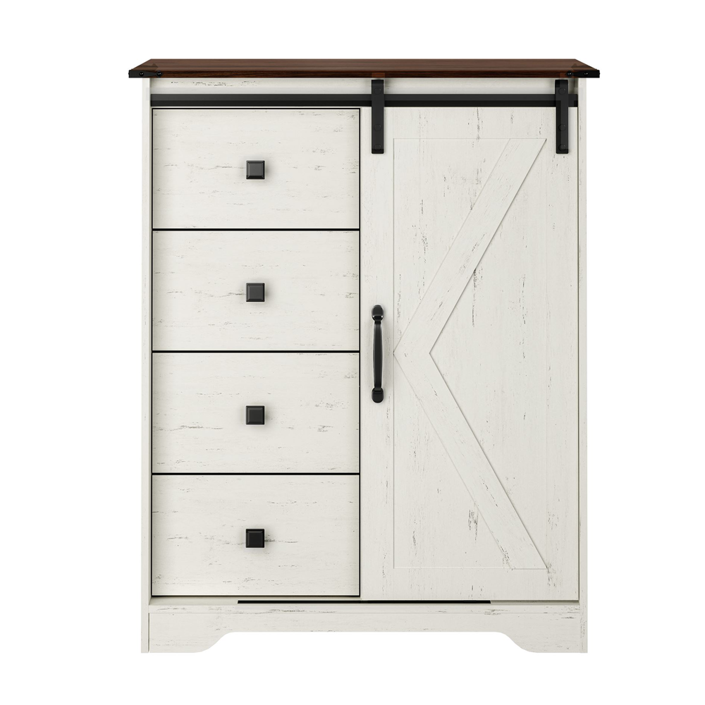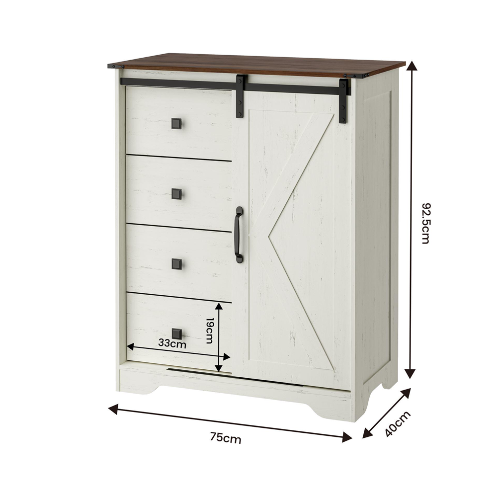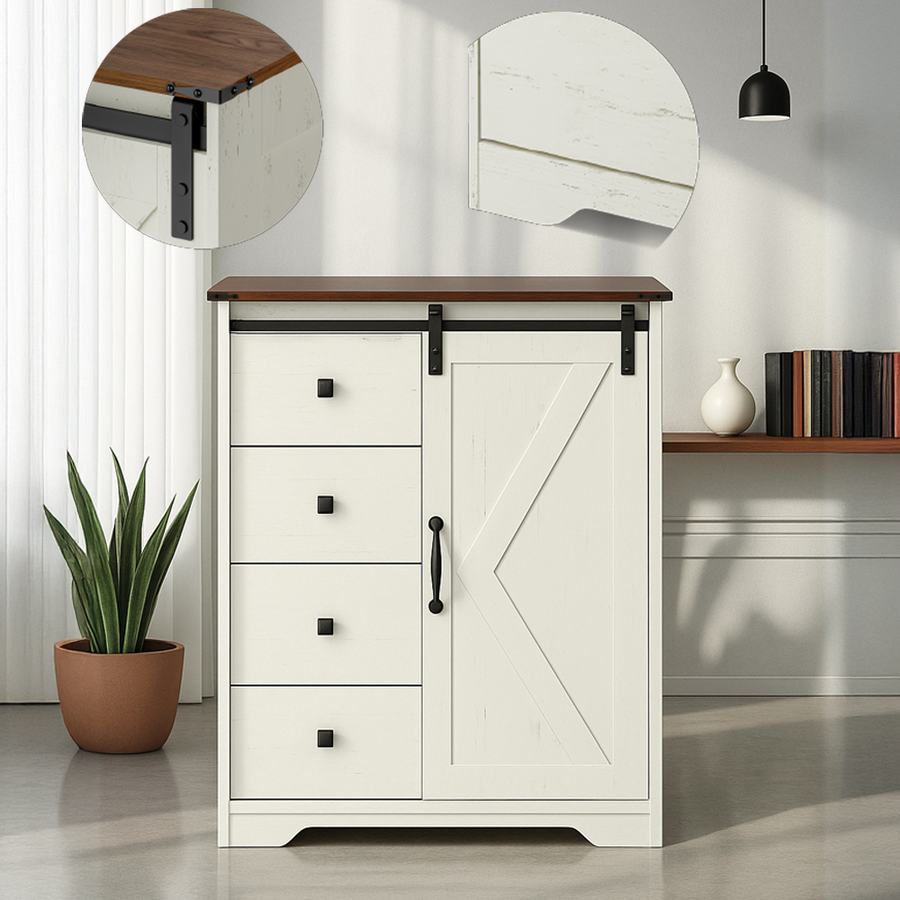 تأتي الخزانة بسطح علوي بلون خشبي طبيعي يضيف لمسة دافئة، مع واجهة بلون أبيض مطفي أنيق، مزودة بأربعة أدراج واسعة لتخزين الملابس أو الأدوات اليومية، وباب منزلق بتصميم هندسي مميز يسهل فتحه ويوفر المساحة.