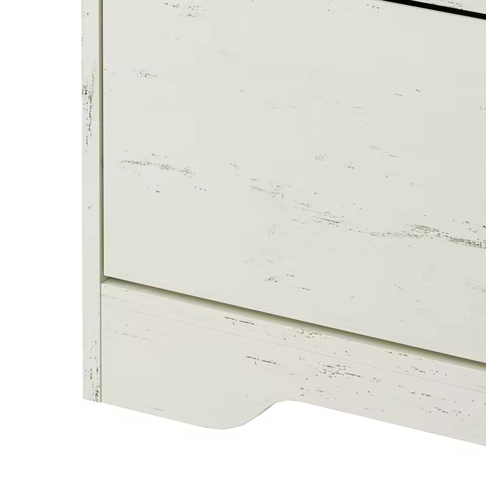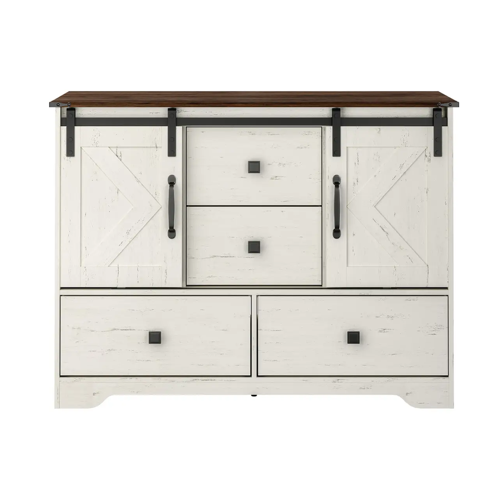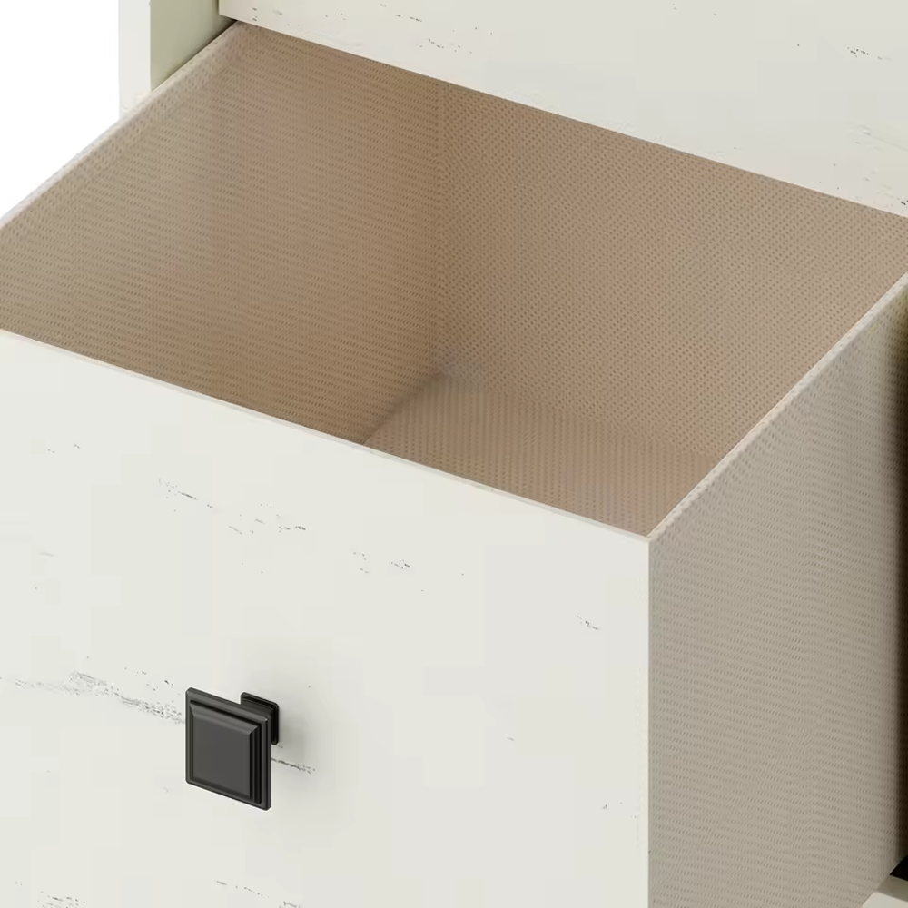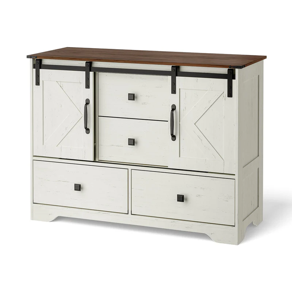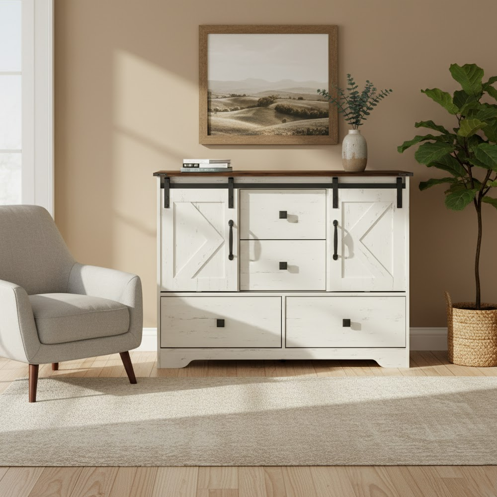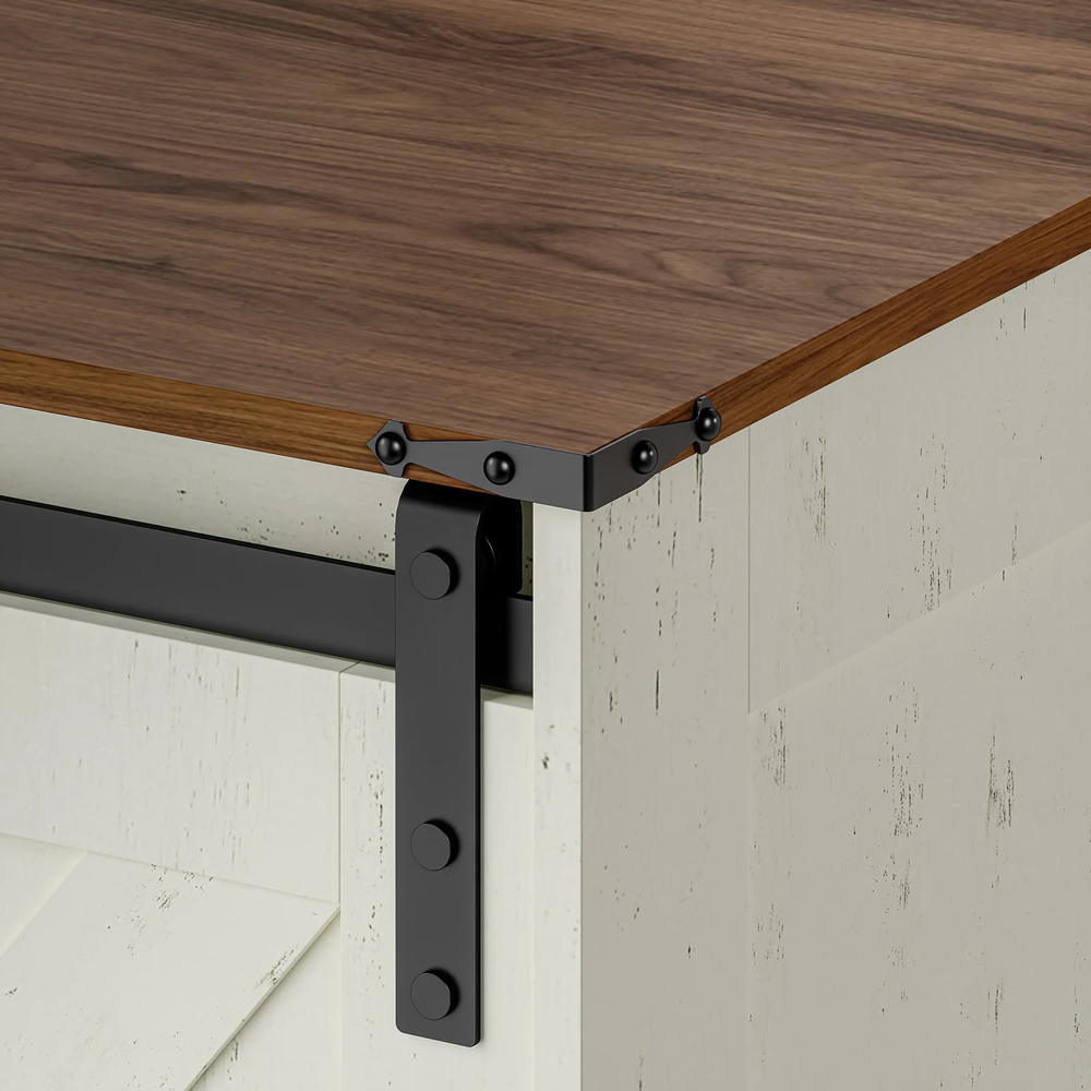 تتميز الخزانة بمزيج أنيق من اللون الأبيض الخشبي مع سطح علوي بلون بني داكن يضفي إحساسًا بالدفء والفخامة.