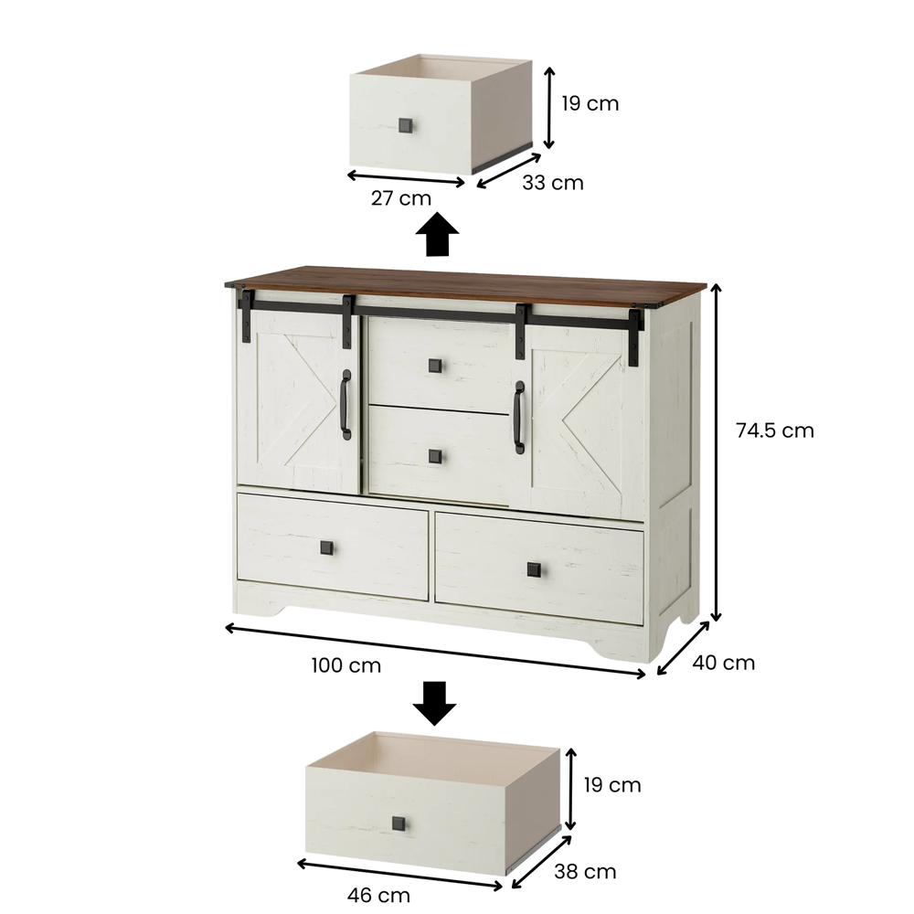 مزودة بأبواب منزلقة عملية لتوفير المساحة وسهولة الوصول إلى المحتويات، بالإضافة إلى خمسة أدراج واسعة بتصميم عصري تسهل تخزين الملابس، الأغراض المنزلية أو أدوات الديكور.