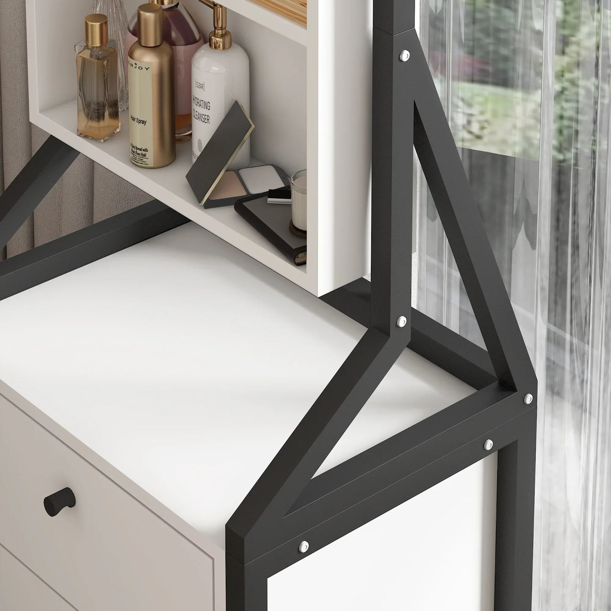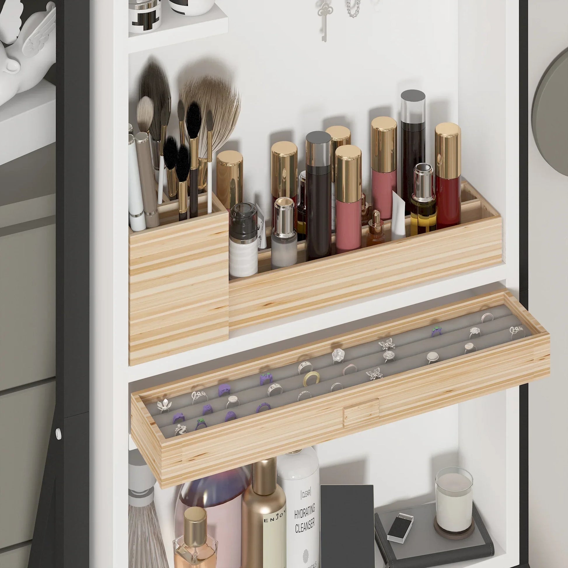 خزانة مجوهرات ومستحضرات تجميل مزودة بمرآة دوارة 360 درجة ودرجين سفليين؛ تتميز بمساحة تخزين واسعة قابلة للدوران بحرية، ومطلية يدويًا بطلاء أبيض فاخر.