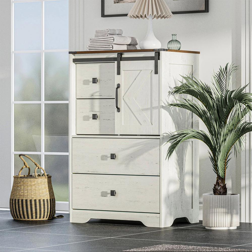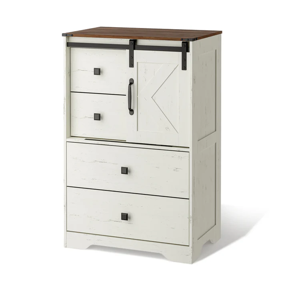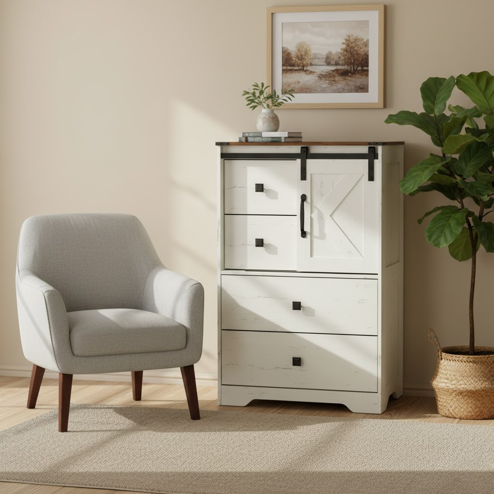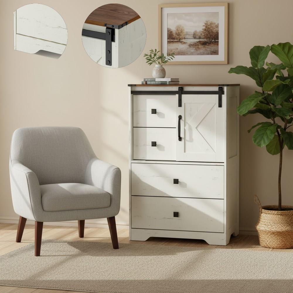 تصميم فريد مع مساحة تخزين متنوعة - مزيج من أحجام أدراج مختلفة يُسهّل تخزين الملابس، والإكسسوارات، والأجهزة الإلكترونية، أو الأدوات المنزلية. يكشف باب الحظيرة المنزلق عن مساحات تخزين مخفية، مما يمنحك الأناقة والراحة.