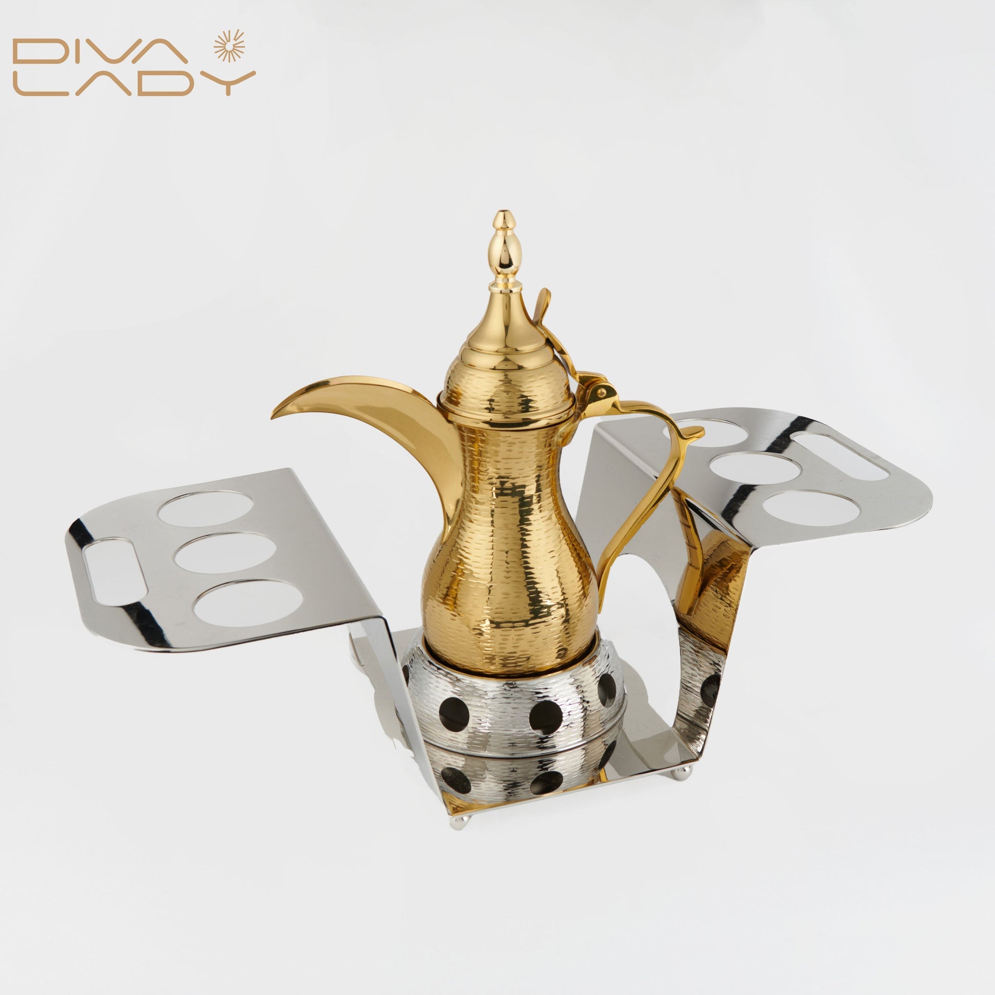 ارتقِ بتقديم القهوة العربية إلى مستوى جديد من الأناقة مع طقم دلة فاخر مزود بحامل أكواب مبتكر. تأتي الدلة بلون ذهبي لامع مع نقوش تراثية، مثبتة على قاعدة معدنية باللون الفضي تحتوي على فتحات لتثبيت الفناجين بطريقة أنيقة وعملية.