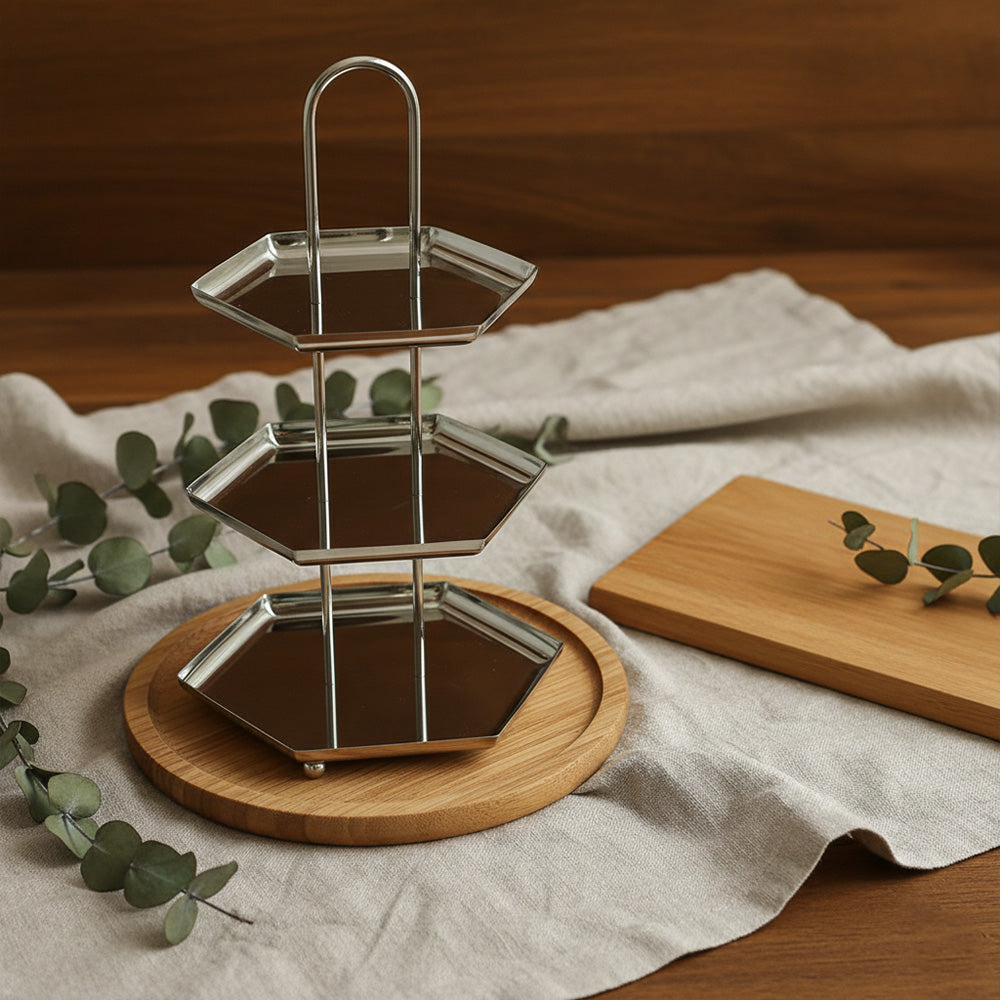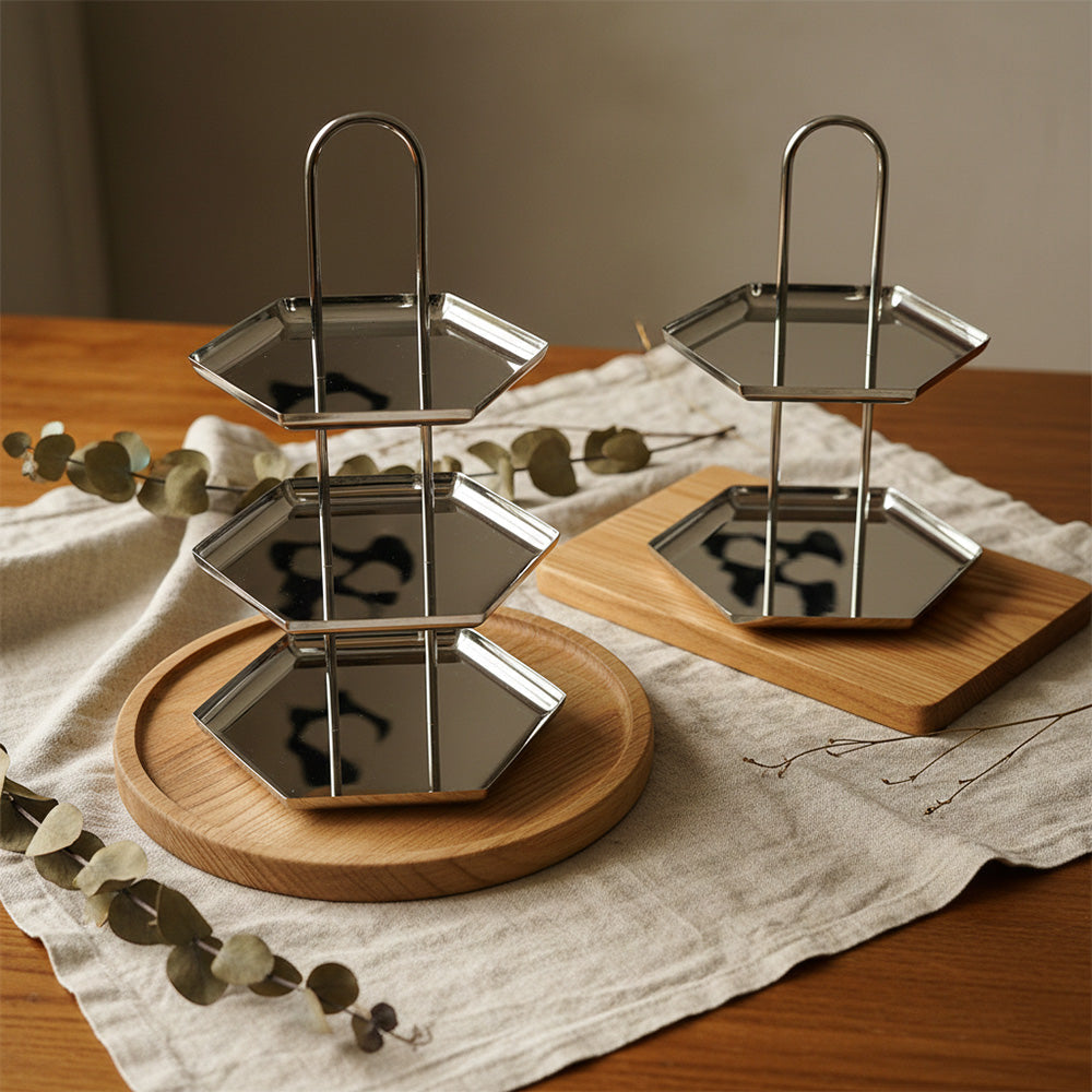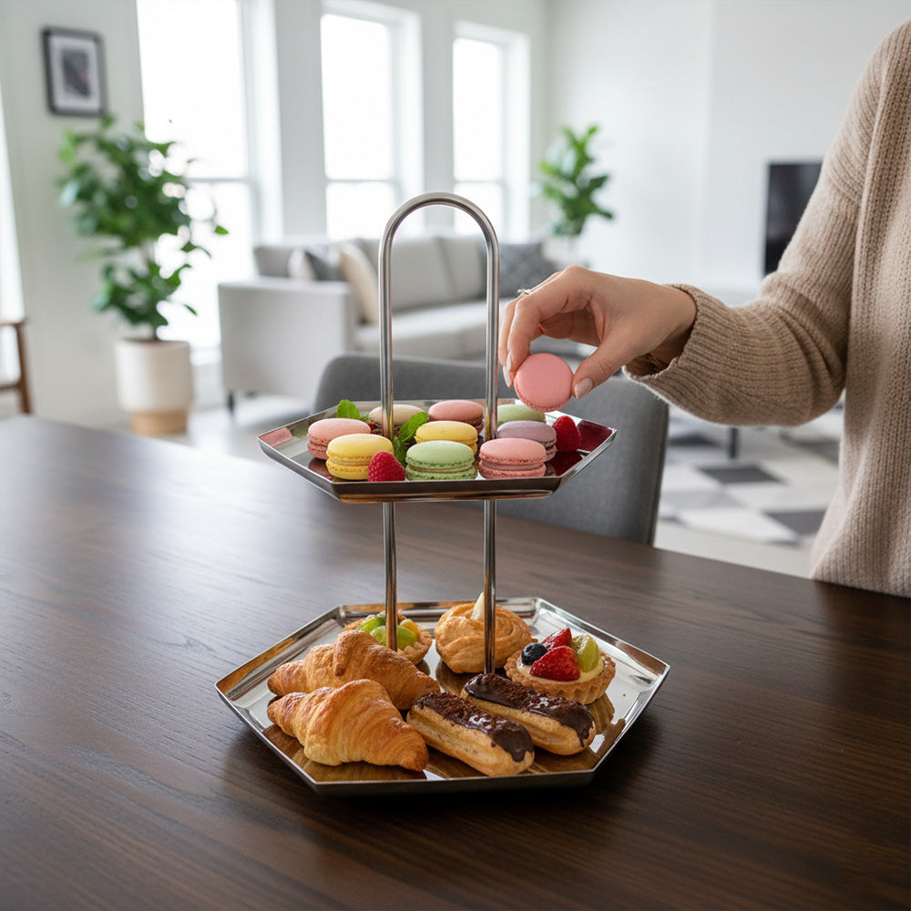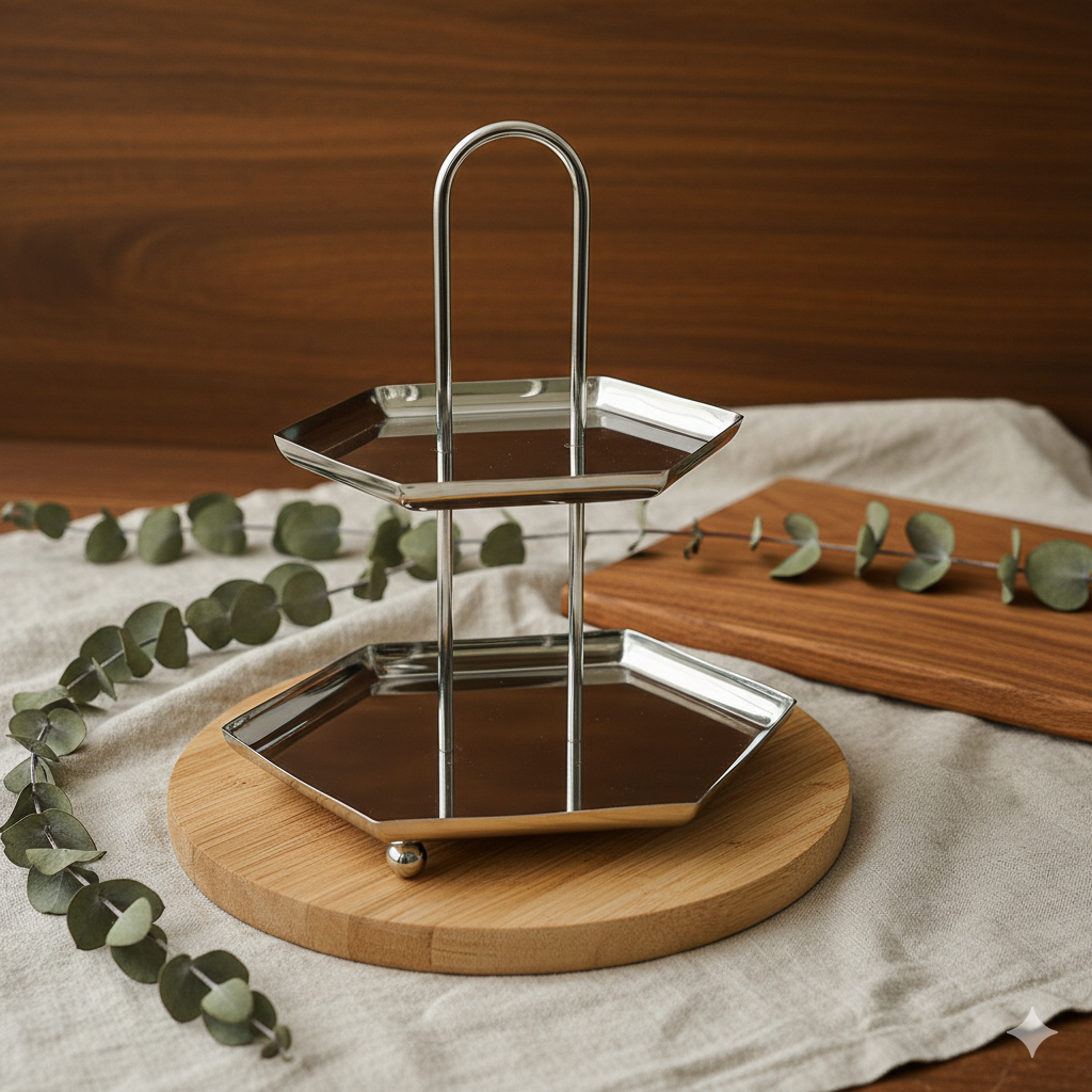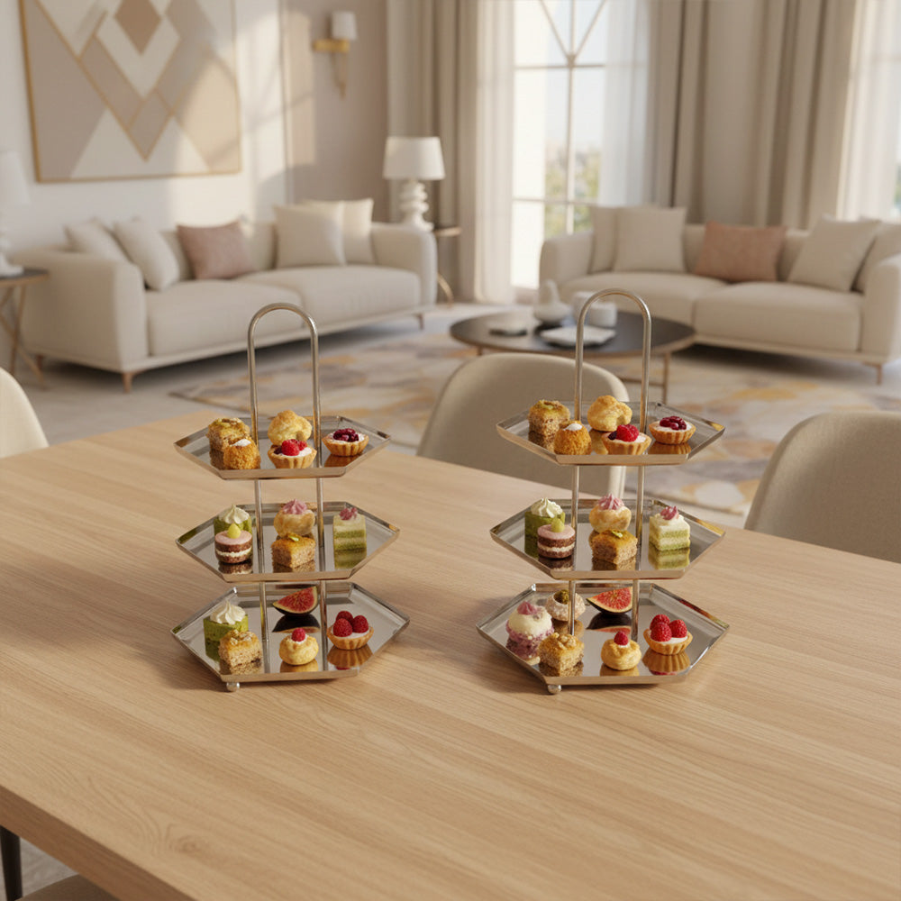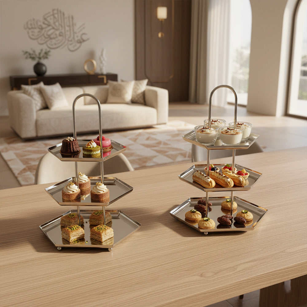أضيفي لمسة فاخرة إلى ضيافتك مع ستاند التقديم المصنوع من الستانلس ستيل اللامع، المصمم بعناية لعرض الحلويات، المعجنات، التمور والفواكه بأسلوب أنيق وعملي.
