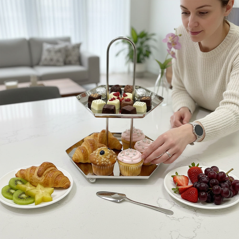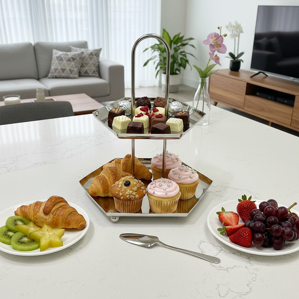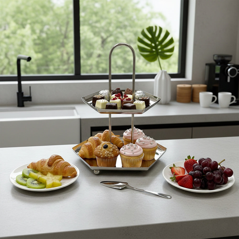 ستاند تقديم حلويات وفواكه ستانلس ستيل فاخر – دورين / ثلاث أدوار – تصميم أنيق بمقبض علوي