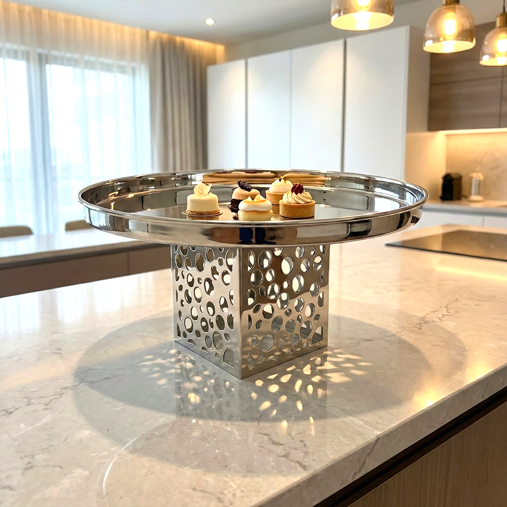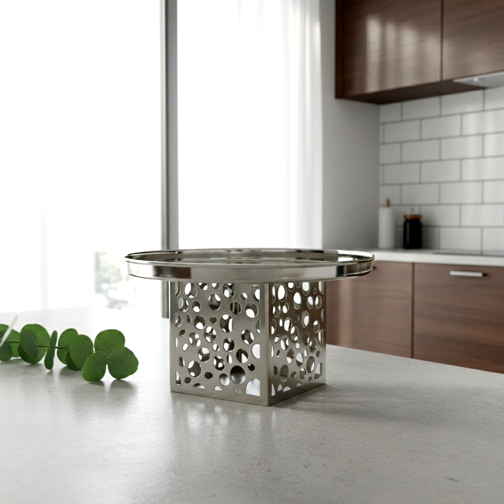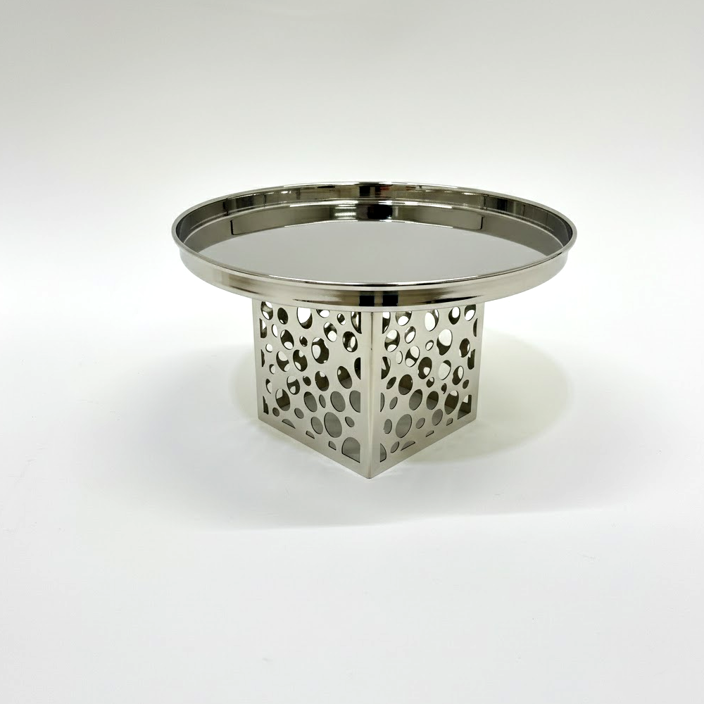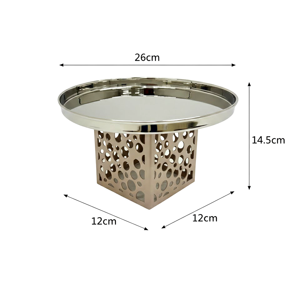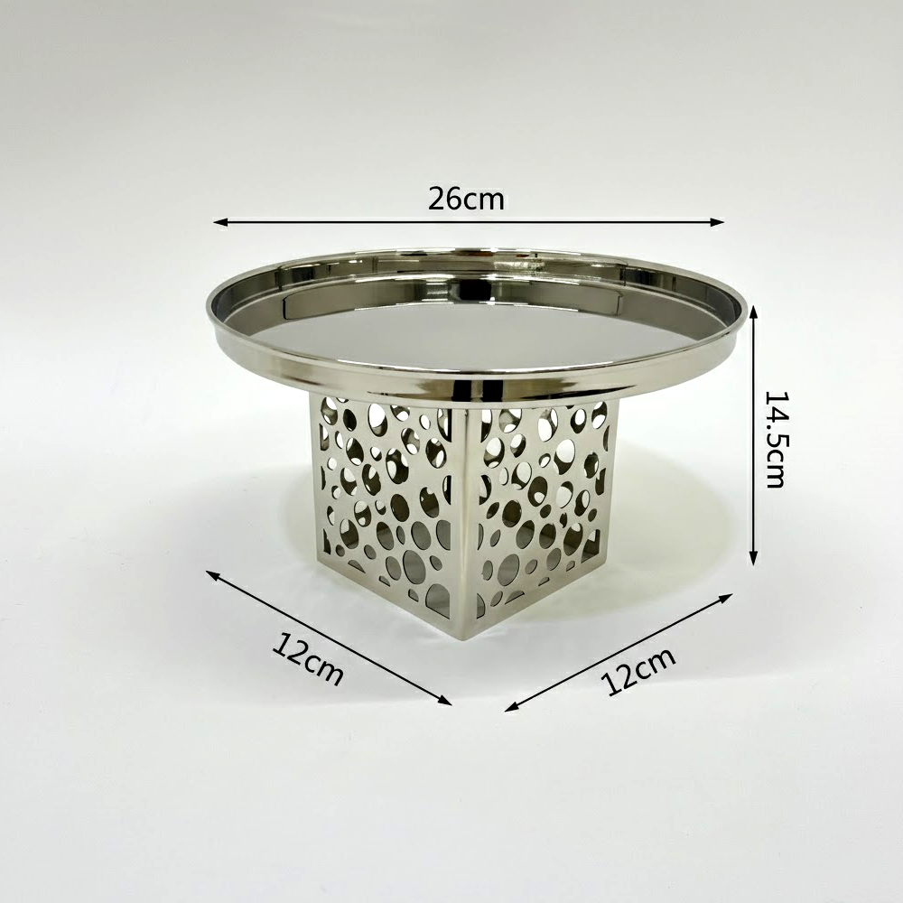 ستاند تقديم كيك وحلويات فاخر من الستانلس ستيل – تصميم مربع أنيق بقاعدة مثقبة (قطر 26 سم)