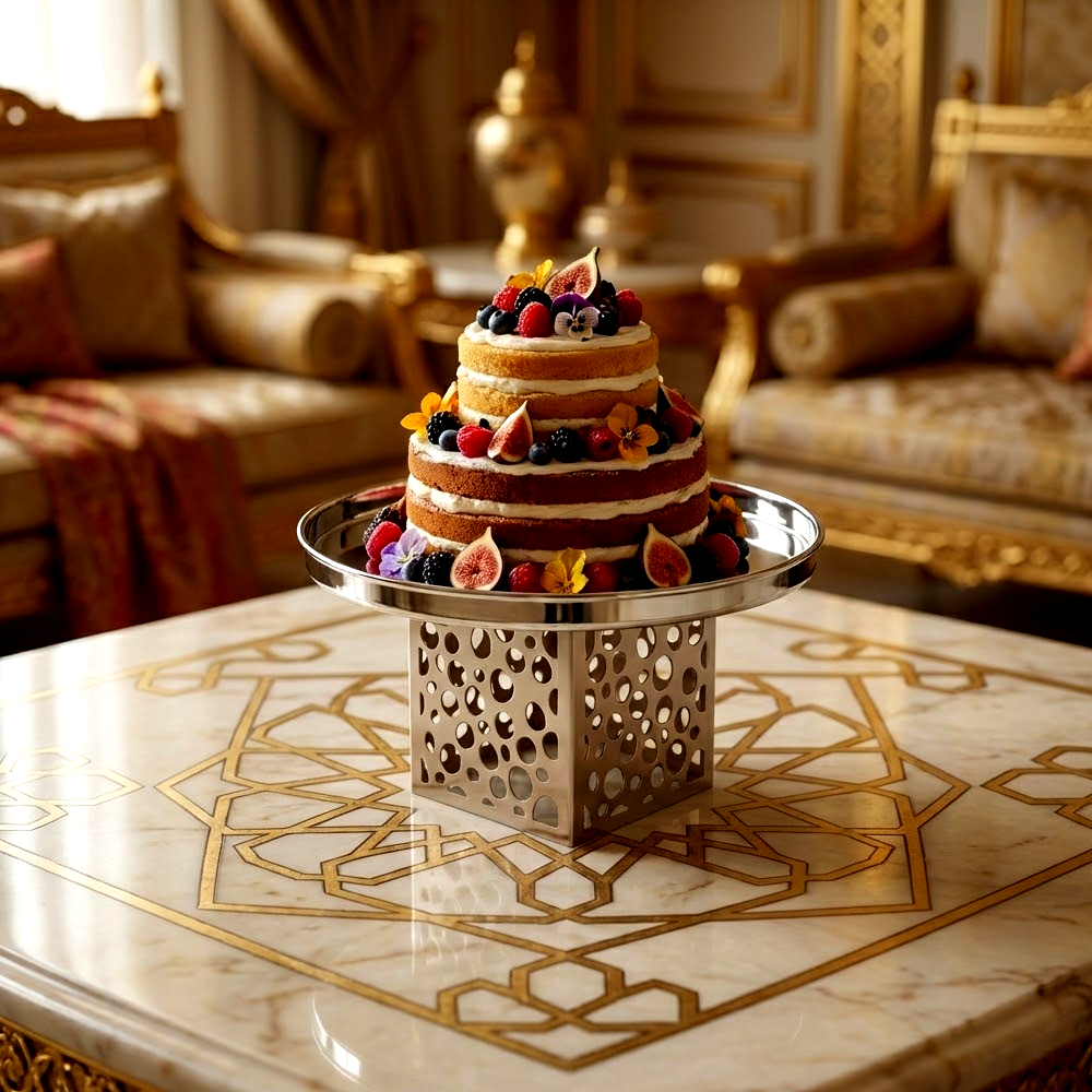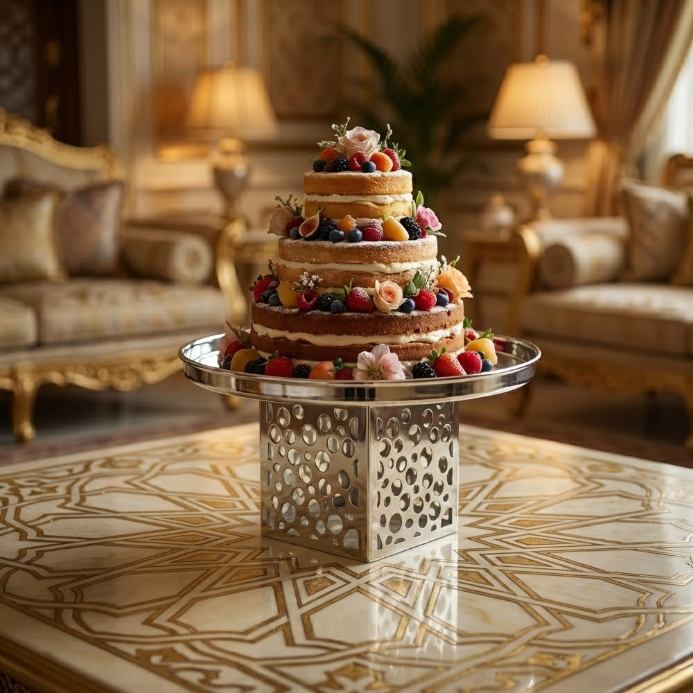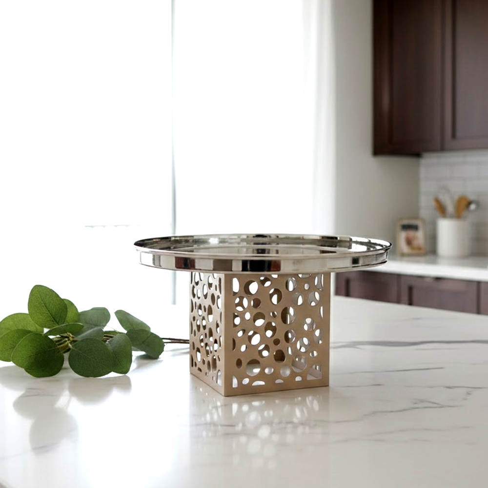 يتميز الستاند بقاعدة مربعة مثقبة بتصميم هندسي أنيق تعكس الضوء بشكل جذاب، مع صينية علوية دائرية بحواف مرتفعة تحافظ على ثبات الكيك أثناء التقديم. مناسب للضيافة في المجالس، السفرة، الحفلات، الأعراس وأعياد الميلاد.