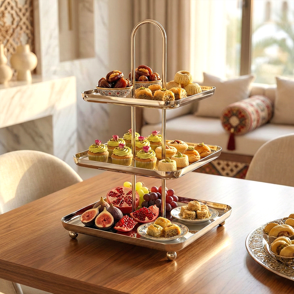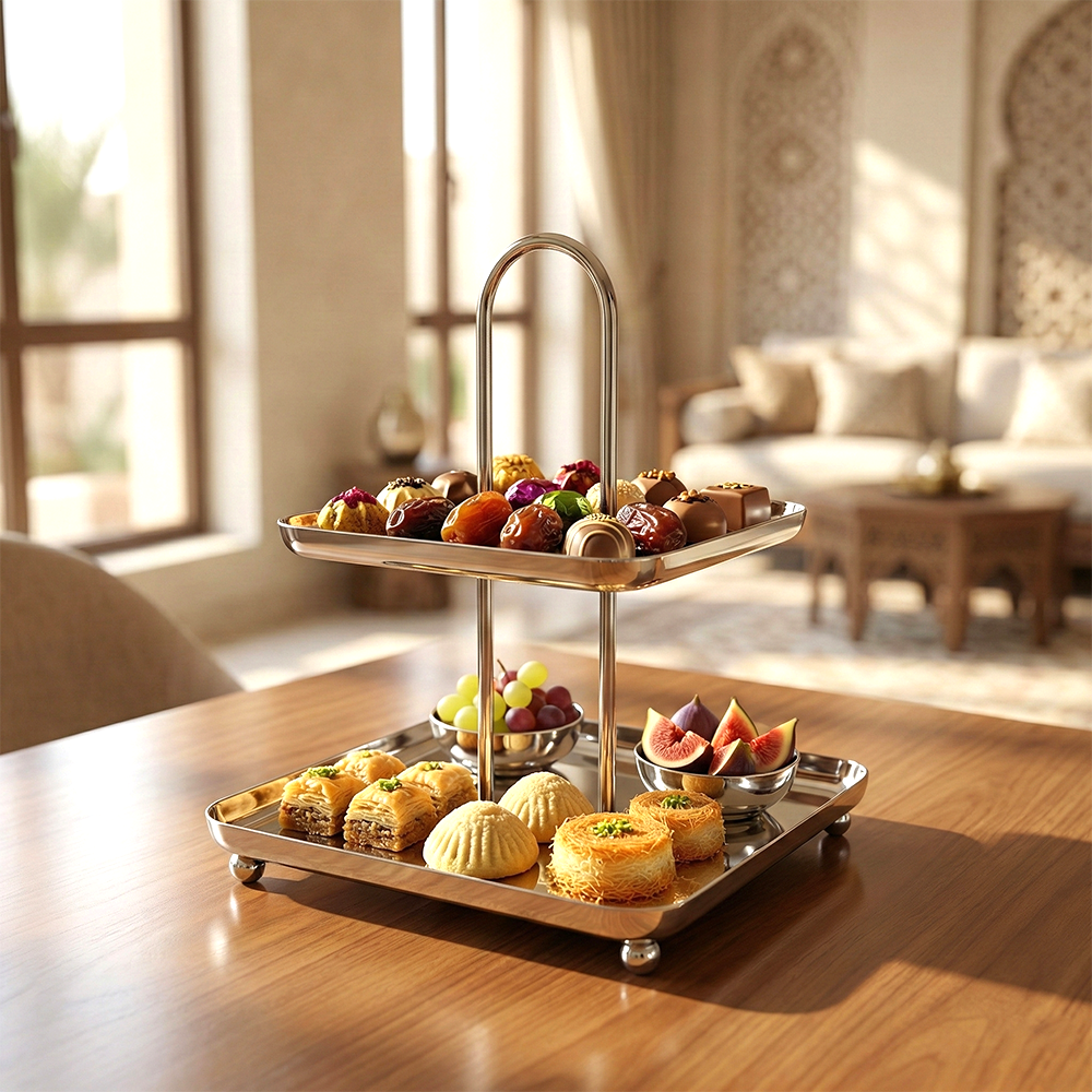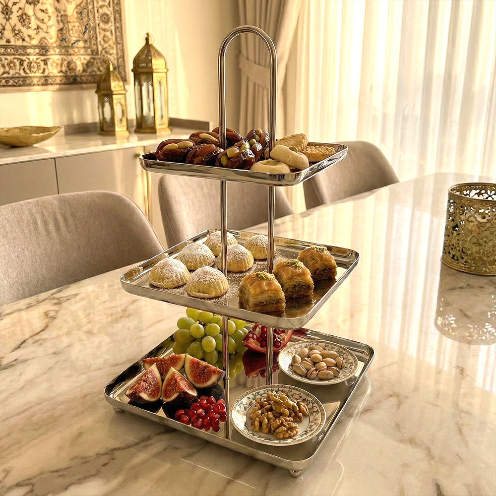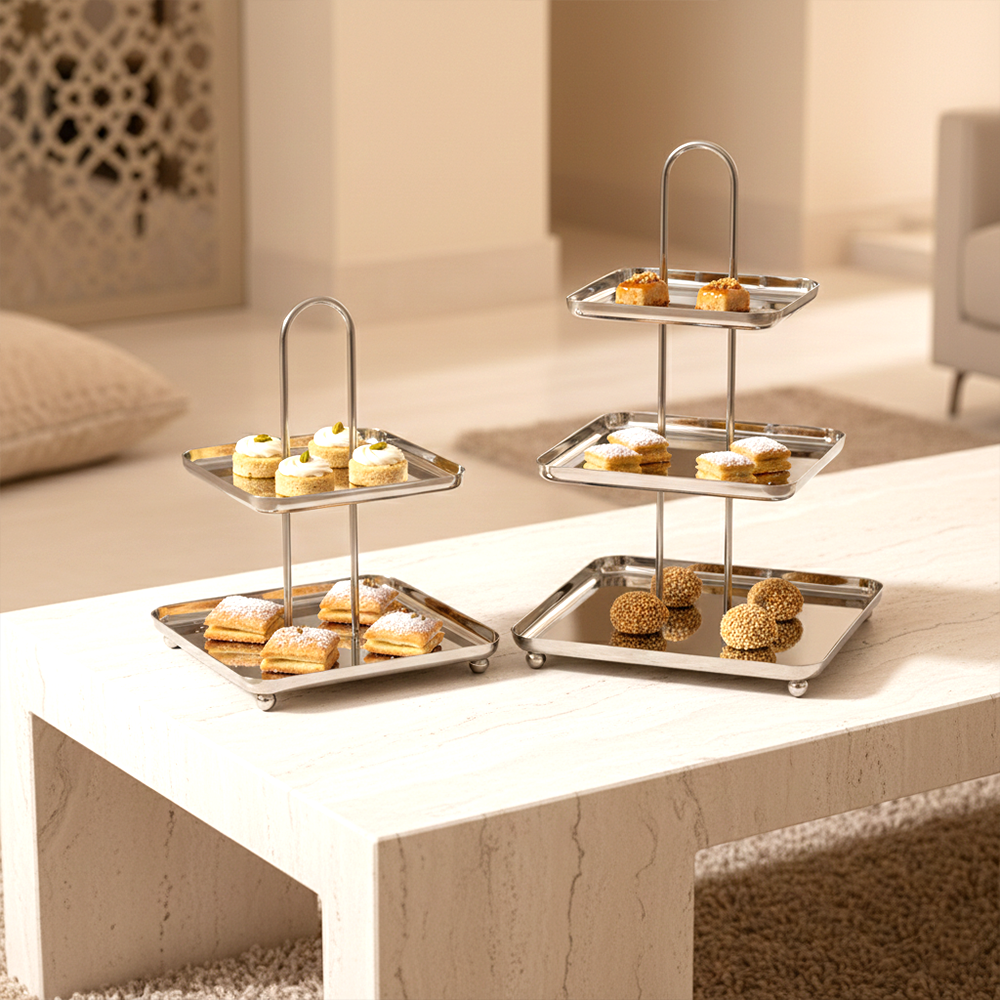 أضيفي لمسة فاخرة إلى ضيافتك مع ستاند التقديم المصنوع من الستانلس ستيل اللامع، المصمم بعناية لعرض الحلويات، المعجنات، التمور والفواكه بأسلوب أنيق وعملي.