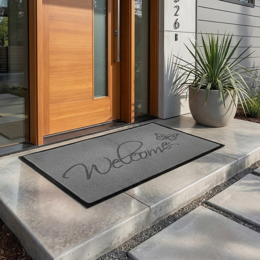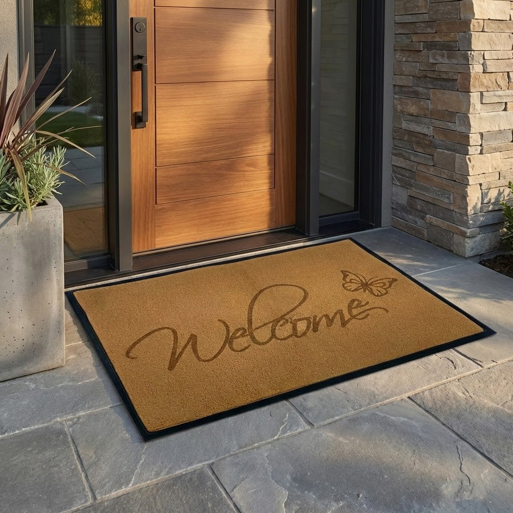 أضف لمسة دافئة إلى مدخل منزلك مع سجادة الباب هذه المزينة بعبارة "مرحباً"، المصممة لإضفاء سحر وجمال على أي مدخل. تتميز السجادة بحروف "مرحباً" الأنيقة مع تفاصيل فراشة رقيقة، وهي مثالية للمنازل والمكاتب والشقق.