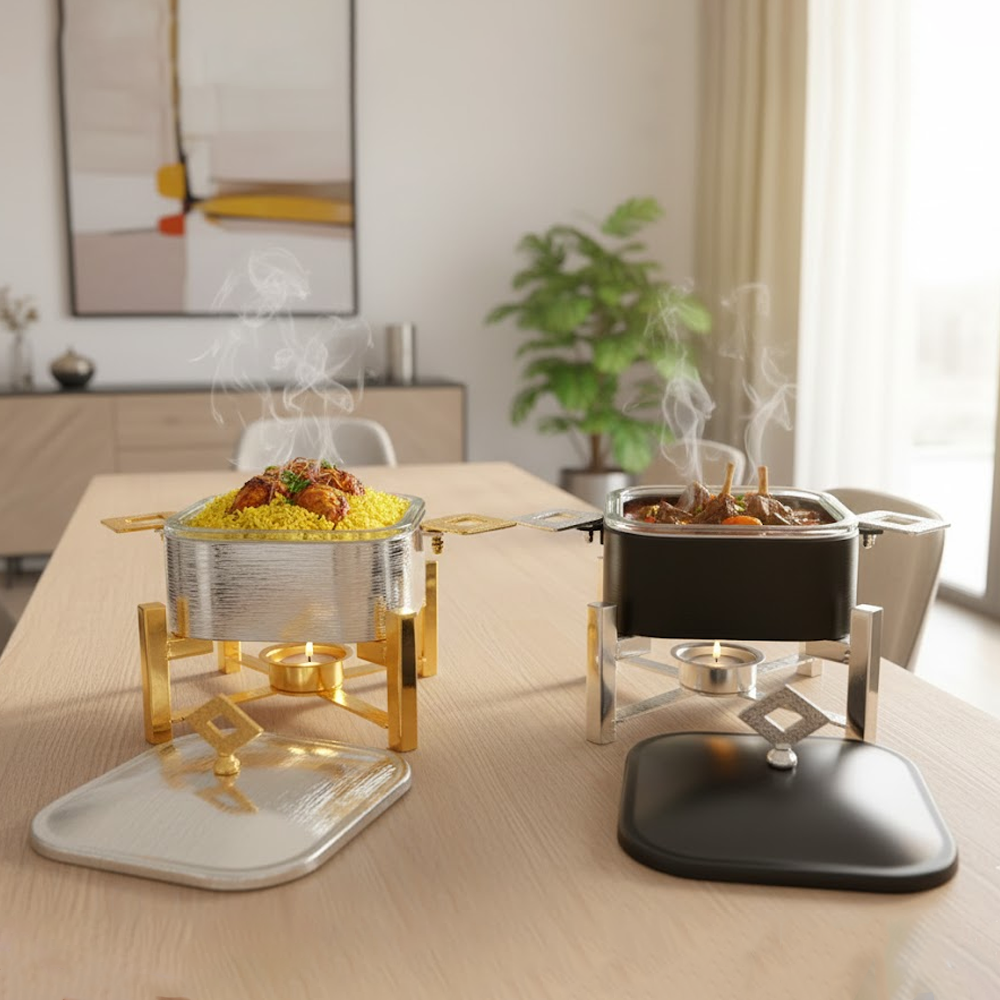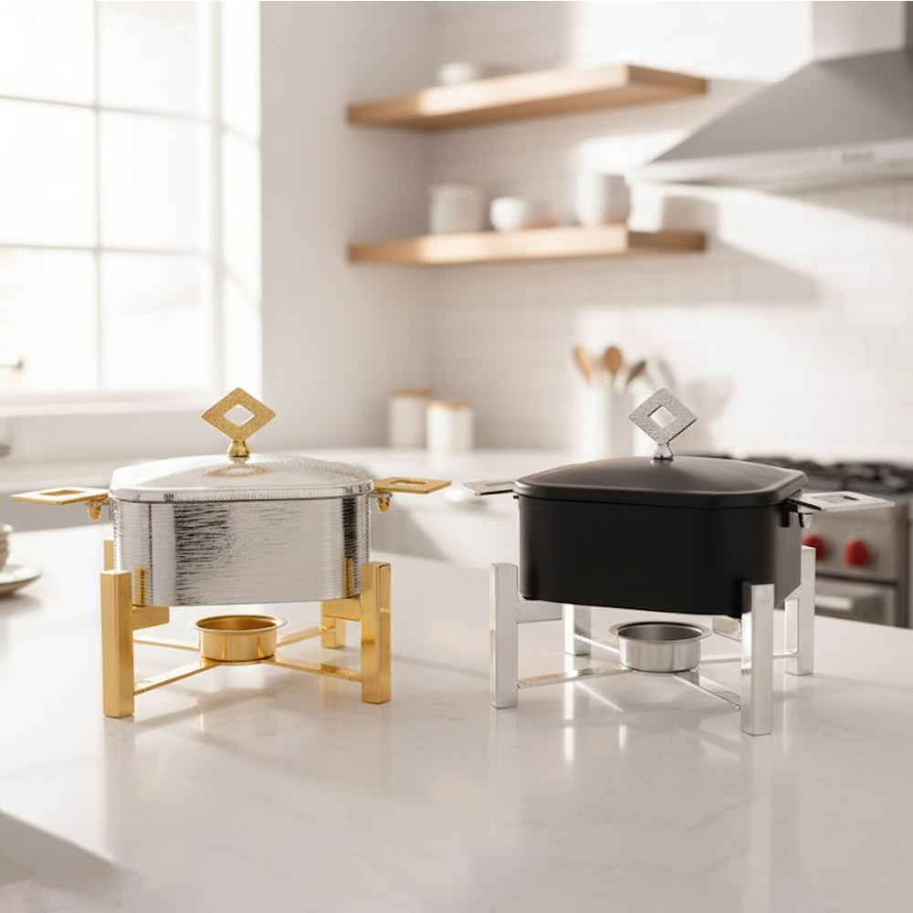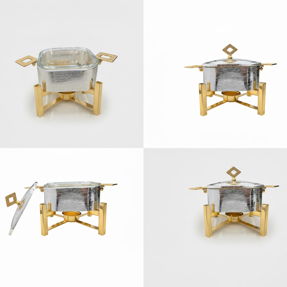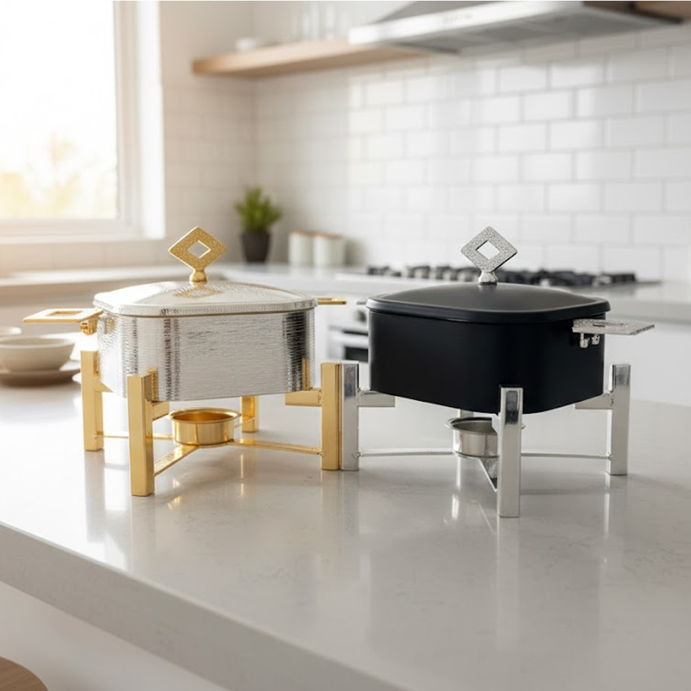 أضِف لمسة فخامة إلى مائدتك مع سخان تقديم الطعام المربع بتصميم عصري يجمع بين الأناقة والعملية. مثالي لتقديم الأرز، اليخنات، اللحوم، والأطباق الساخنة في العزائم والمناسبات الخاصة. يحافظ على حرارة الطعام لفترة أطول باستخدام نظام التسخين بالشمعة، مع هيكل متين وتشطيب فاخر يناسب جميع أنماط الديكور.