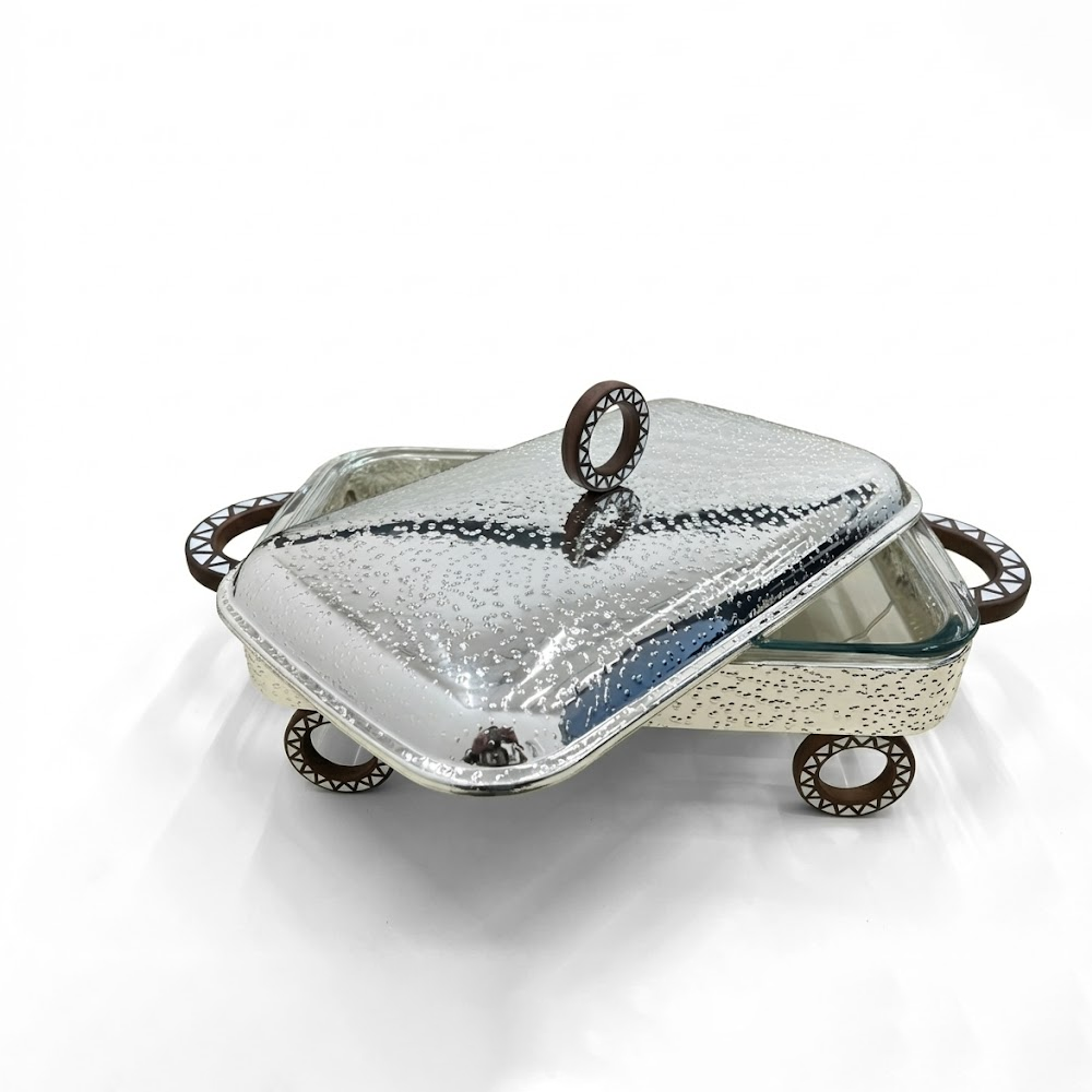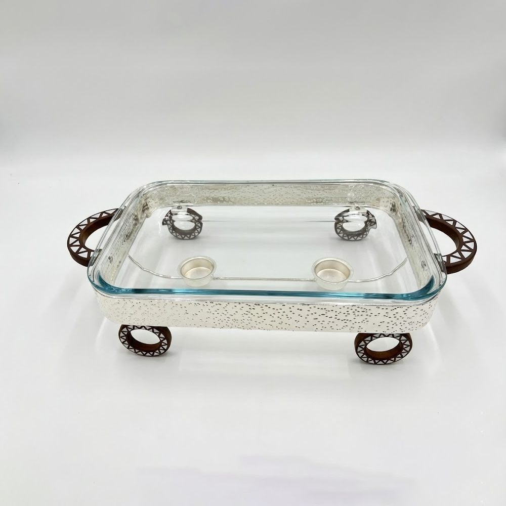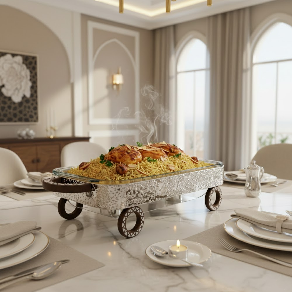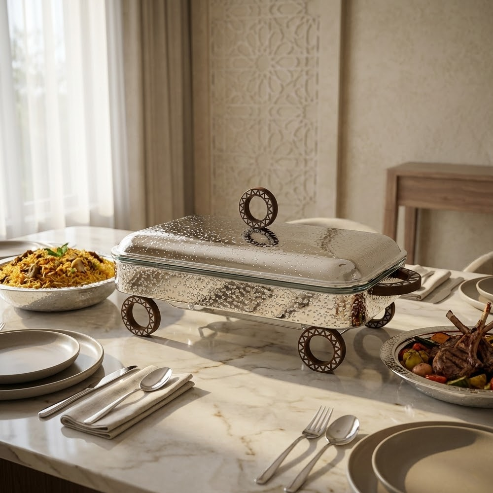 يأتي السخان بغطاء زجاجي شفاف عالي الجودة يسمح برؤية الطعام بوضوح دون الحاجة لفتح الغطاء، مما يساعد على الحفاظ على حرارة الطعام ونكهته لفترة أطول. يعمل بنظام الشموع السفلية لتسخين الطعام بشكل متوازن ومناسب للتقديم في العزائم والمناسبات.