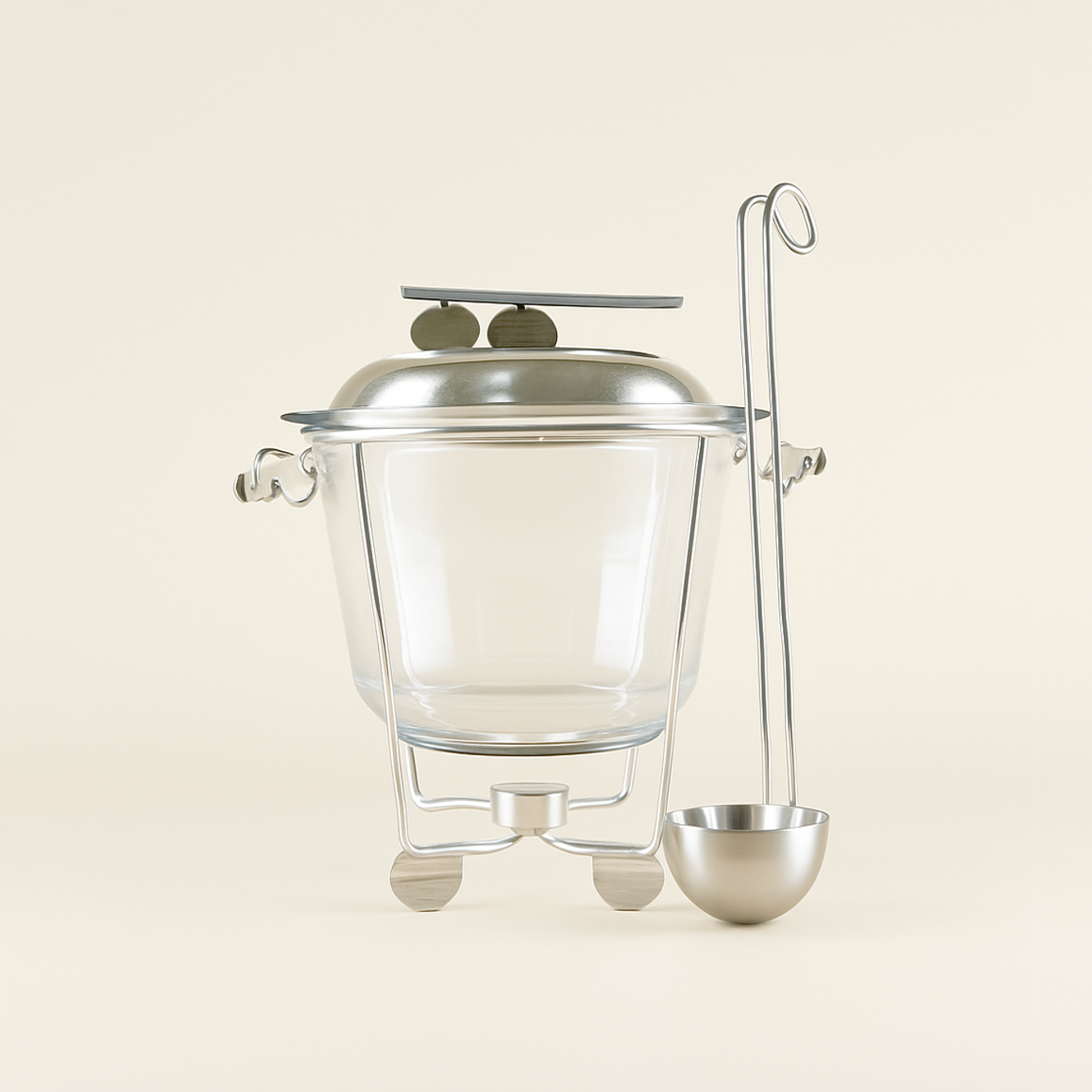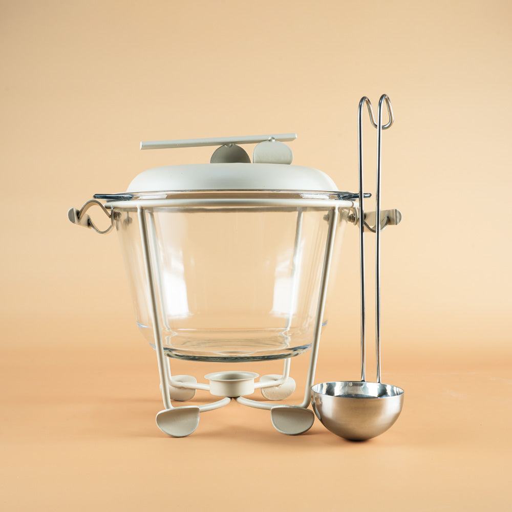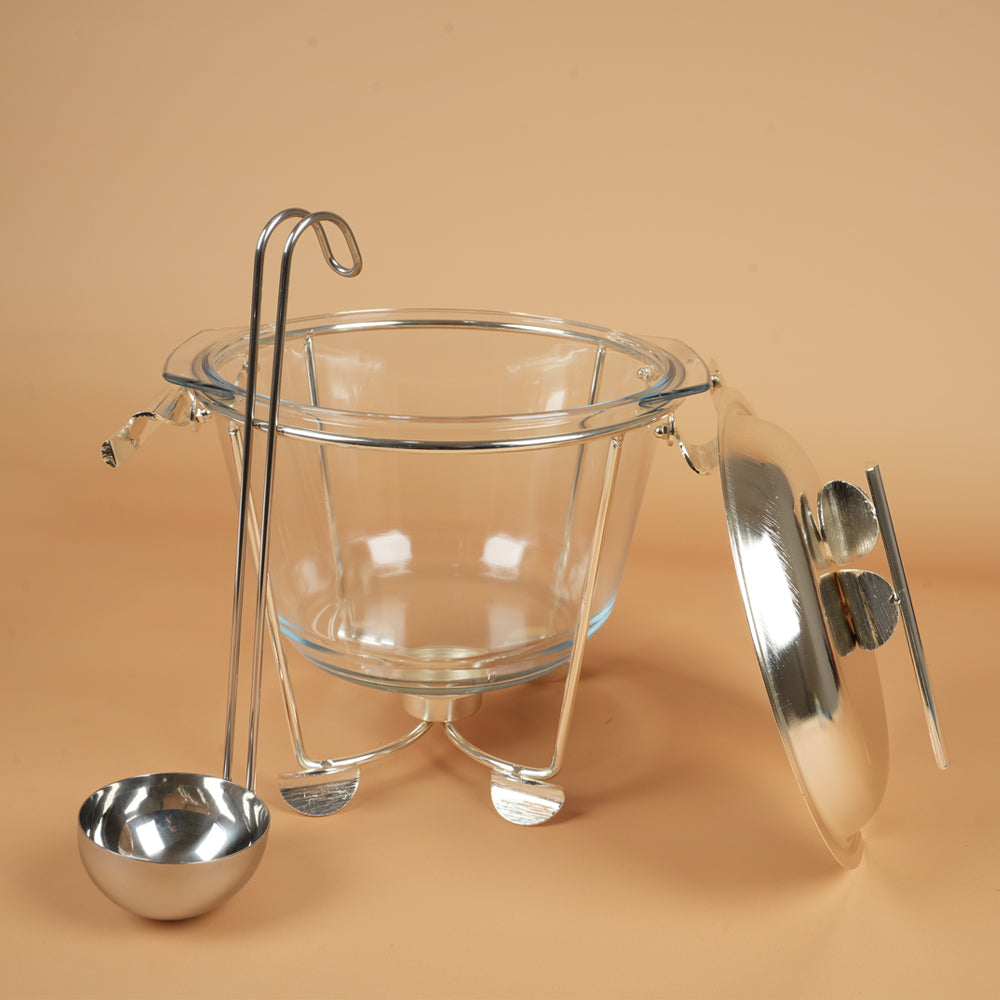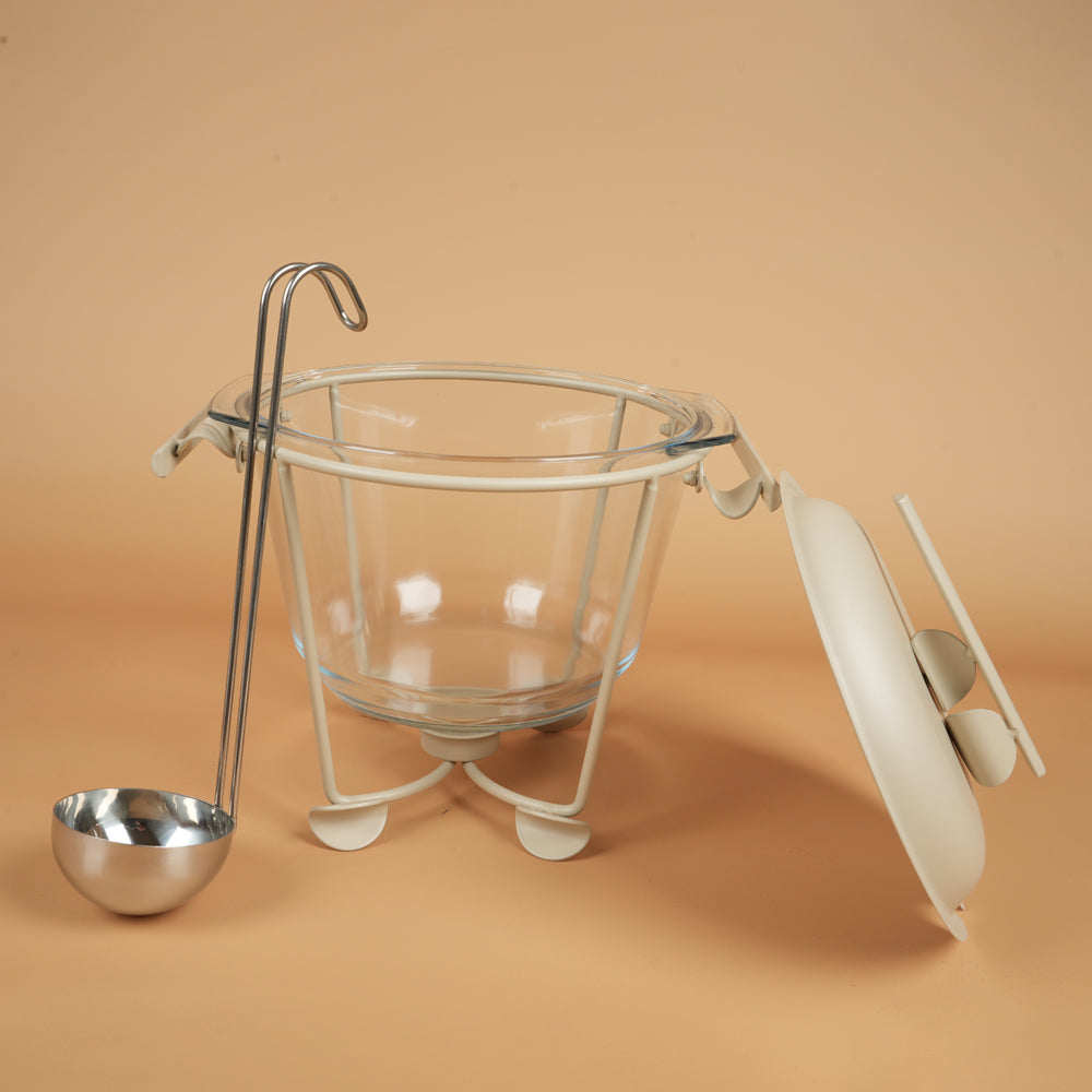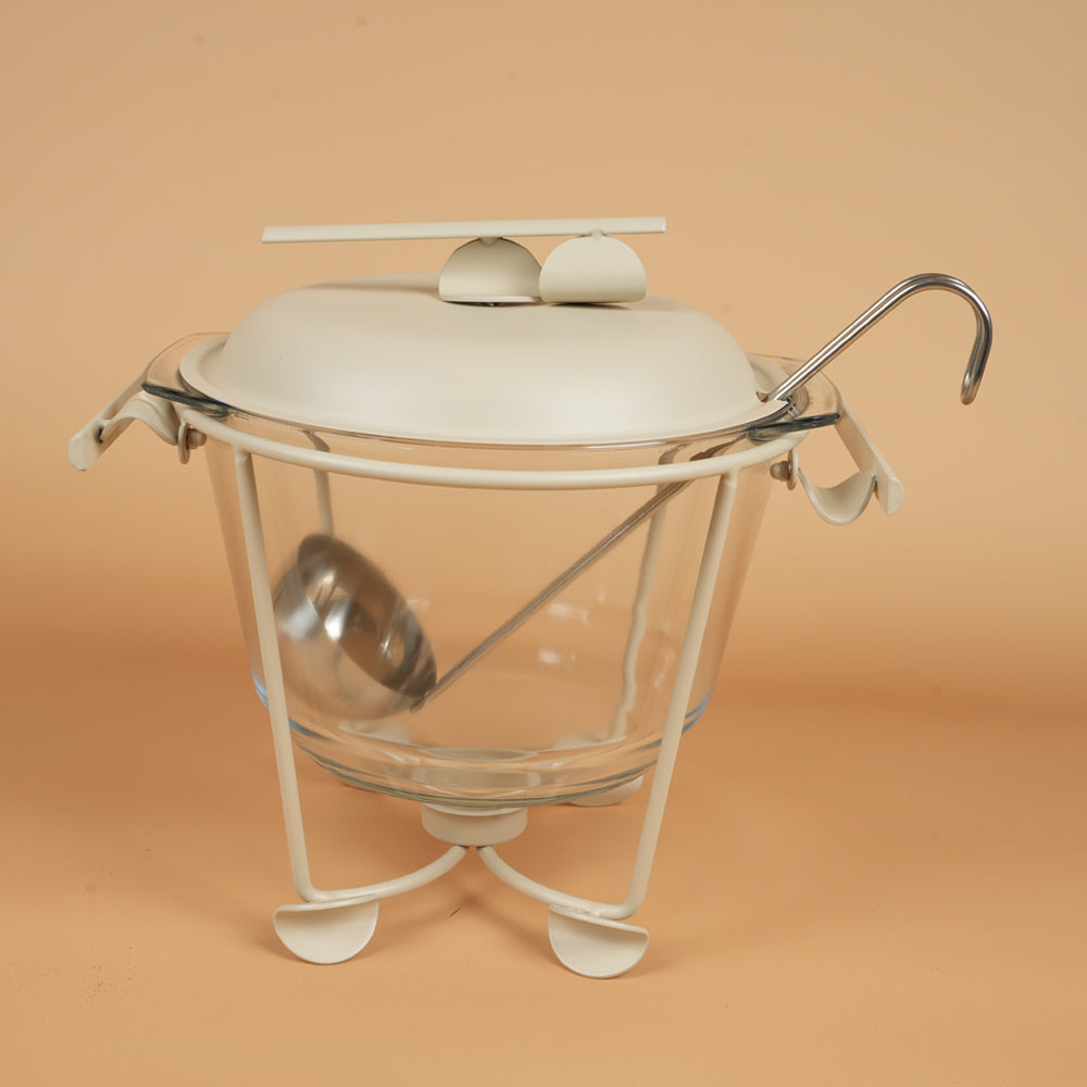 المقاوم للصدأ مع طبق زجاجي مقاوم للحرارة يتكون المجموعة من طبق زجاج حرارى وقاعدة وهيكل خارجى من الاستيل المعالج ضد الصدا مع غطاء ومغرفة من الاستالس