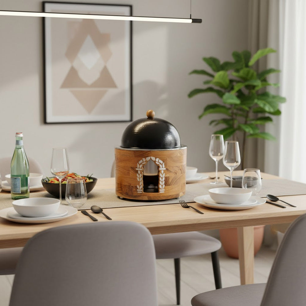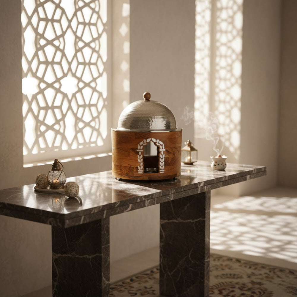 هذا السخان الغذائي بسعة 5 لترات هو حلٌّ فاخر لتقديم الطعام، مصمم للحفاظ على دفئه مع إضفاء لمسة جمالية على المائدة. يتميز بهيكل خارجي متين من الخشب، مع فتحة مقوسة أنيقة للوصول إلى الموقد، بالإضافة إلى غطاء معدني مقبب يوفر احتفاظًا ممتازًا بالحرارة ومظهرًا فاخرًا.