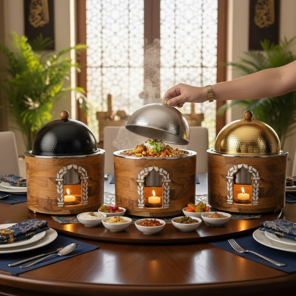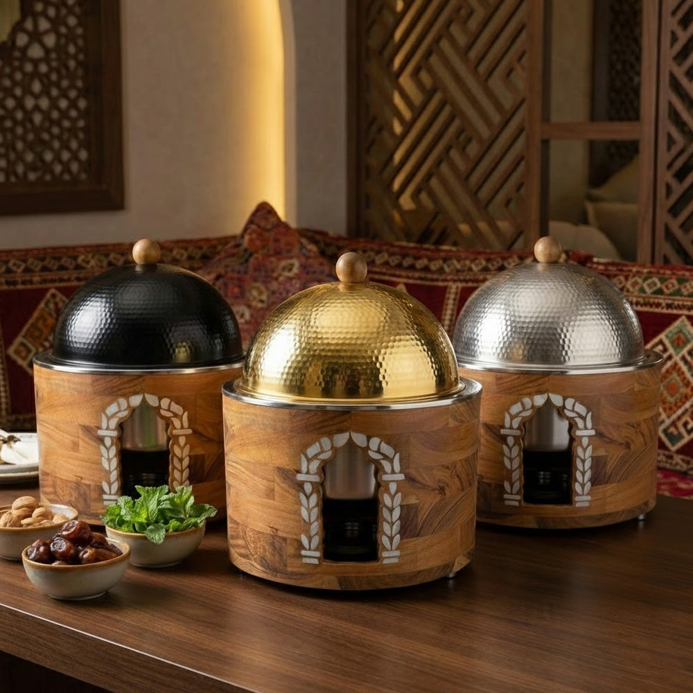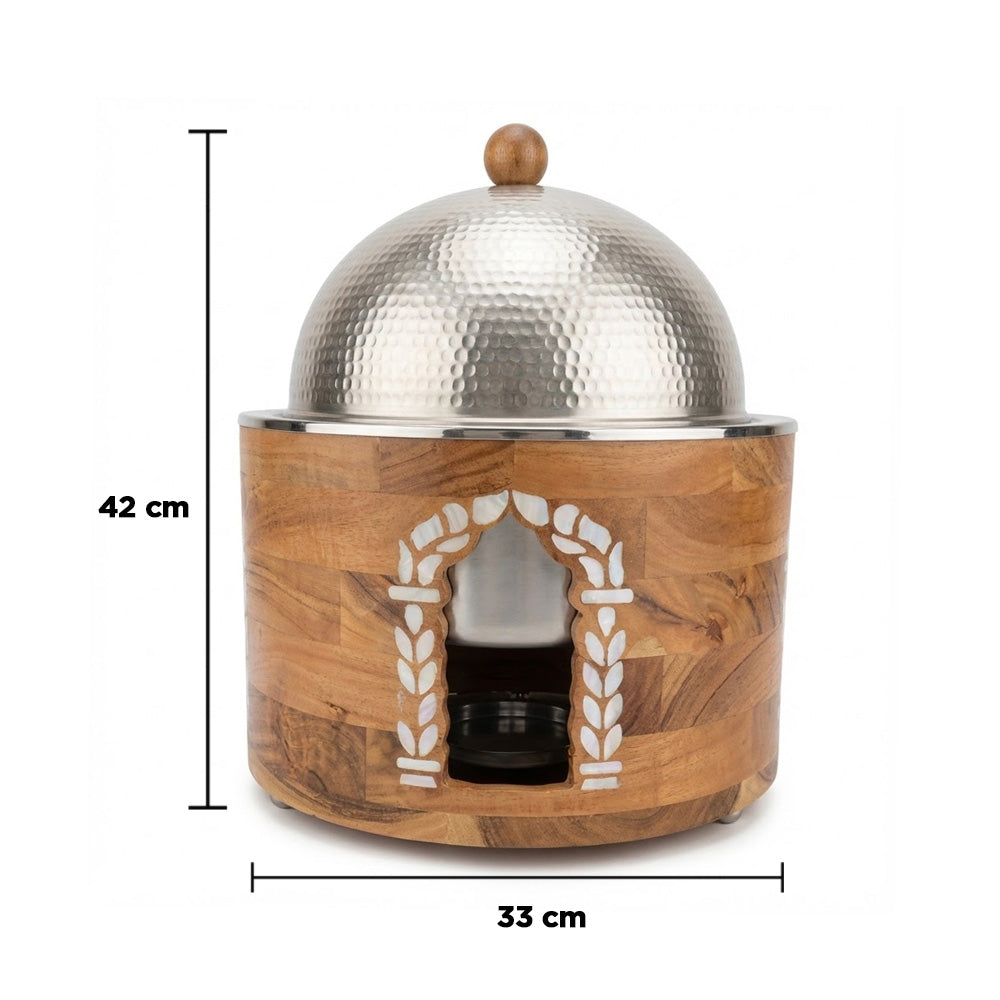 يسمح التصميم الدائري بتوزيع متساوٍ للحرارة، بينما يحافظ وعاء الوقود الأمامي على دفء الأطباق لفترات طويلة. يحتوي الغطاء المقبب على مقبض خشبي لسهولة الاستخدام وأمانه. مزيجه الأنيق من الخشب الطبيعي والتشطيبات المعدنية يجعله مثاليًا للبوفيهات والفنادق والمطاعم وفعاليات تقديم الطعام والمناسبات المنزلية الراقية.