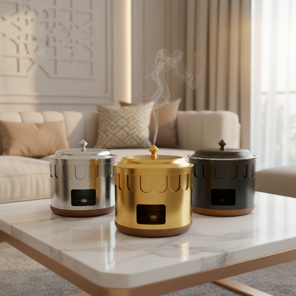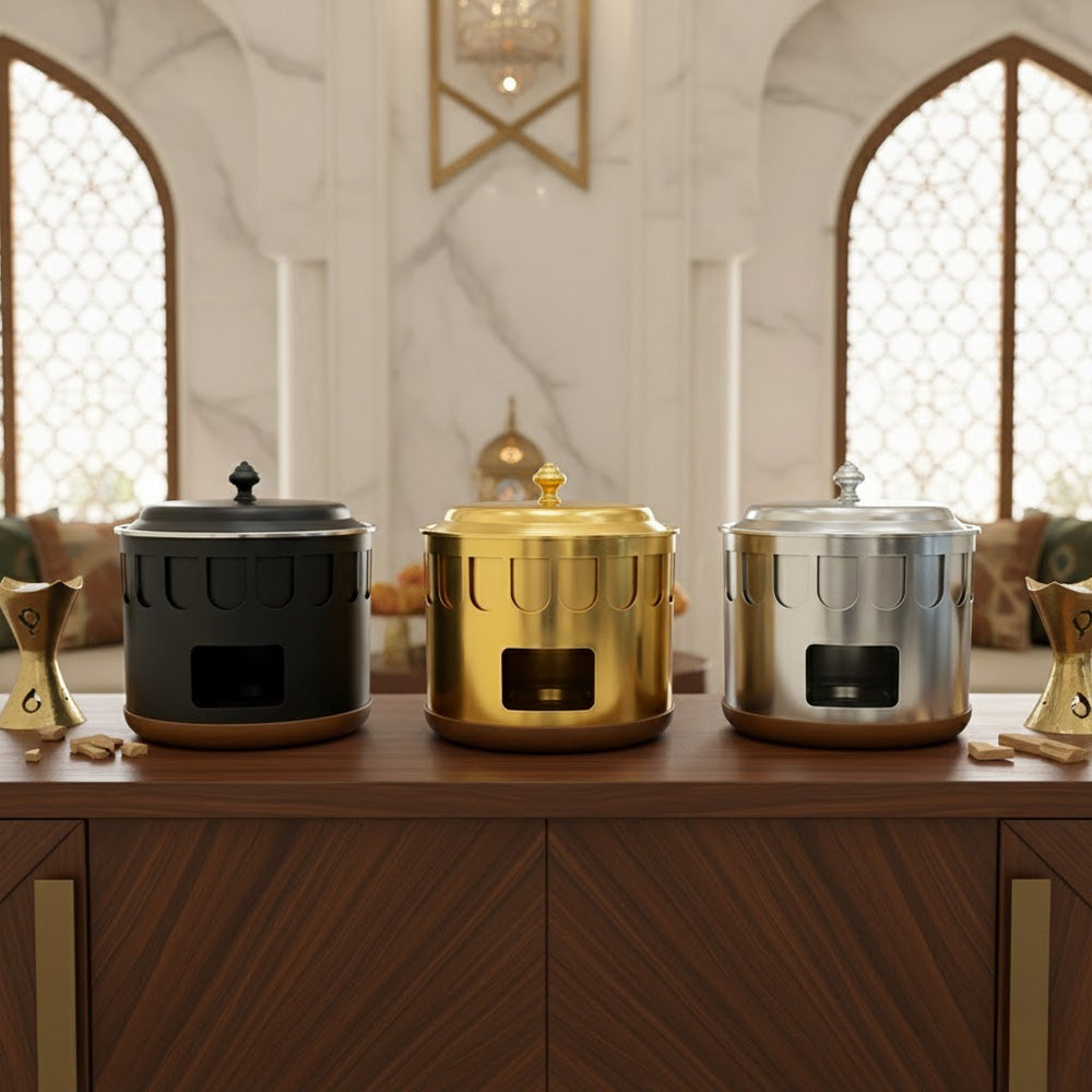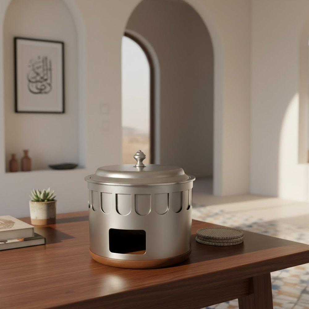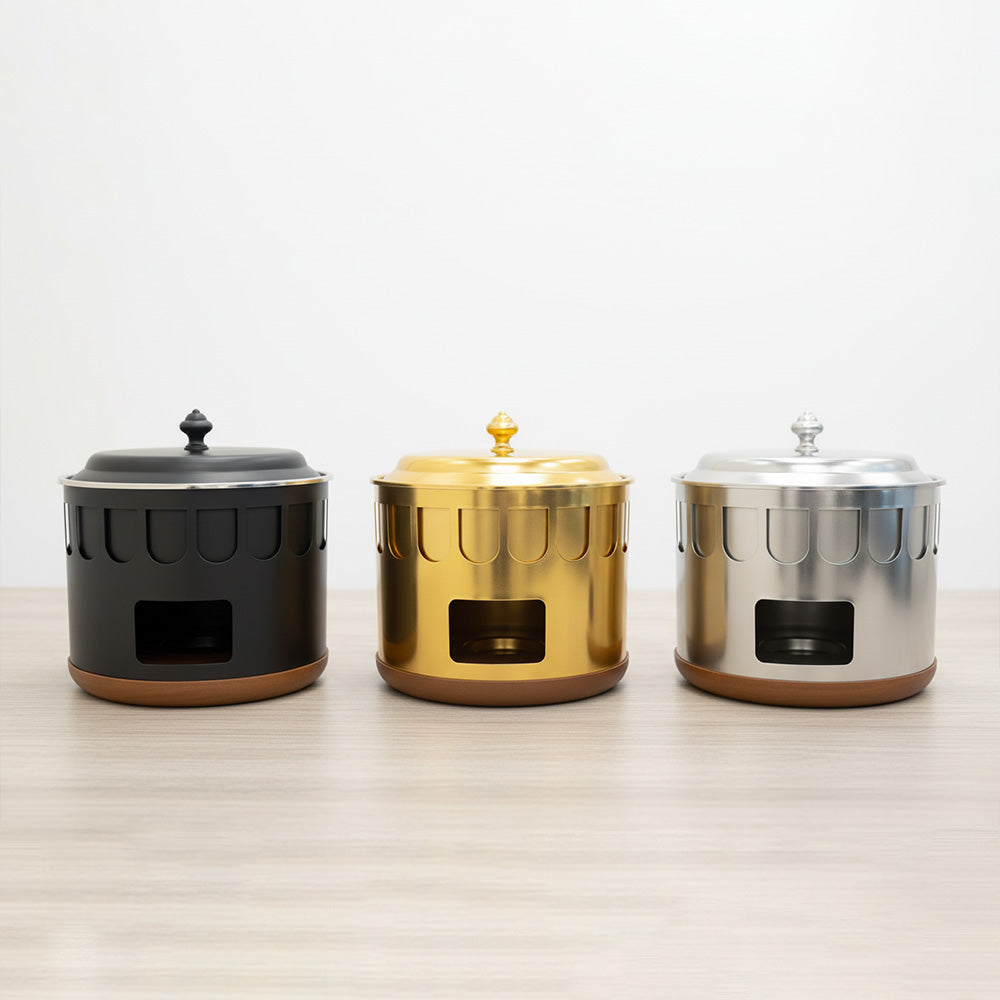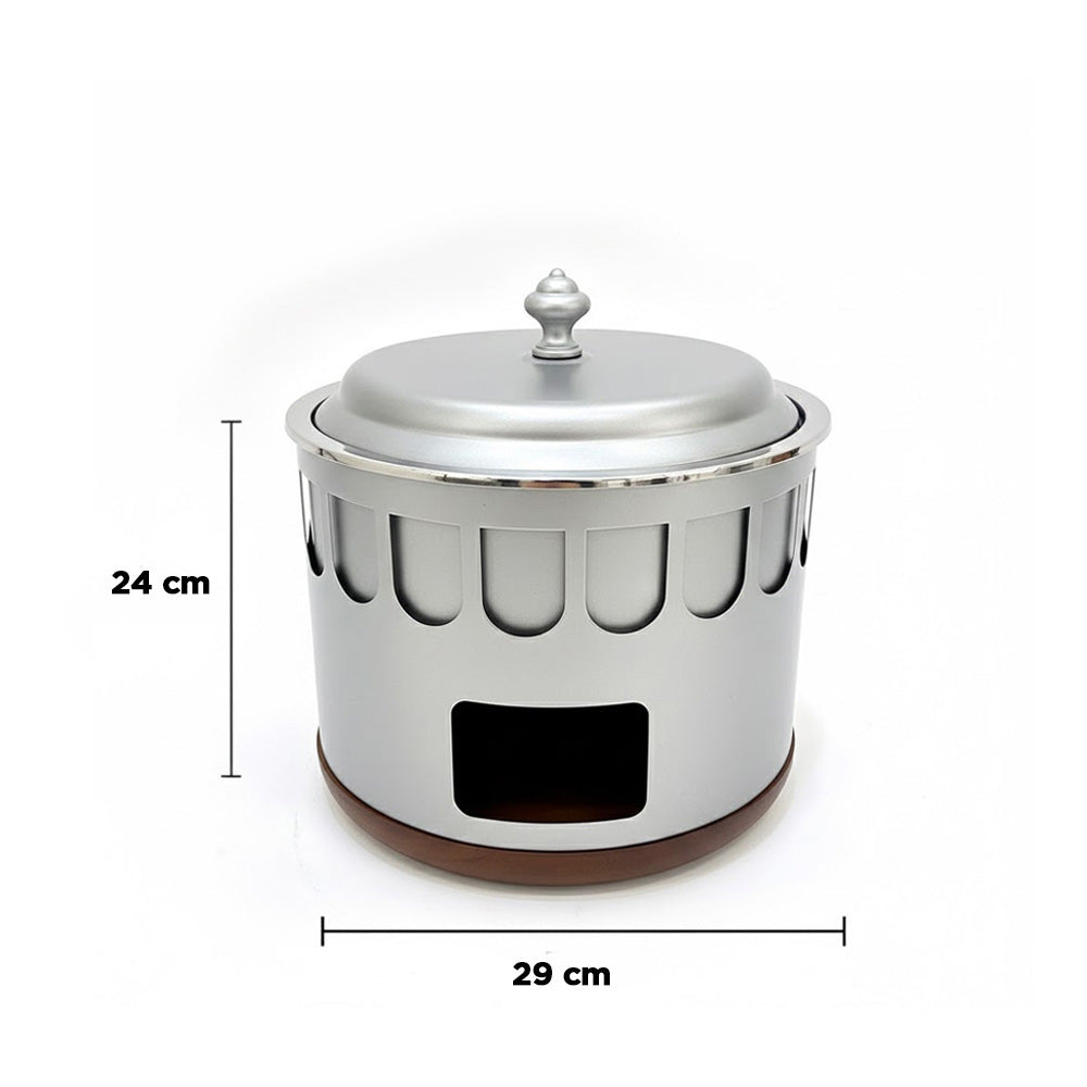 يتميز السخان بهيكل معدني متين مطلي بطبقة مقاومة للحرارة، وقاعدة خشبية تضفي عليه مزيدًا من الأناقة والثبات. تسمح الفتحة الأمامية بوضع موقد أو أي مصدر حرارة آخر للحفاظ على درجة حرارة ثابتة. تساعد فتحات التهوية حول الهيكل على توزيع الحرارة بالتساوي، مما يضمن بقاء الطعام دافئًا دون ارتفاع درجة حرارته.