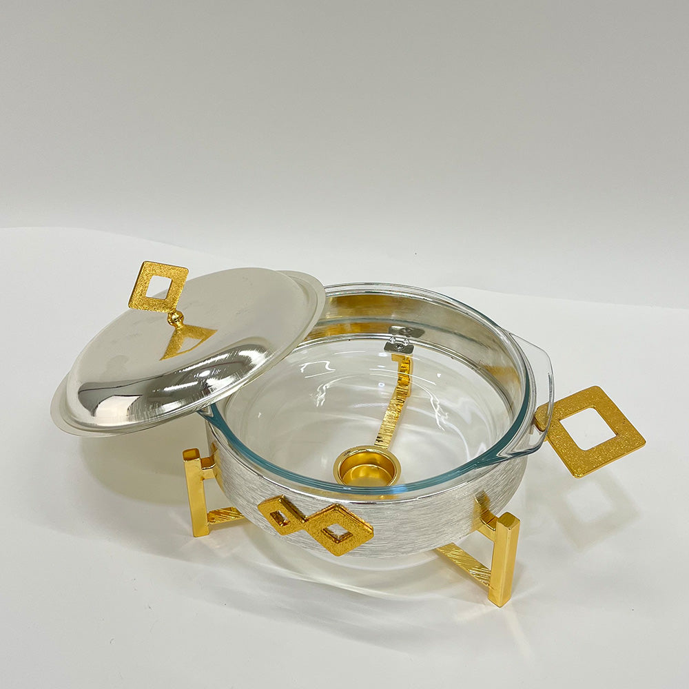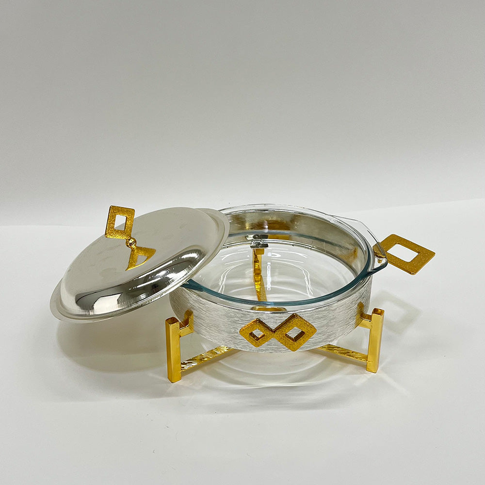 الفضي اللامع والذهبي: وعاء خارجي من الستانلس ستيل المصقول بلمسة مرآة عاكسة، مع قاعدة ومقابض وتفاصيل ذهبية فاخرة تمنحه إشراقة كلاسيكية غنية.