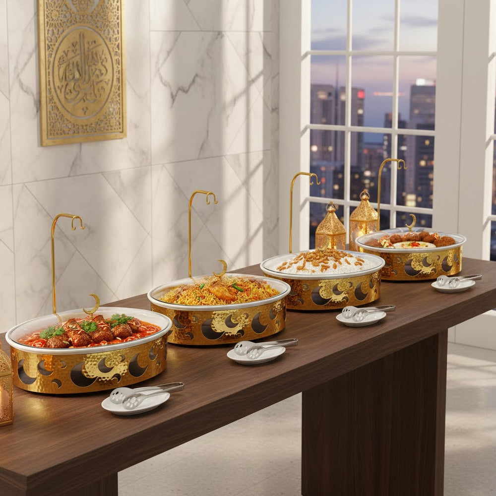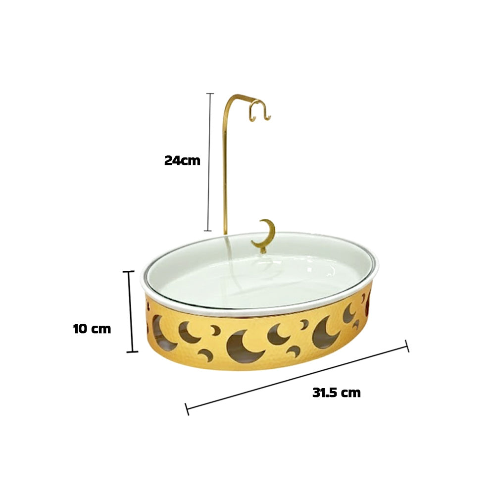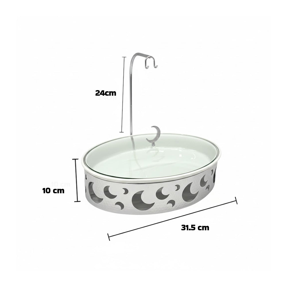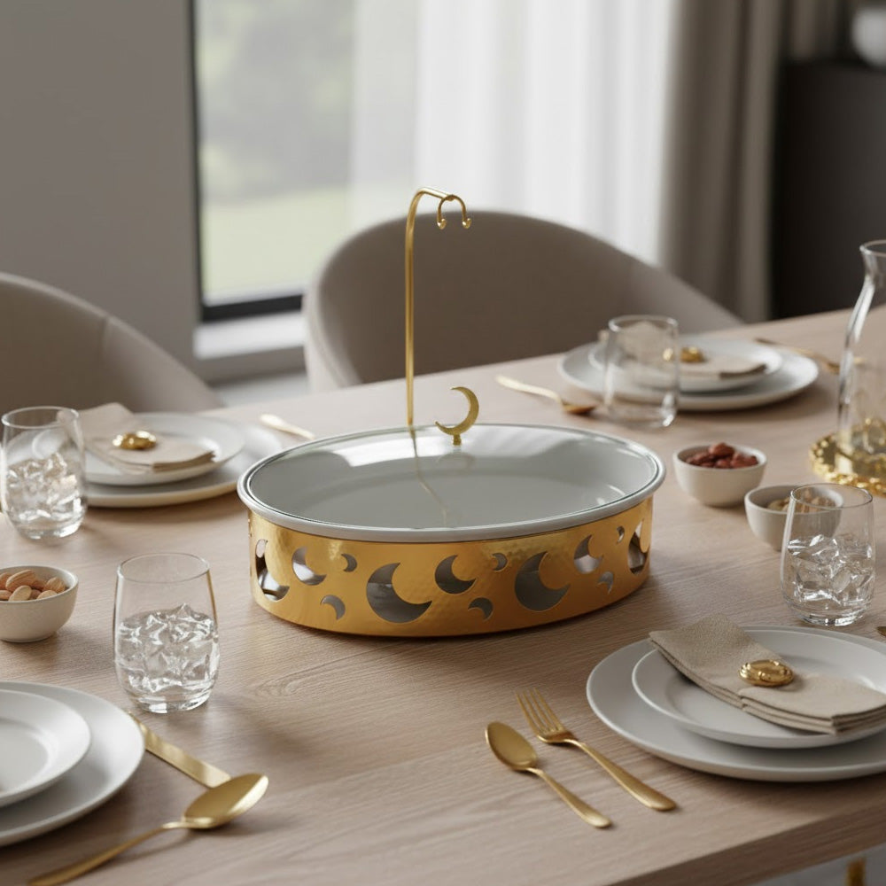 يسمح تصميم الخطاف بتعليق السخان بإحكام فوق مصدر حرارة، مما يضمن توزيعًا متساويًا للحرارة. سعته المدمجة والواسعة في الوقت نفسه (2.5 لتر) مثالية لتقديم الكاري، والأرز، والشوربات، والصلصات، والأطباق الجانبية. تضفي الفتحات المزخرفة بنقوش الهلال مظهرًا عصريًا فاخرًا، مثاليًا للمناسبات الخاصة وبوفيهات الطعام.