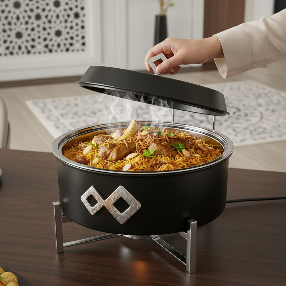 أضيفي لمسة من الفخامة والتميز إلى مائدتك مع سخان الطعام الدائري المودرن بسعة 8 لتر. صُمم هذا السخان خصيصاً ليجمع بين الأناقة العصرية والاحتياجات العملية للعزائم الكبيرة، مما يجعله القطعة الأبرز في بوفيه منزلك.