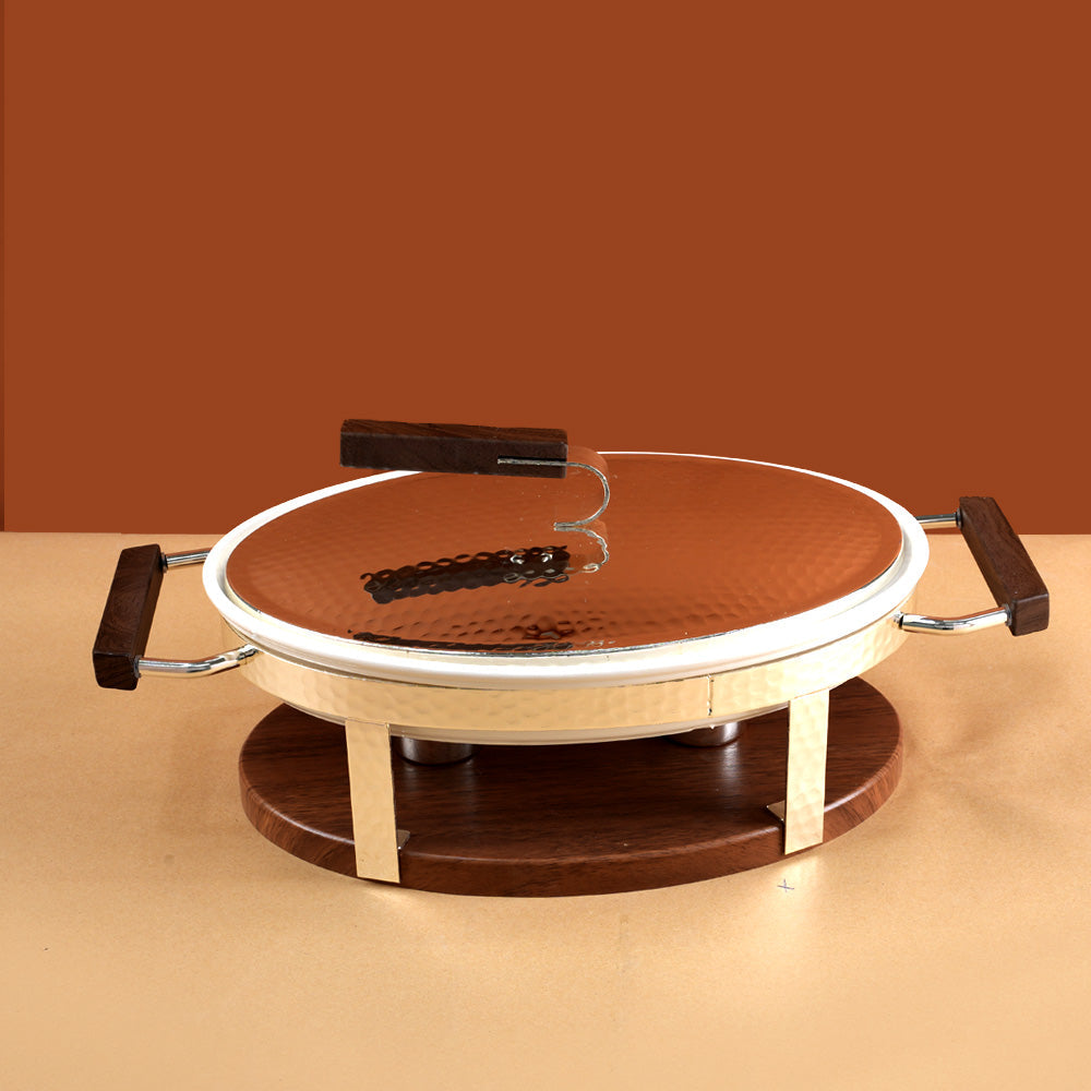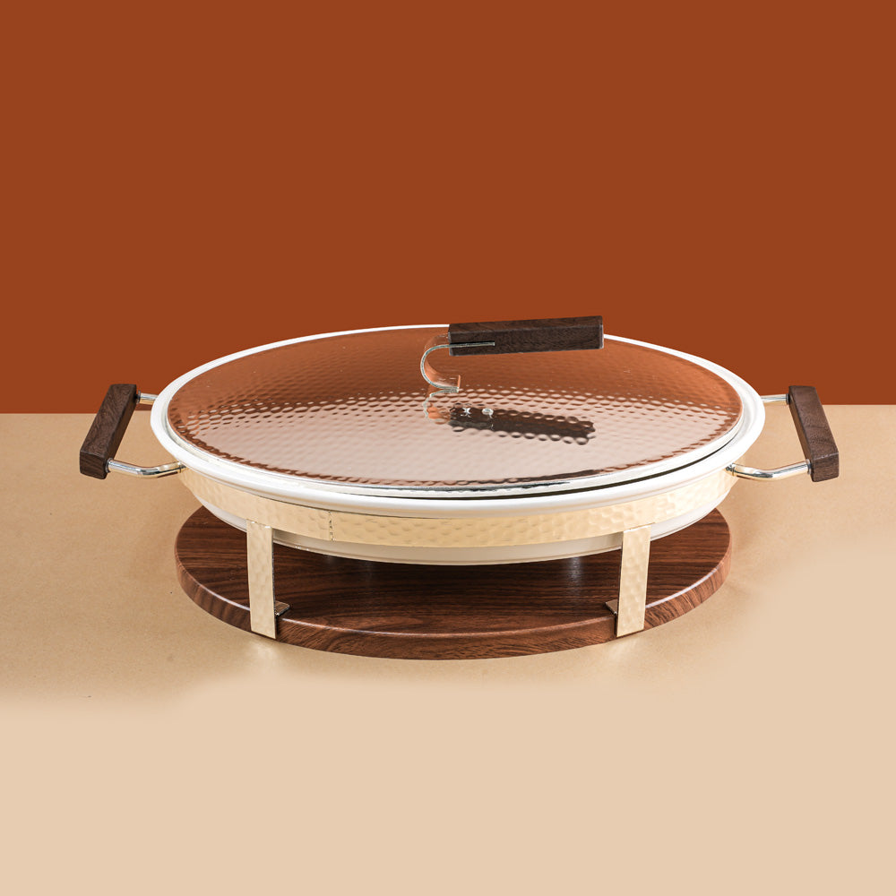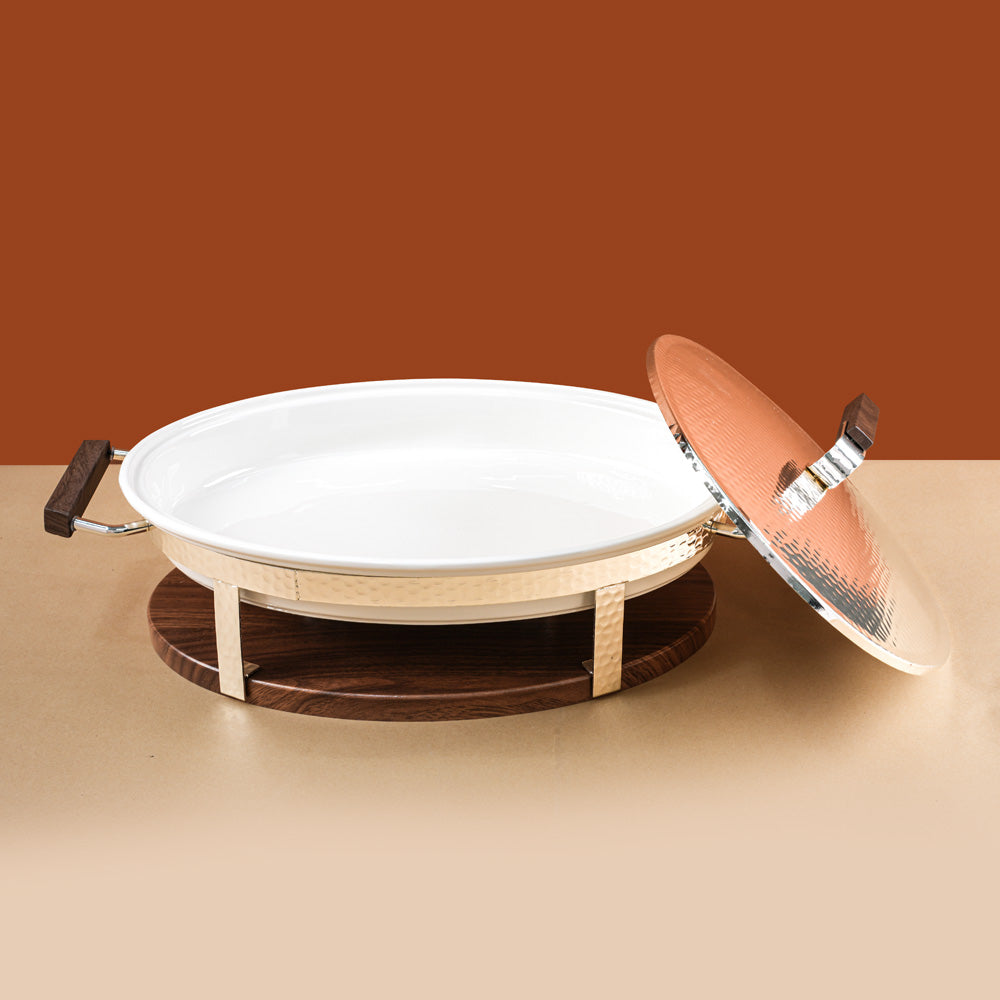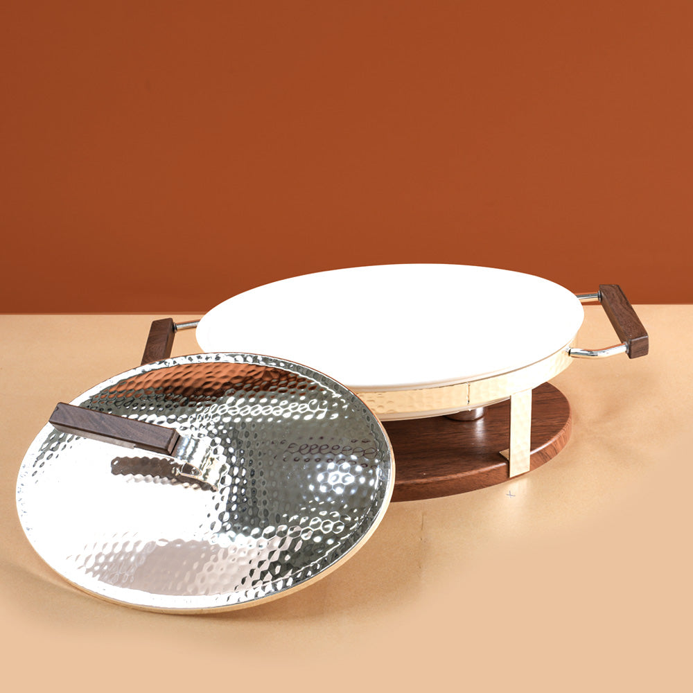 هو سخان طعام سيراميك بتصميم أنيق يجمع بين المعدن وقاعدة لونها خشبى مزود بمقبض خشبى لسهوله الفتح والاغلاق ويحتوي على موضع مخصص لوضع شمعة أو مصدر حرارة للحفاظ على الطعام دافئًا