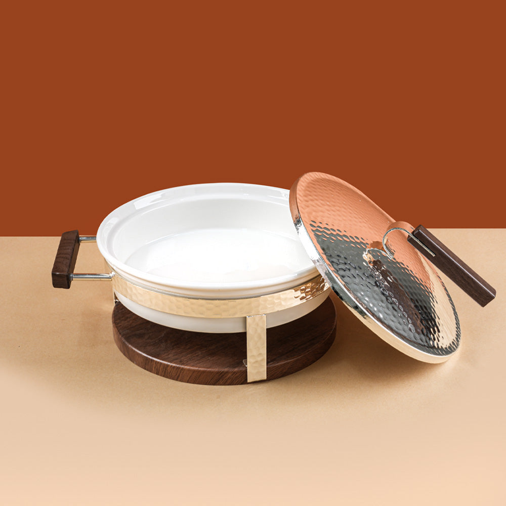 هو سخان طعام صحن سيراميك بتصميم أنيق يجمع بين المعدن وقاعدة لونها خشبى مزود بمقبض خشبى لسهوله الفتح والاغلاق ويحتوي على موضع مخصص لوضع شمعة أو مصدر حرارة للحفاظ على الطعام دافئًا