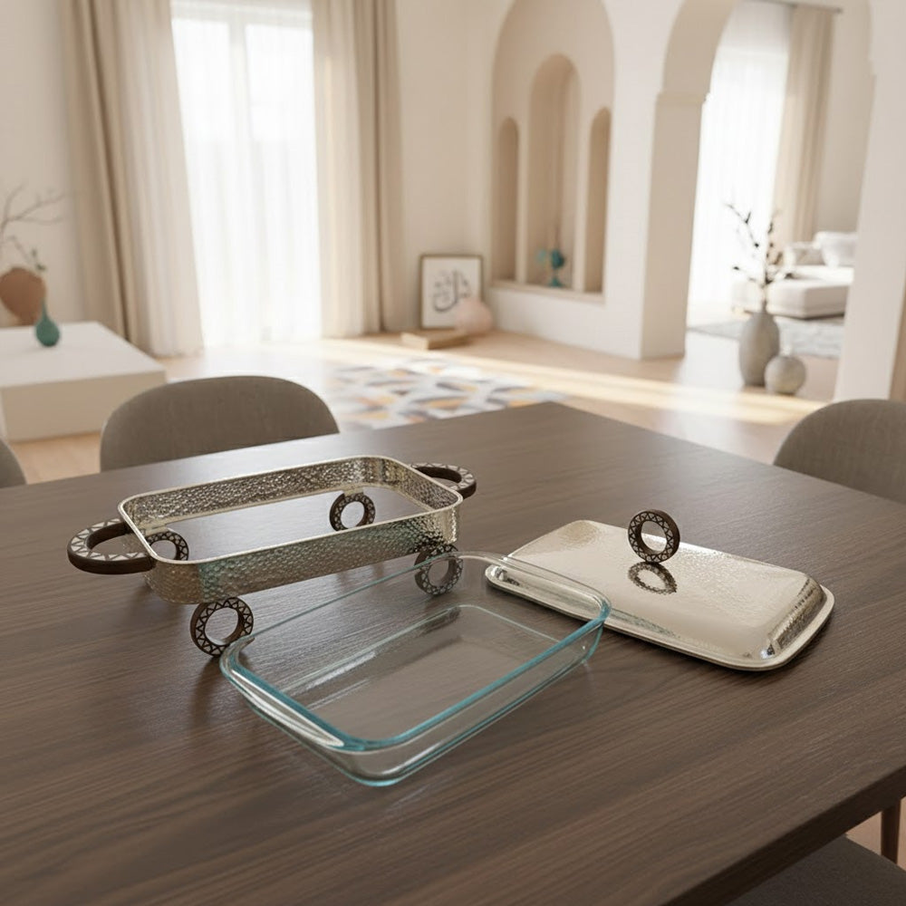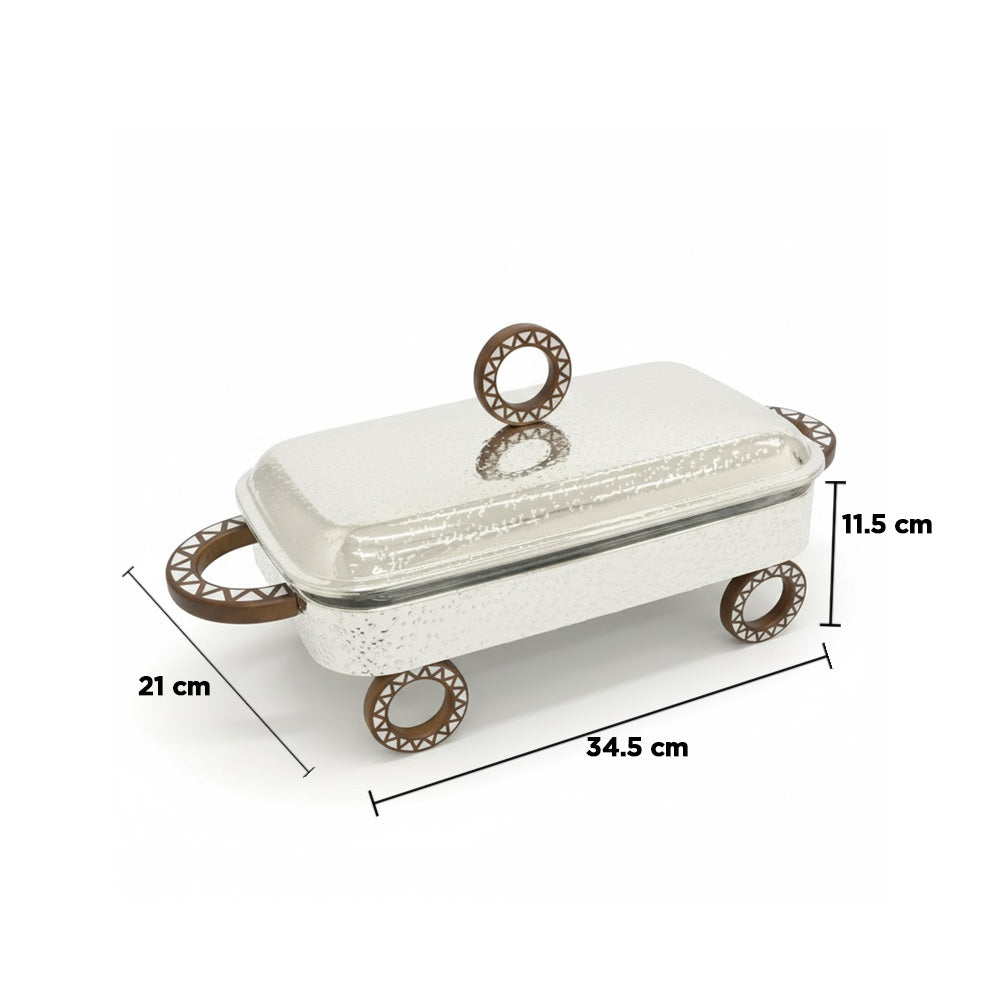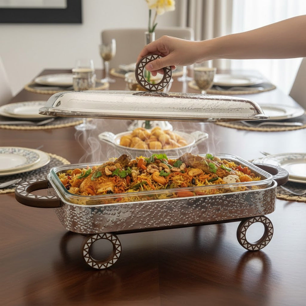 يوفر الحامل المعدني المرتفع مساحة لتسخين الشموع (أو الشموع الصغيرة) أسفله، مما يوفر دفئًا لطيفًا ومتساويًا دون حرق الطعام. يساعد الغطاء الزجاجي الشفاف على الاحتفاظ بالحرارة مع إمكانية رؤية المحتويات بسهولة، مما يجعله مثاليًا لبوفيهات الطعام وتقديم الطعام على الطاولة.