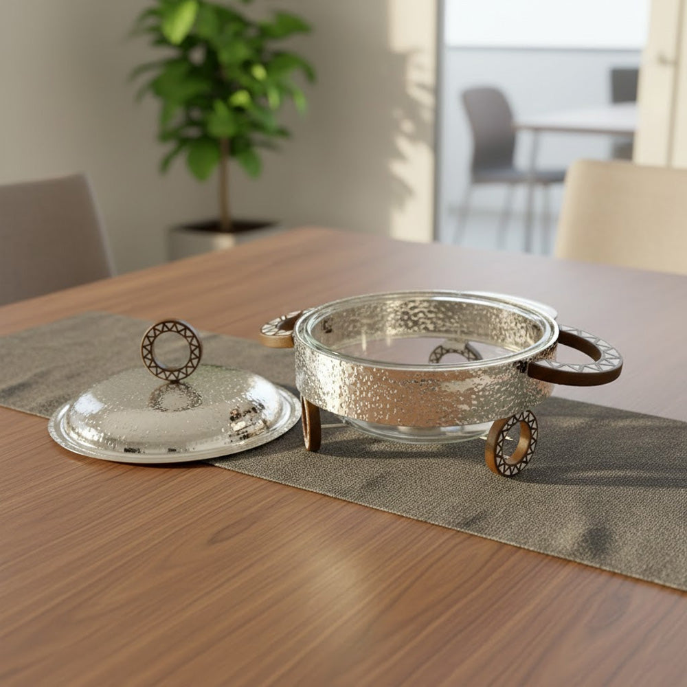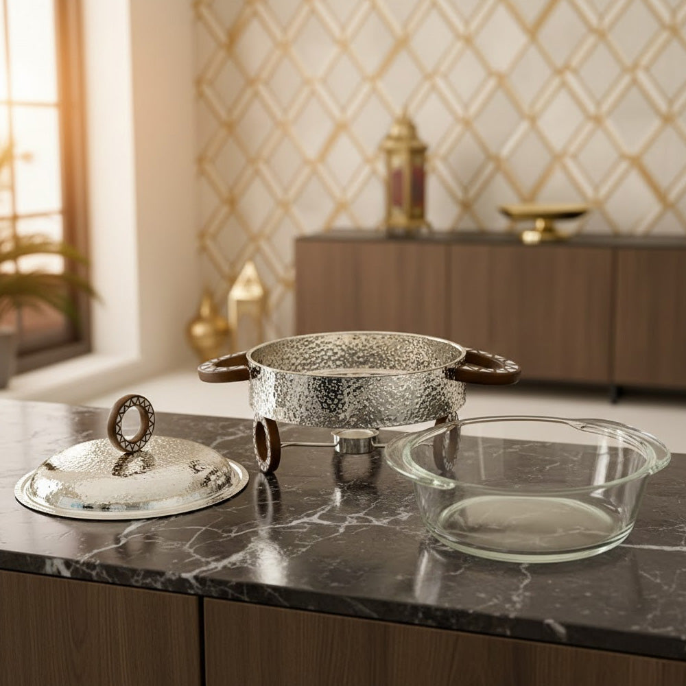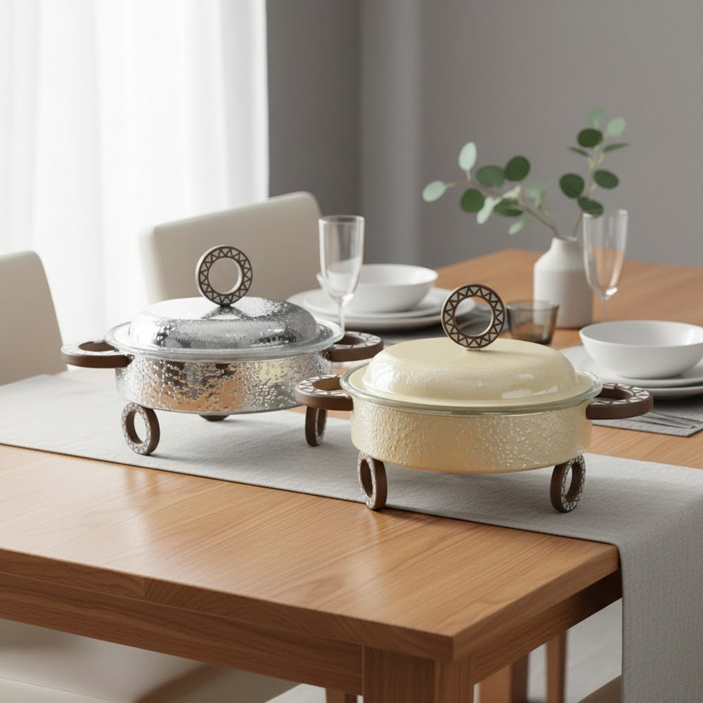 أضف لمسة من الأناقة والعملية إلى مائدة طعامك مع هذه الطنجرة الفاخرة سعة لترين، المصممة لتقديم الطعام بشكل أنيق والحفاظ على دفئه لفترة أطول. تتميز الطنجرة بوعاء زجاجي داخلي متين داخل هيكل معدني خارجي ذي ملمس جميل، ما يجمع بين العملية والجمال الراقي.