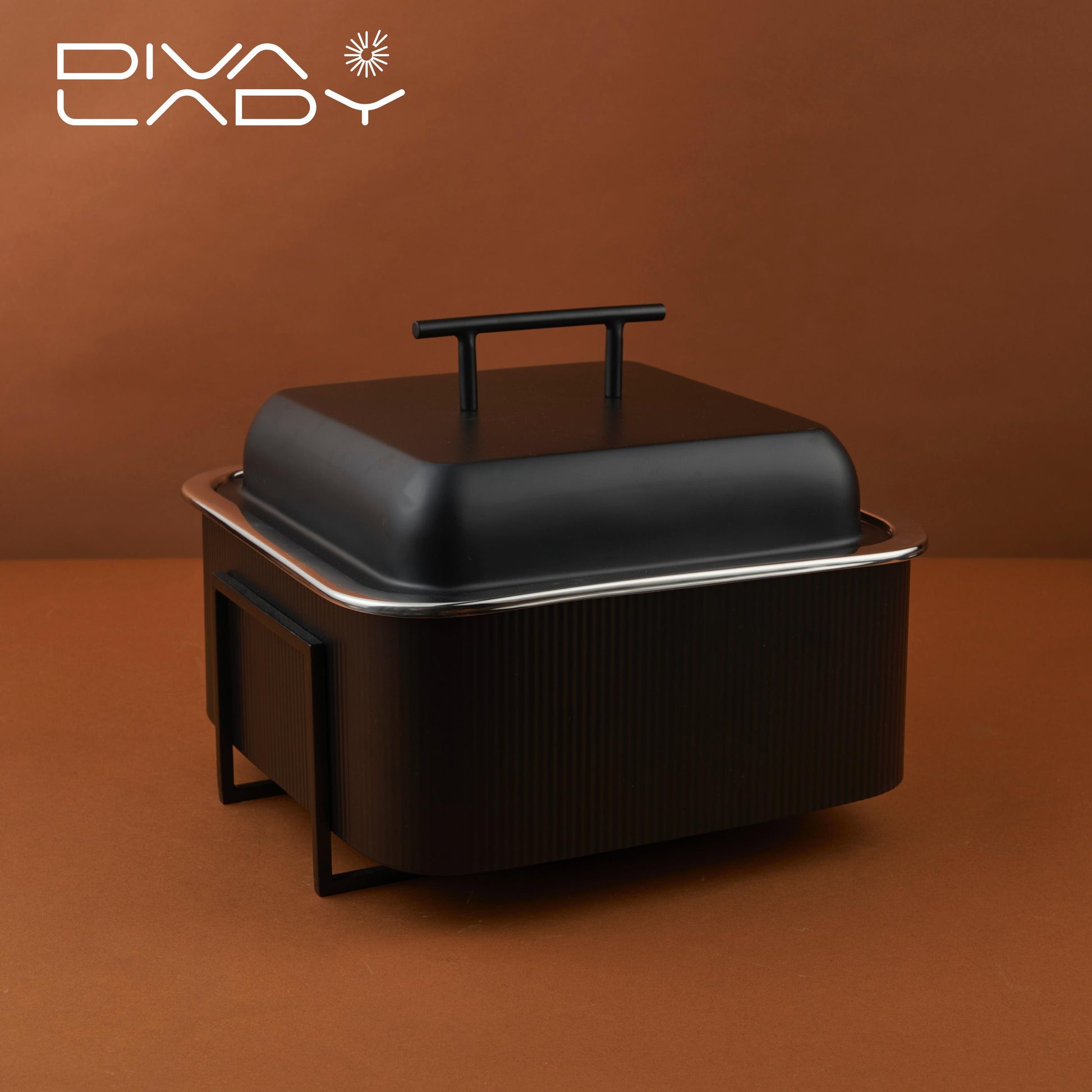 وعاء طعام كبيرمربع الشكل يحتوي على غطاء محكم الإغلاق وحامل معدني. يتميز بشكل جذاب. يمكن استخدامه لتقديم الأطعمة الساخنة والحفاظ عليها دافئة لفترة طويلة.