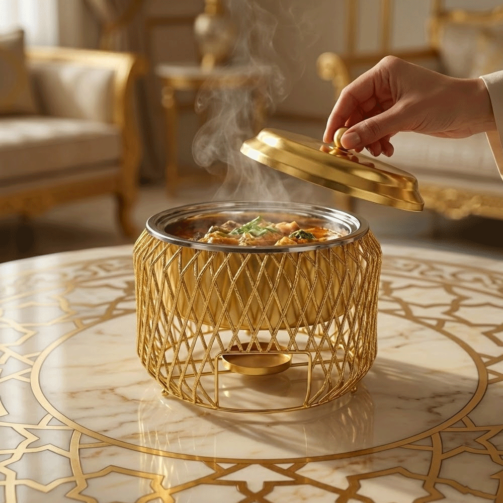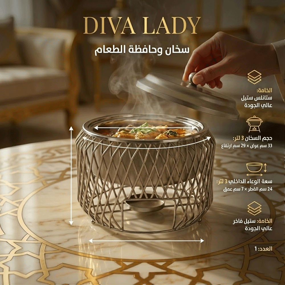 أضيفي لمسة فخامة وأناقة لطاولة التقديم مع سخان وحافظة الطعام من ديفا ليدي، قطعة تجمع بين التصميم العصري والوظيفة العملية، صُممت بعناية لتكون عنصرًا أساسيًا في الضيافة الراقية والمناسبات الخاصة.