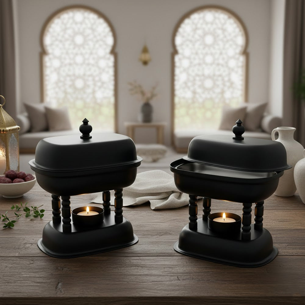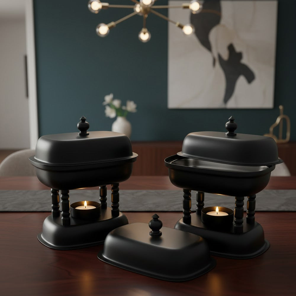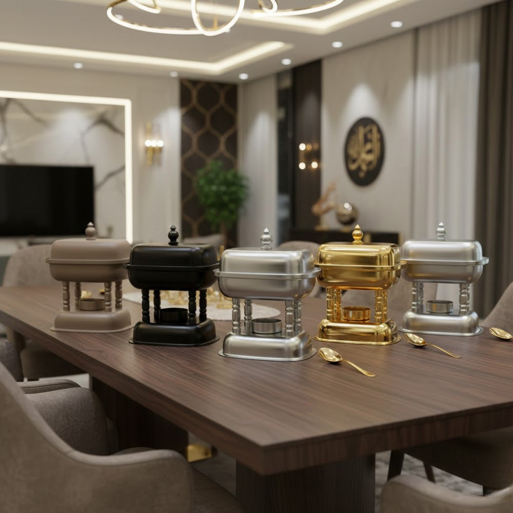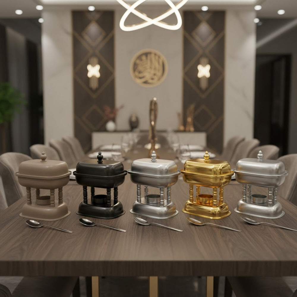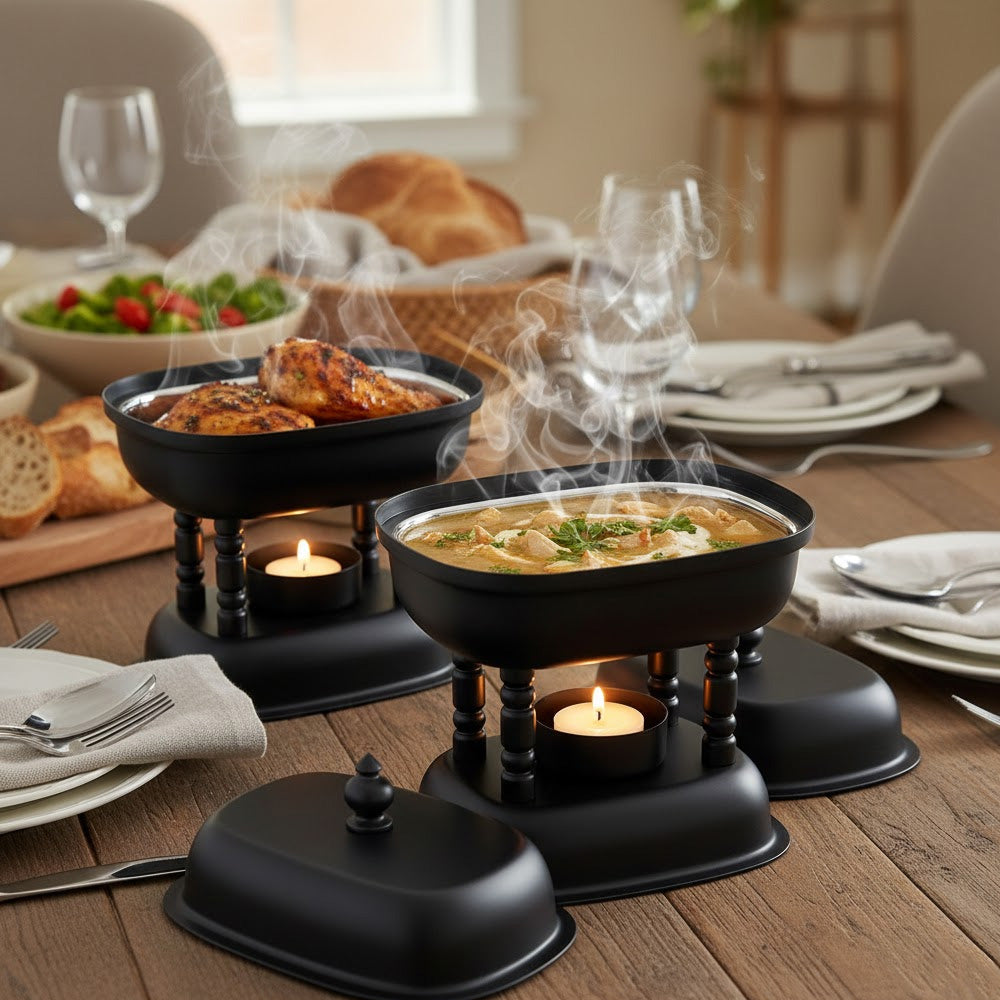 نظام تسخين عملي: مزودة بقاعدة سفلية مخصصة لوضع شمعة التسخين، مما يحافظ على حرارة الطعام لفترات طويلة دون الحاجة للكهرباء، مما يجعلها مثالية للبوفيهات والجلسات الخارجية.