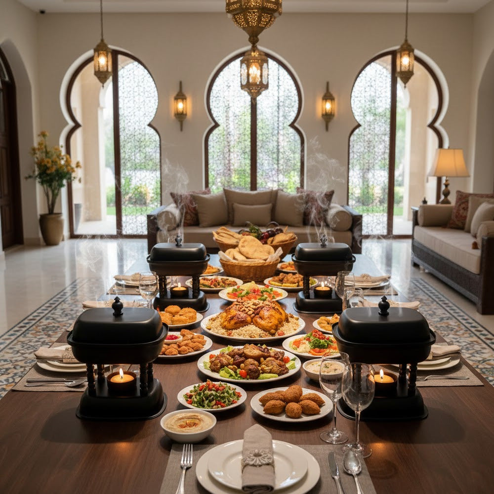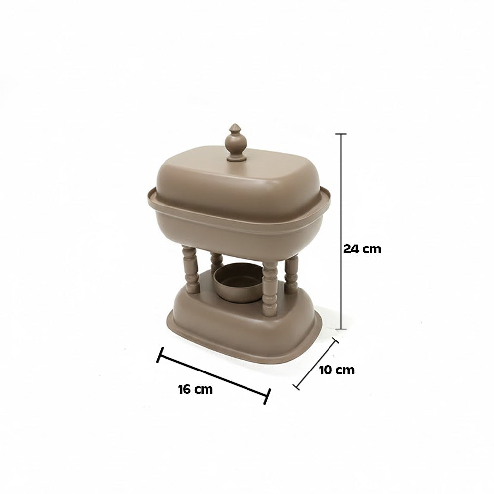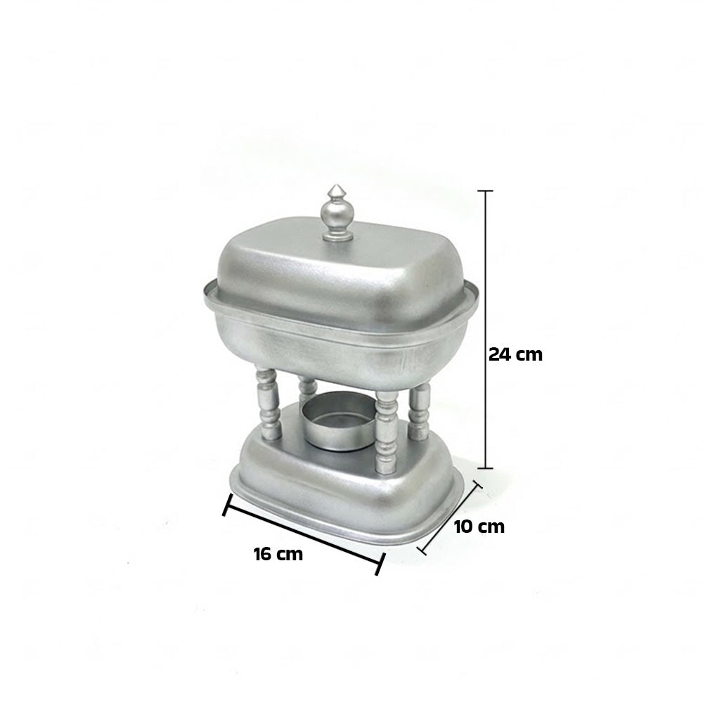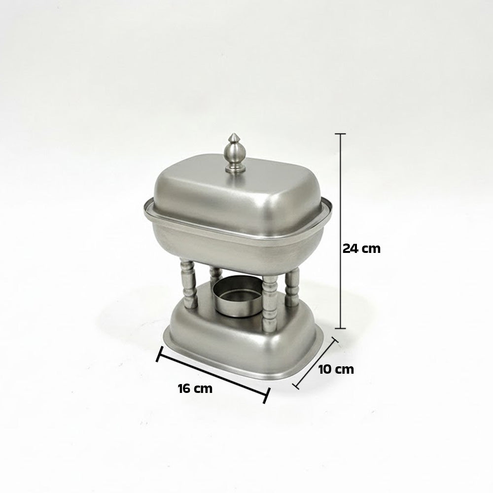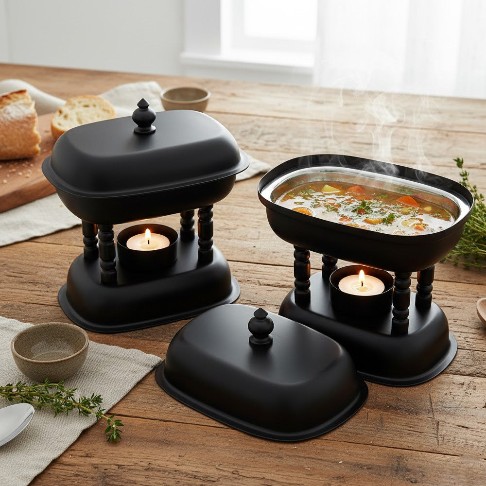 نظام تسخين عملي: مزودة بقاعدة سفلية مخصصة لوضع شمعة التسخين، مما يحافظ على حرارة الطعام لفترات طويلة دون الحاجة للكهرباء، مما يجعلها مثالية للبوفيهات والجلسات الخارجية.