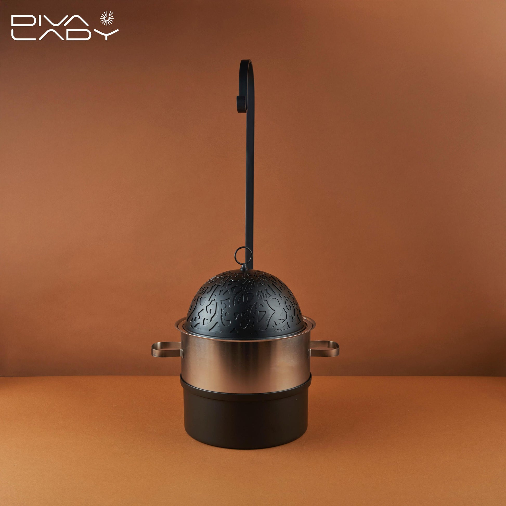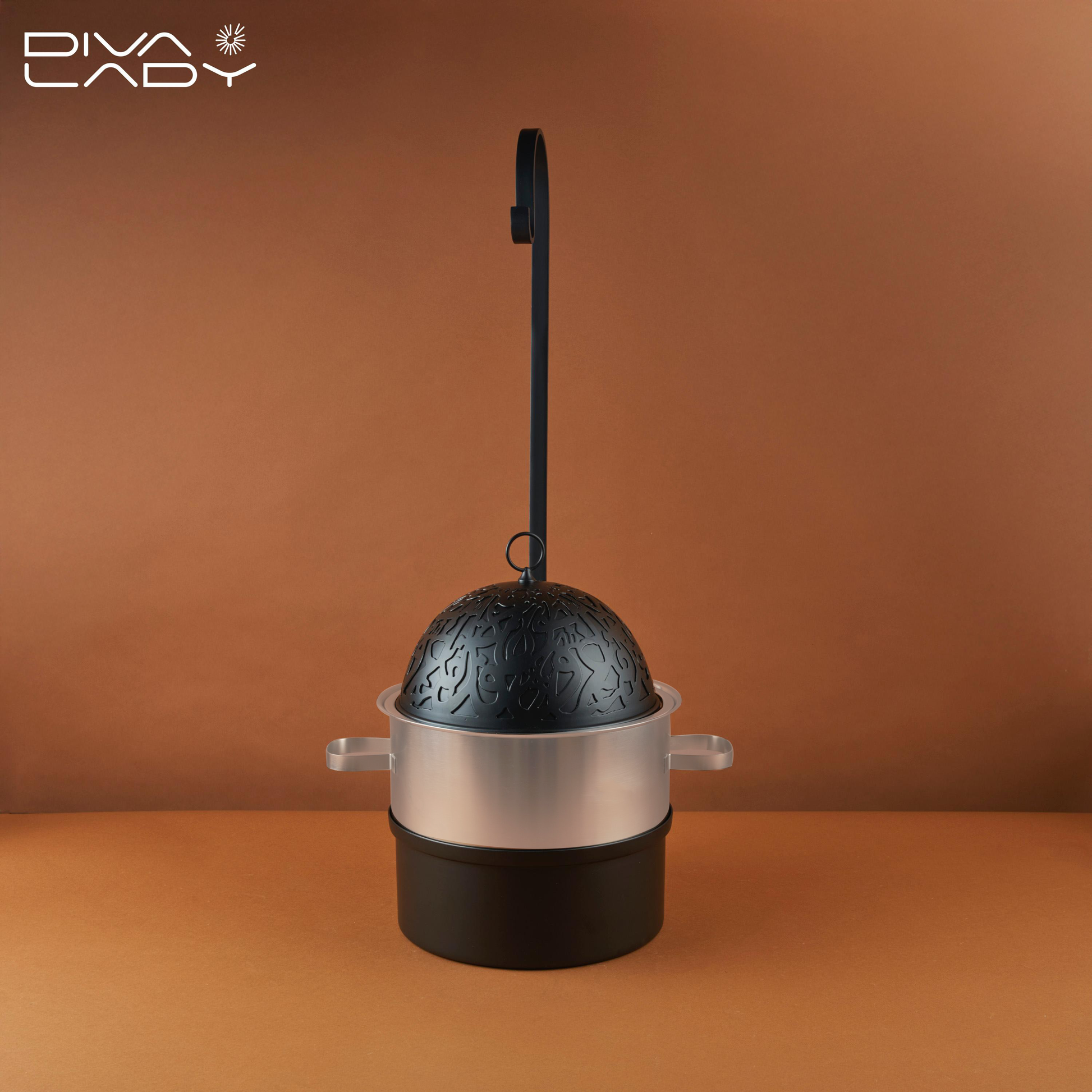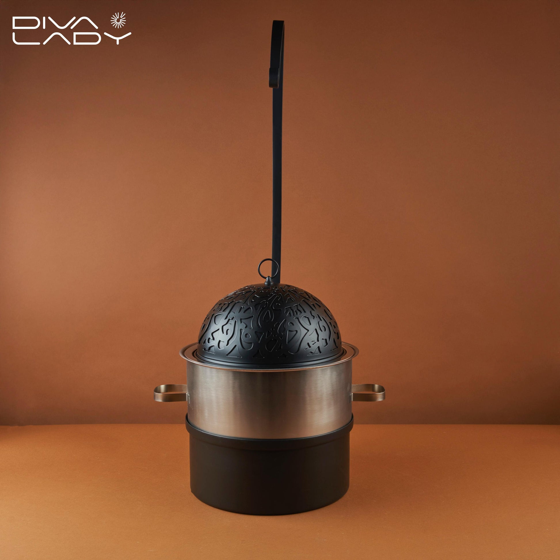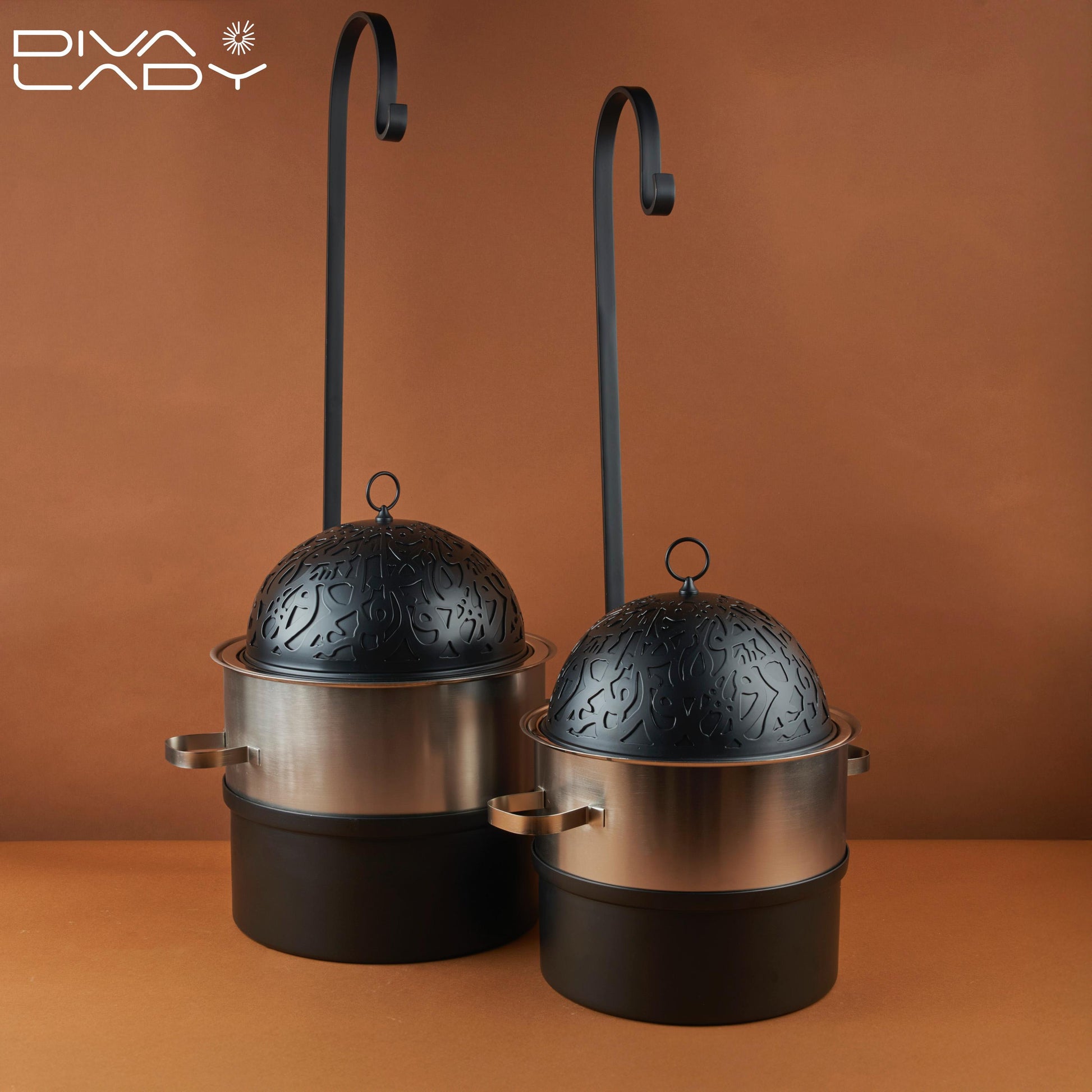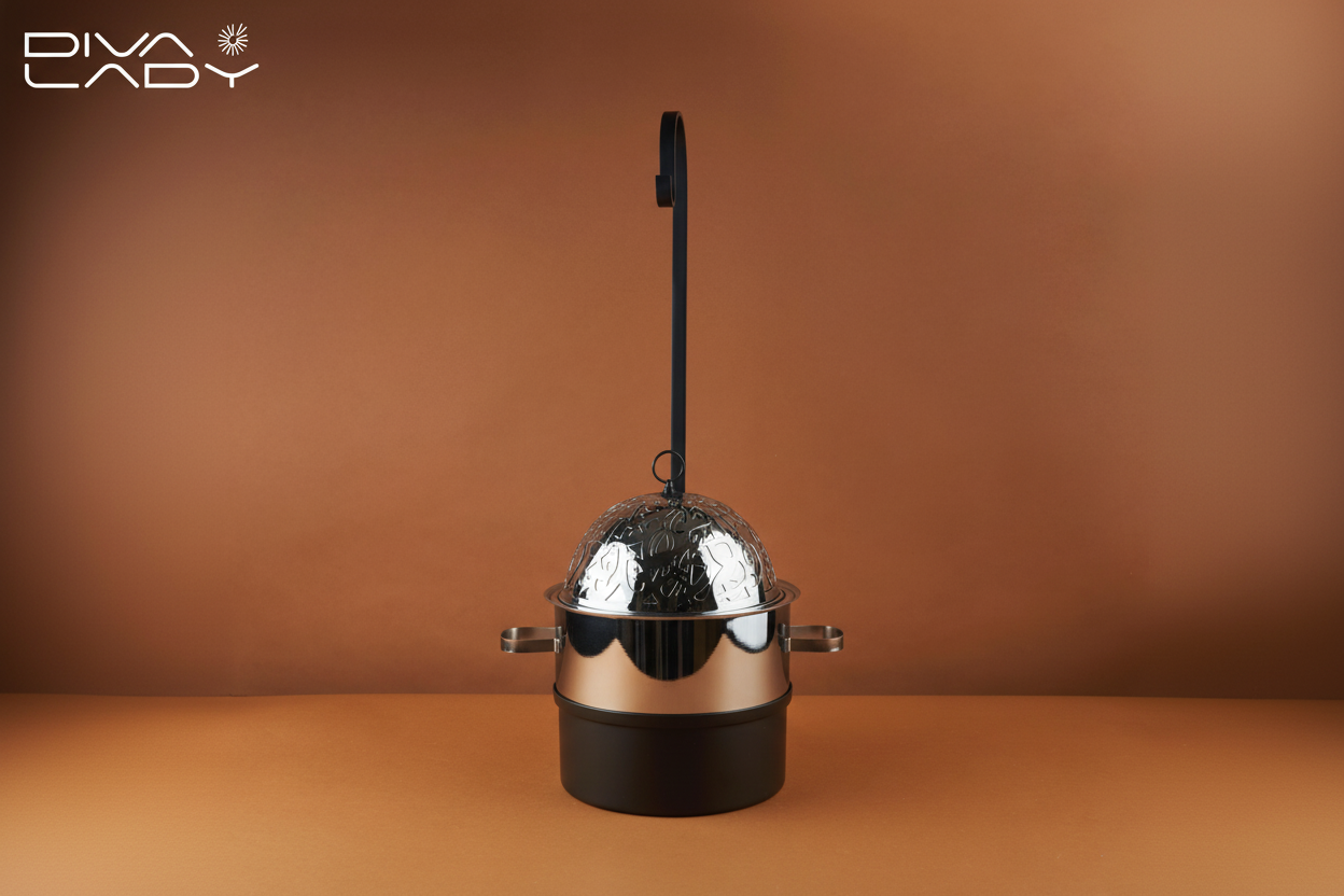 سخان طعام يتكون من وعاء معدنى دائرى بيدين جانبيتين لسهولة الحمل مع غطاء مزخرف بتصميم انيق مع حامل معدنى طويل مما يجعله مناسب للاستخدام فى الهواء الطلق يحافظ على درجه حرارة الطعام ويجعله جاهز للتقديم