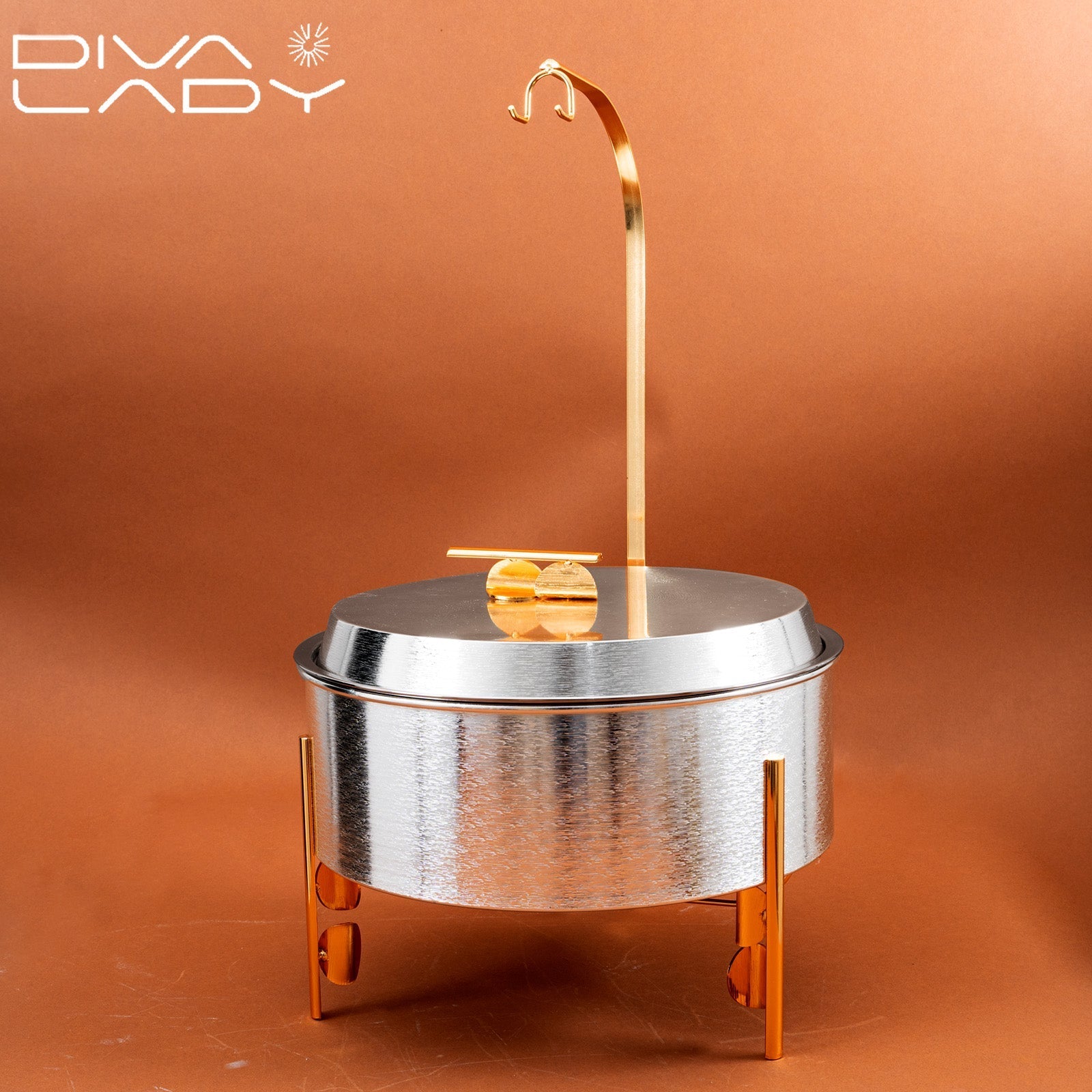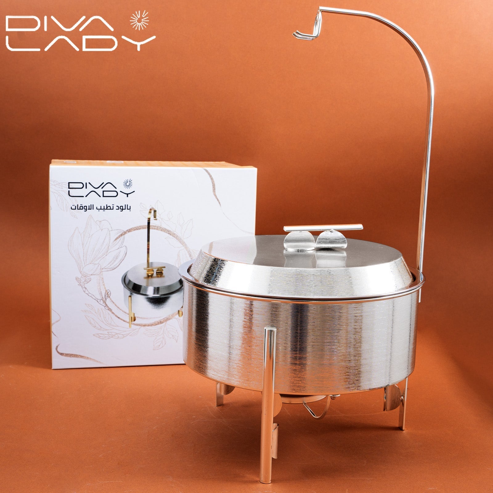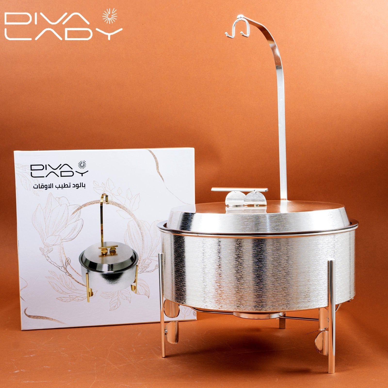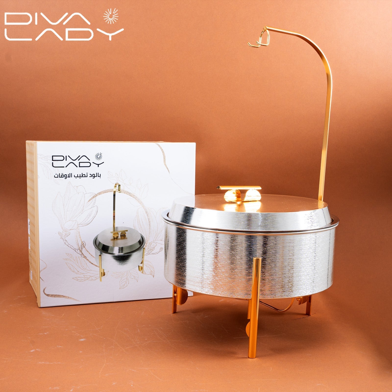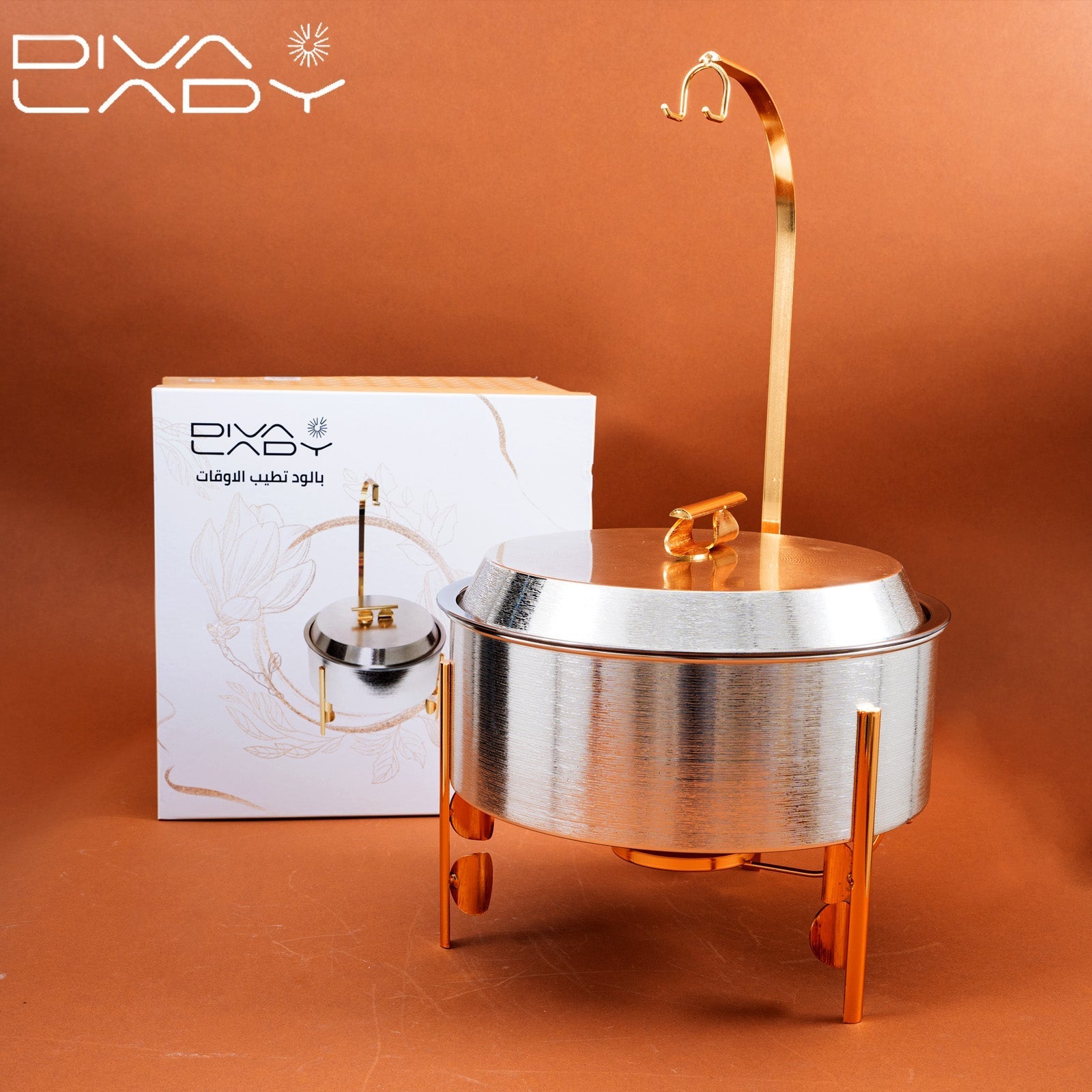 سخان طعام بتصميم أنيق يجمع بين الفخامة والعملية مصنوع من معدن بلمسة فضية لامعة، مع تفاصيل ذهبية أنيقة تعزز من جاذبيته يتميز بغطاء محكم للحفاظ على حرارة الطعام، وأرجل ذهبية تمنحه ثباتًا وأناقة. كما يحتوي على مقبض علوي منحني بتصميم عملي يسهل حمله ونقله مثالي للحفاظ على دفء الطعام في المناسبات والاجتماعات العائلية، مما يجعله إضافة رائعة لأي طاولة طعام