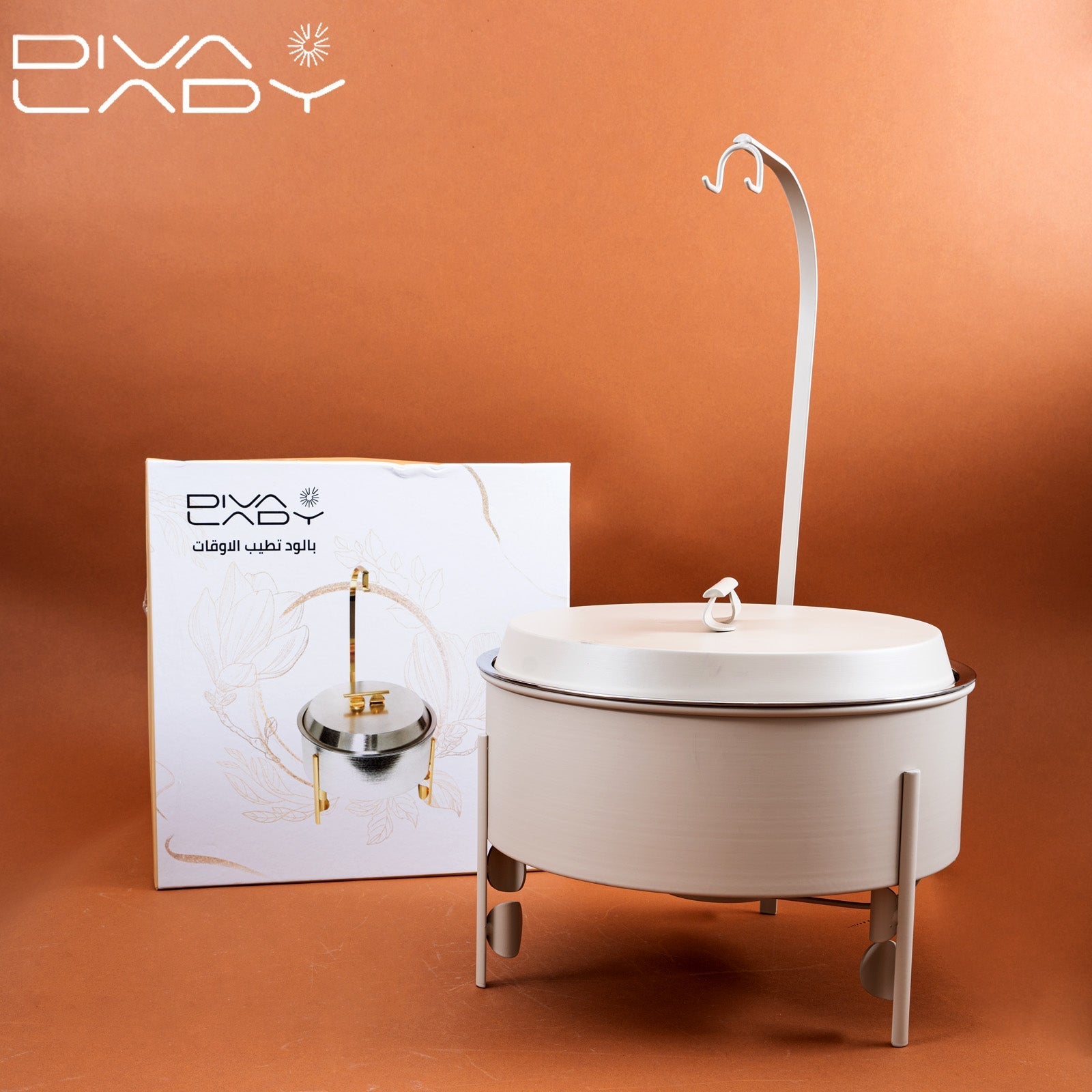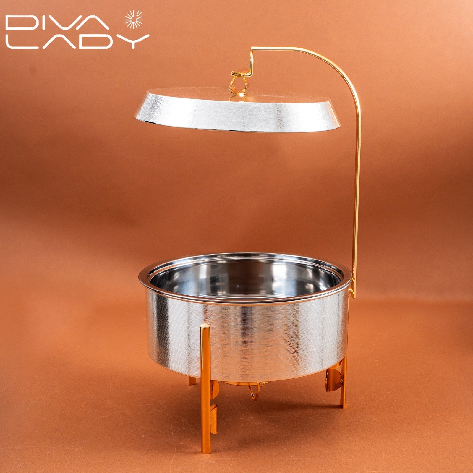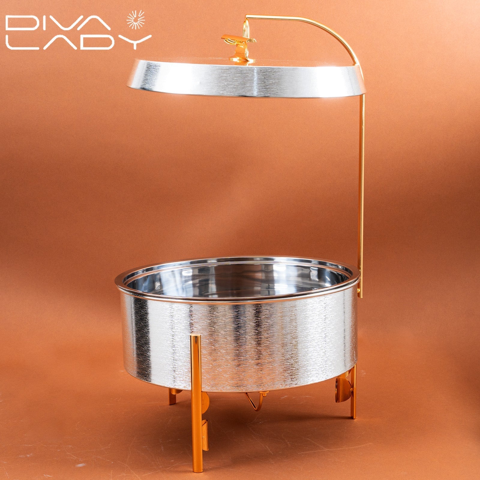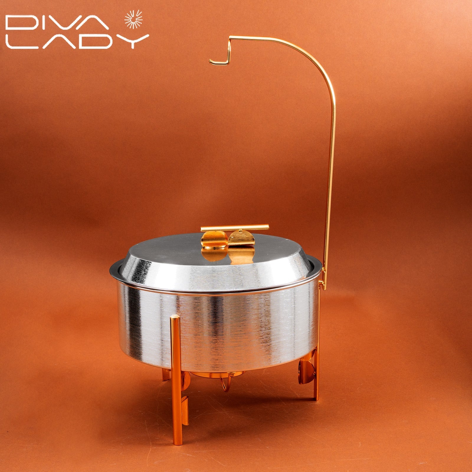 سخان طعام بتصميم أنيق يجمع بين الفخامة والعملية مصنوع من معدن بلمسة فضية لامعة، مع تفاصيل ذهبية أنيقة تعزز من جاذبيته يتميز بغطاء محكم للحفاظ على حرارة الطعام، وأرجل ذهبية تمنحه ثباتًا وأناقة. كما يحتوي على مقبض علوي منحني بتصميم عملي يسهل حمله ونقله مثالي للحفاظ على دفء الطعام في المناسبات والاجتماعات العائلية، مما يجعله إضافة رائعة لأي طاولة طعام