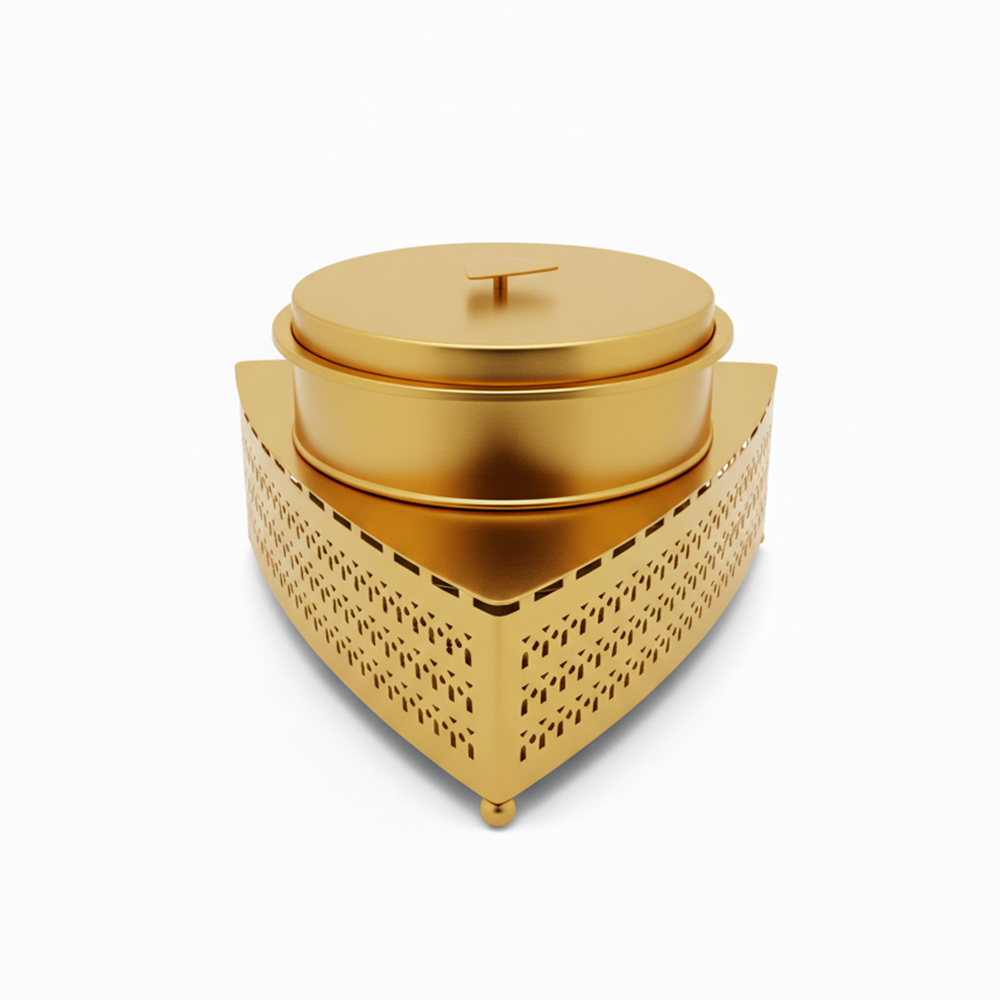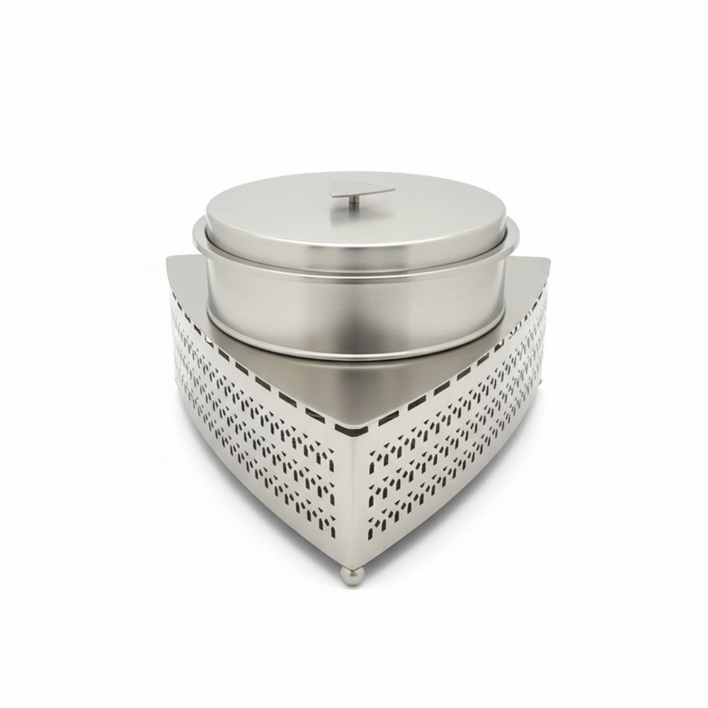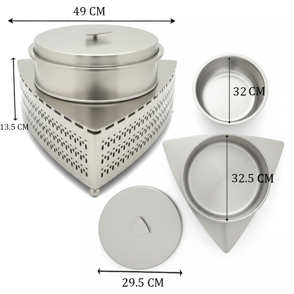 اجعل كل وجبة أكثر أناقة مع طقم تقديم الطعام المعدني الفاخر الذي يتضمن صينية مثلثية مزخرفة مع وعاء كبير مزود بغطاء محكم للحفاظ على حرارة الطعام.