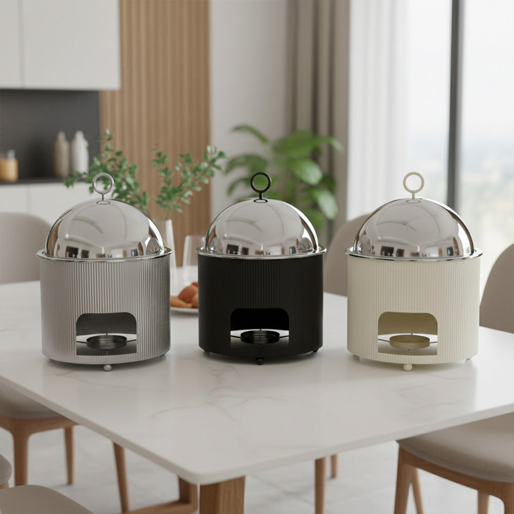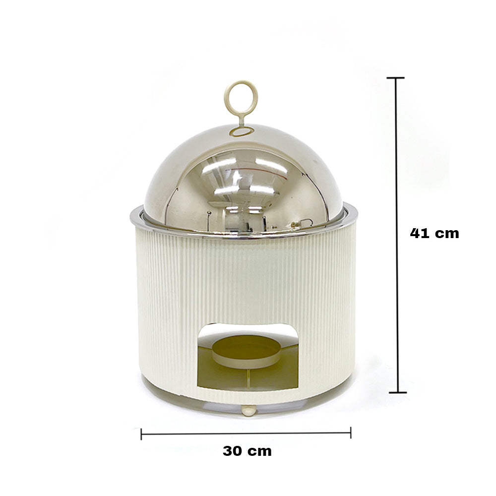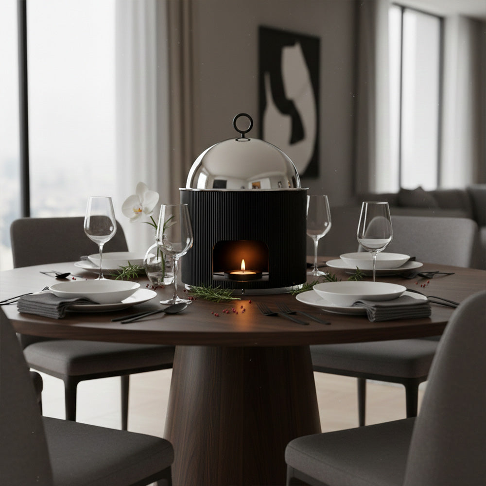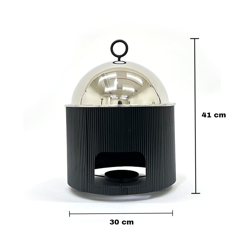 ارتقِ بتقديم طعامك مع سخان الطعام الفاخر ذي القبة المصنوعة من الفولاذ المقاوم للصدأ، والمصمم للحفاظ على الطعام ساخنًا مع إضافة لمسة عصرية وأنيقة لأي مكان. يحافظ غطاء القبة المصقول على الحرارة بكفاءة، بينما يمنح الهيكل المعدني المضلع مظهرًا أنيقًا وعصريًا.