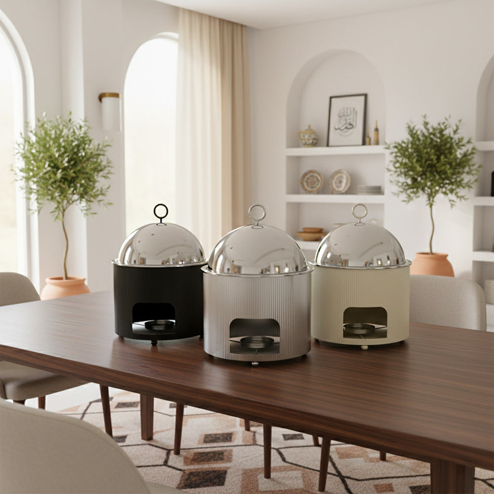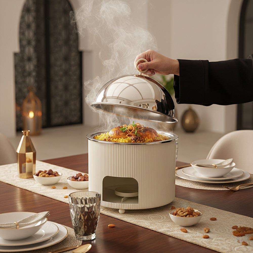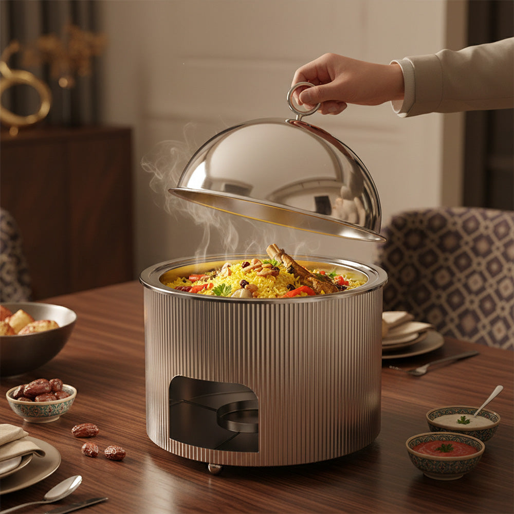يحتوي سخان الطعام هذا على حامل شموع مدمج، مما يضمن الحفاظ على درجة حرارة التقديم المثالية لفترات طويلة. مثالي للبوفيهات، والمناسبات الخاصة، وتجمعات رمضان، والفنادق، وتناول الطعام في المنزل، فهو يجمع بين العملية والتصميم الراقي.