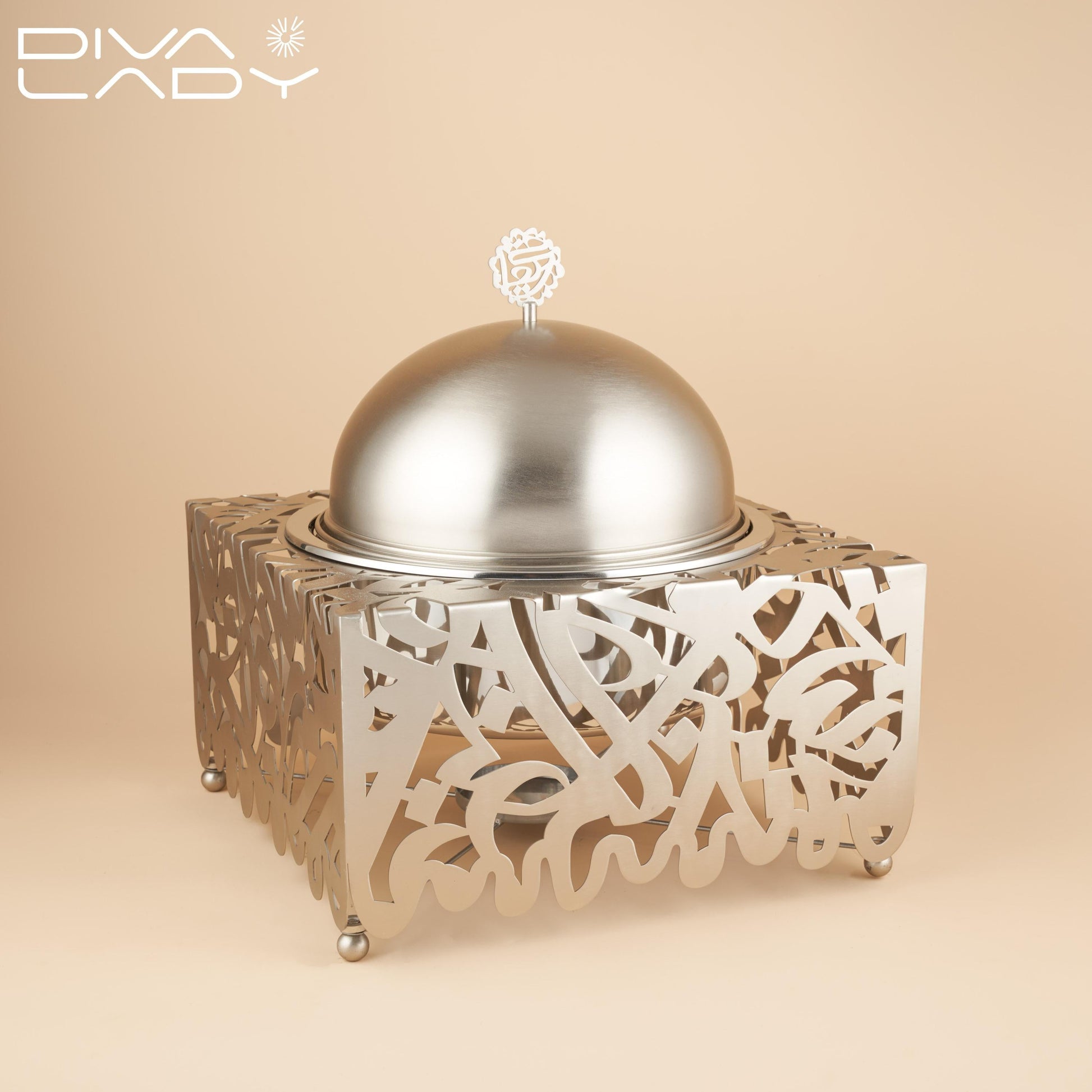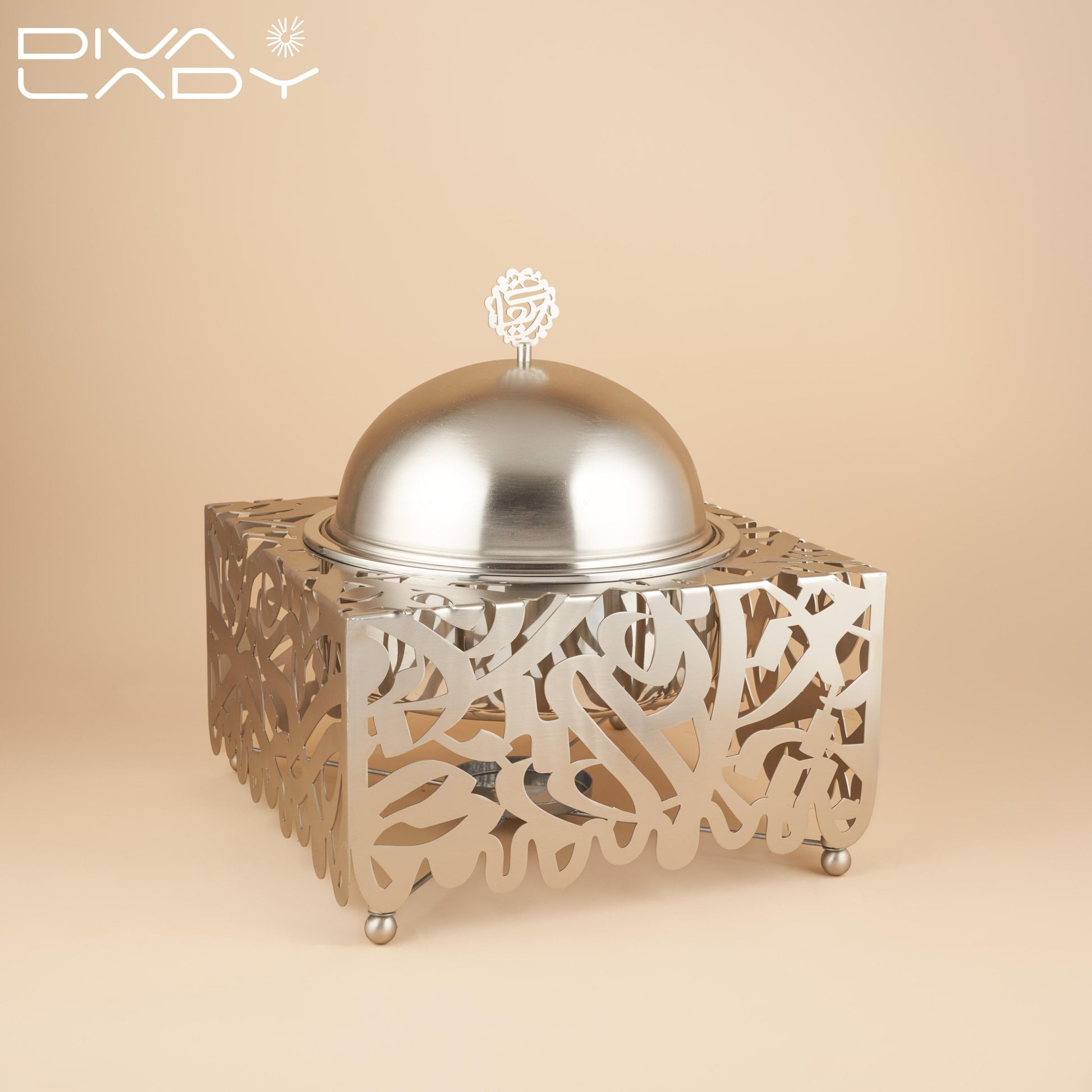 سخان طعام بهيكل متين من الاستيل . حامل ذهبى اللون و غطاء فضى له مظهر مميز . له حيز لوضع شمعة للتسخين