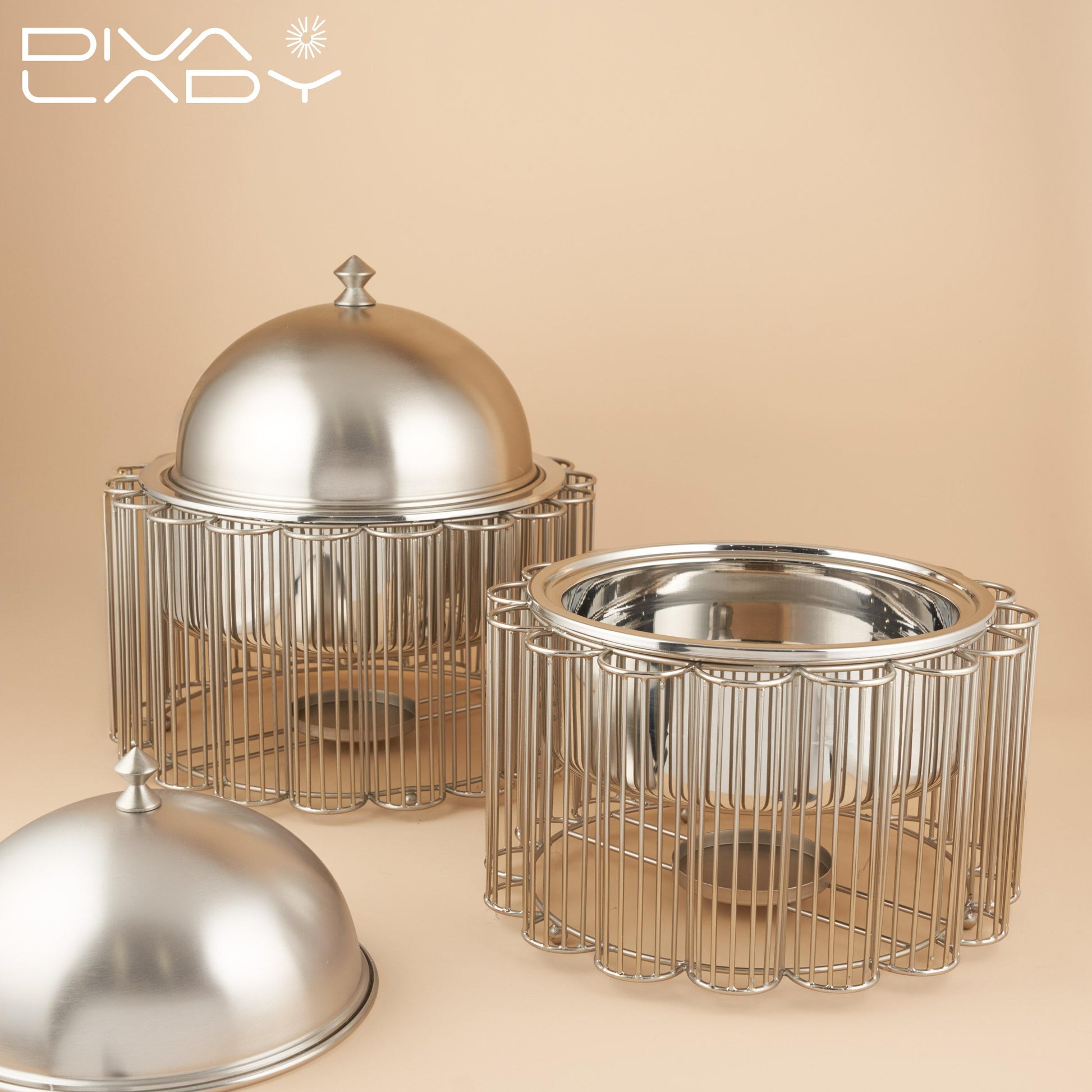سخان طعام بهيكل متين من الاستيل . حامل فضى اللون و غطاء فضى له مظهر مميز . له حيز لوضع شمعة للتسخين