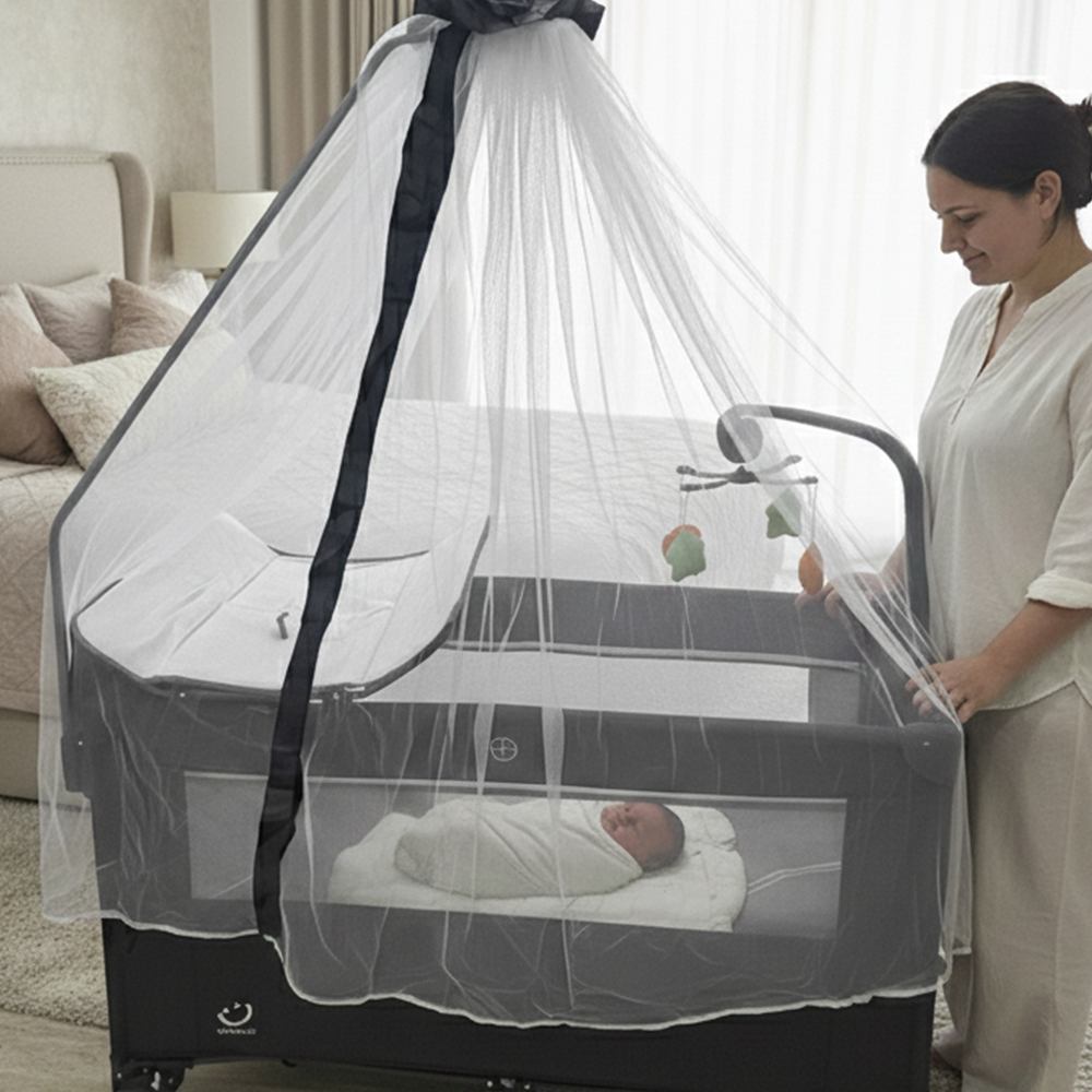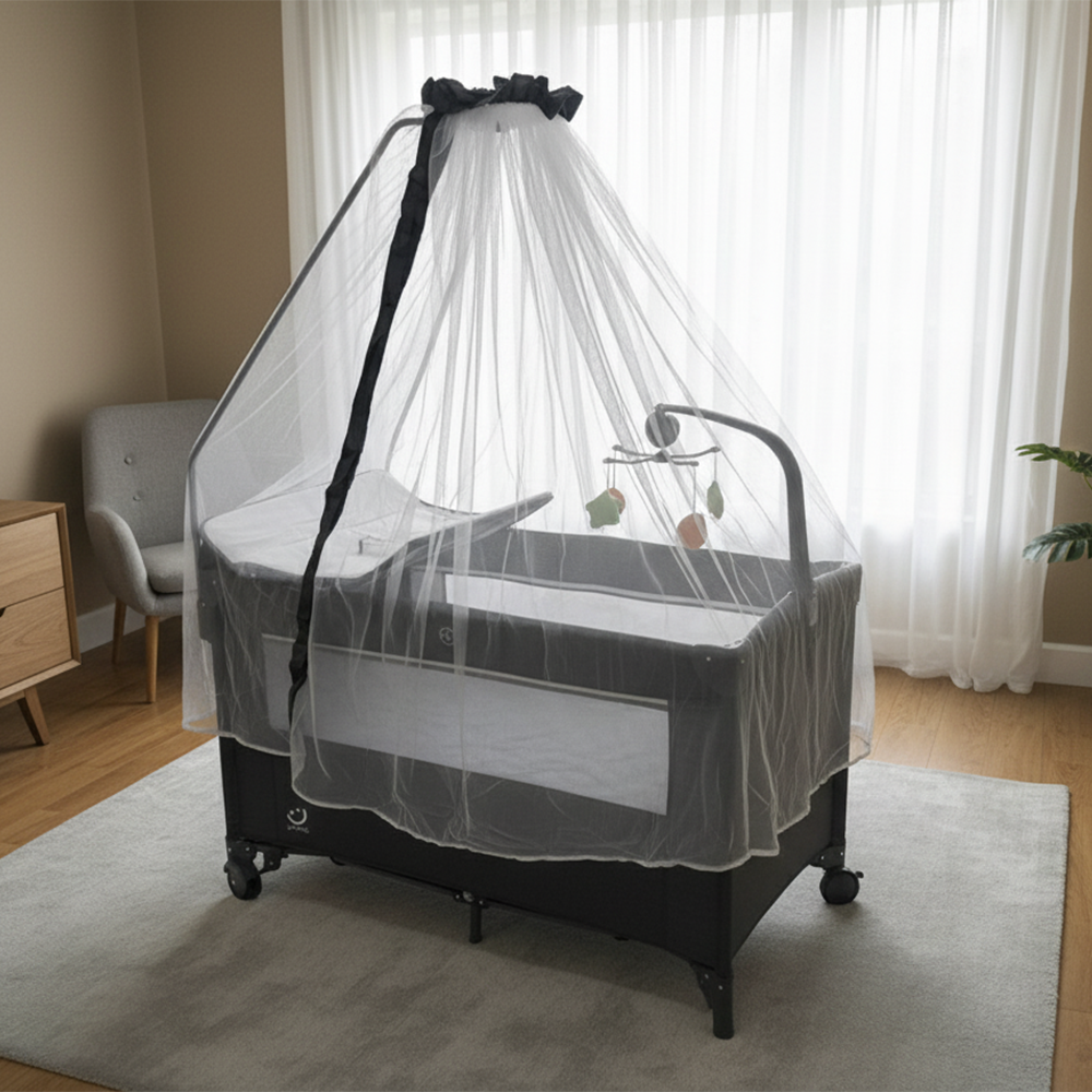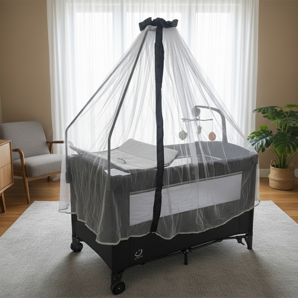 يأتي السرير مزودًا بـ ناموسية واقية من الحشرات، وطاولة تغيير مريحة، إضافة إلى ألعاب معلقة ملونة تساعد على تحفيز حواس الطفل.