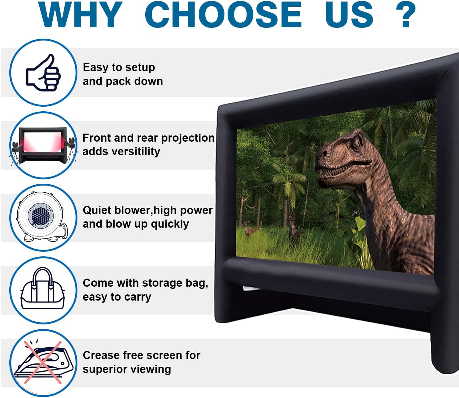 - 【نفخ سريع】 منفاخ هواء عالي الطاقة 110 فولت 250 واط متضمن يمكنه نفخ شاشة الأفلام هذه في دقيقتين والحفاظ عليها منفوخة طوال العرض عند توصيلها (تذكر أن السحاب قبل النفخ)؛ والأهم من ذلك، لم يكن المنفاخ ملحوظًا بمجرد بدء الفيلم، مما يمنحك تجربة مشاهدة أفلام غامرة.