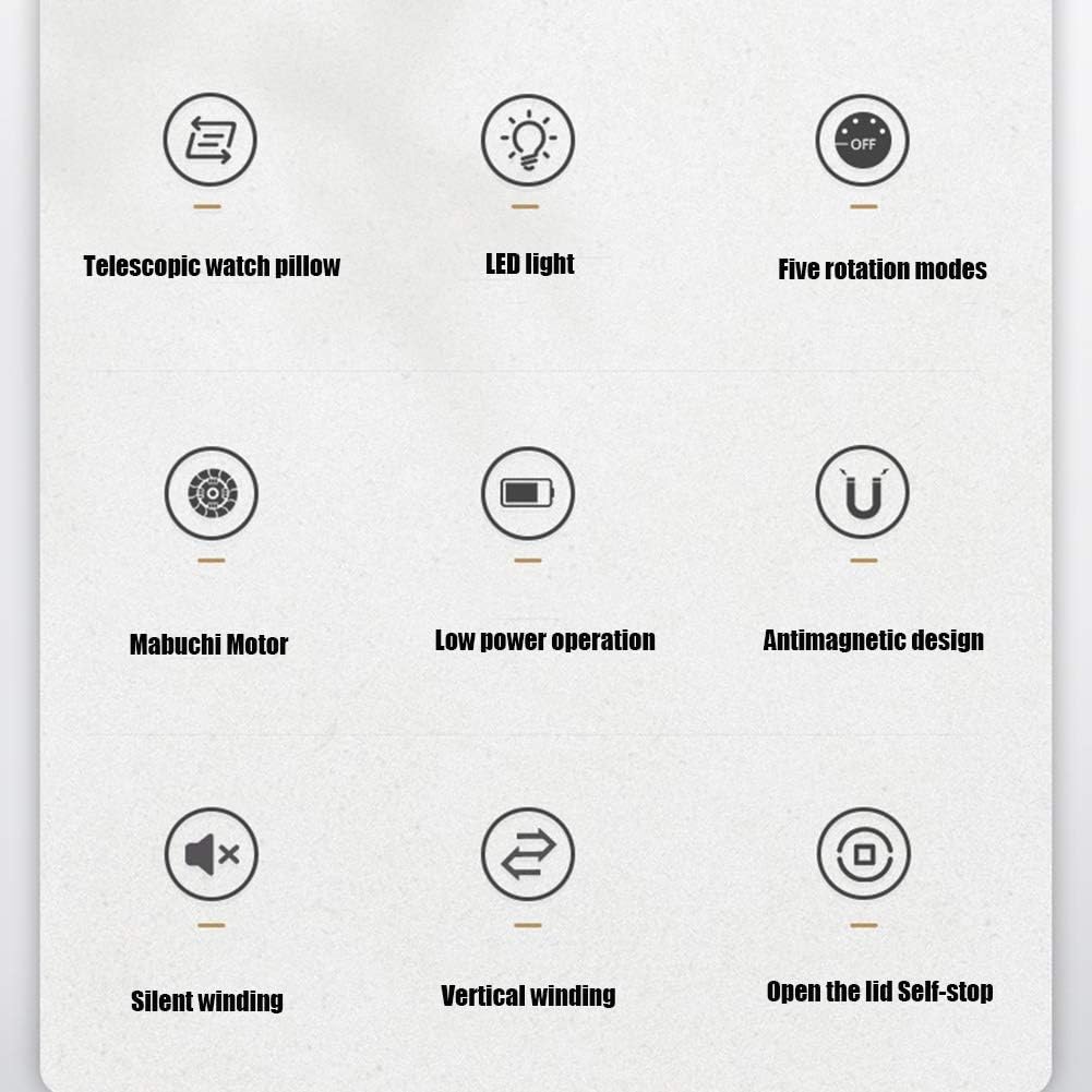 ►غطاء مفتوح ومغلق عندما تفتح الباب، يتم إيقاف تشغيل اللفاف تلقائيًا، وهو مناسب للاستخدام اليومي للساعة ويحسن معدل استخدام لفاف الساعة؛ إطالة عمر جهازك.