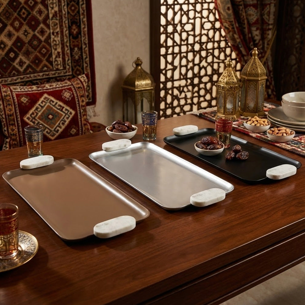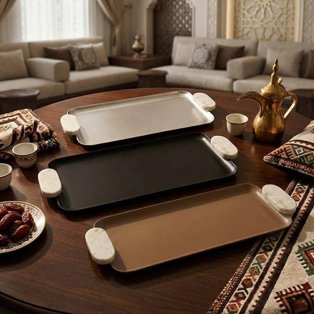 ارتقِ بتجربة تقديم الطعام مع صينية التقديم المستطيلة العصرية هذه، المصممة لتجمع بين العملية والأناقة الراقية. تتميز بسطح معدني أملس ومقابض أنيقة من حجر الرخام على كلا الجانبين، مما يضفي لمسة عصرية على أي غرفة طعام أو معيشة.