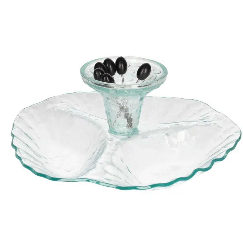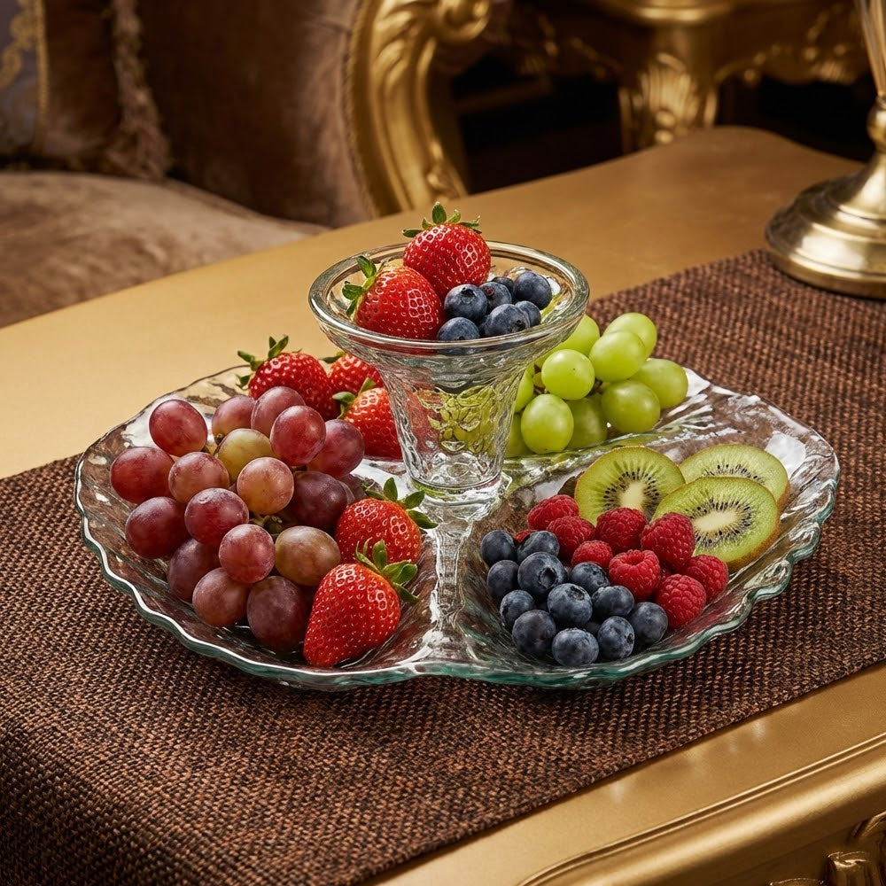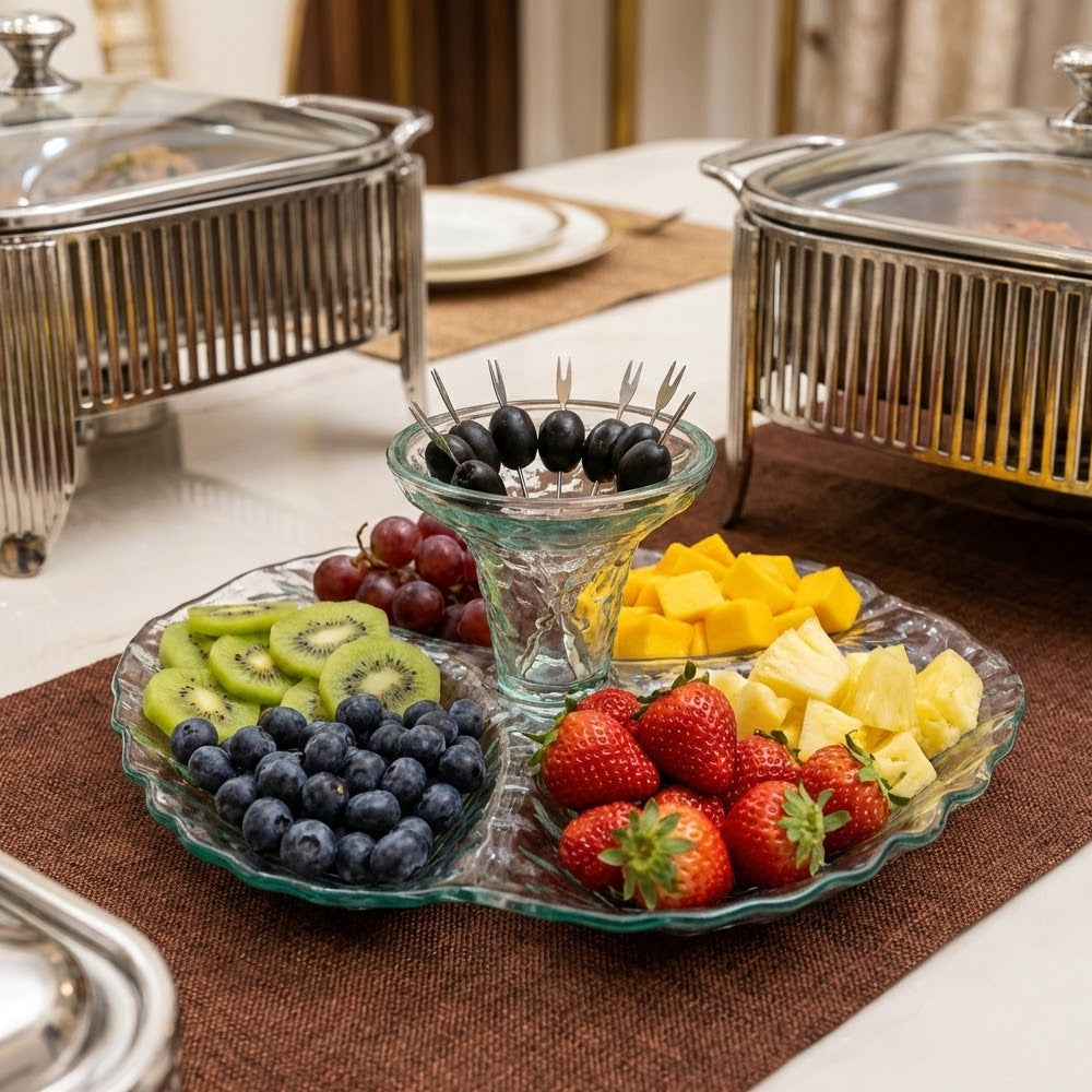 صينية تقديم زجاجية بتصميم زهري أنيق تضيف لمسة من الجمال والرقي إلى طاولة التقديم لديك. تتميز بشكلها الفريد وتقسيمها العملي، مما يجعلها مثالية لتقديم المقبلات، الفواكه، الحلويات، السناك، الساندويتشات أو السوشي بأسلوب أنيق وجذاب.