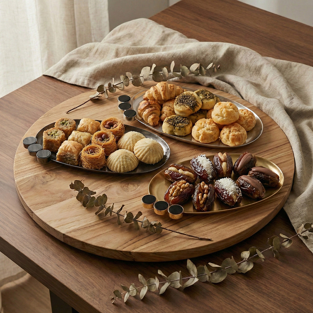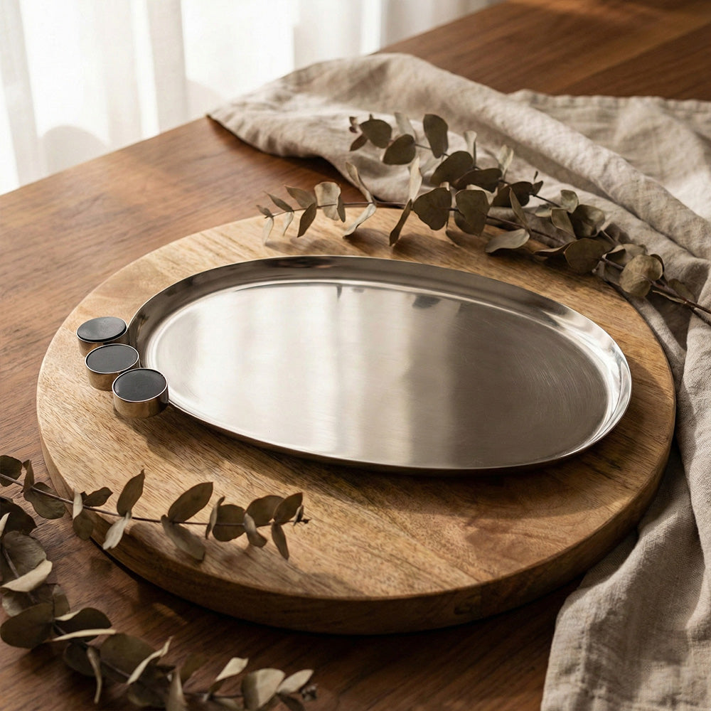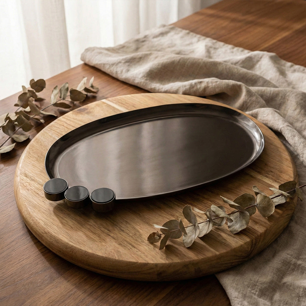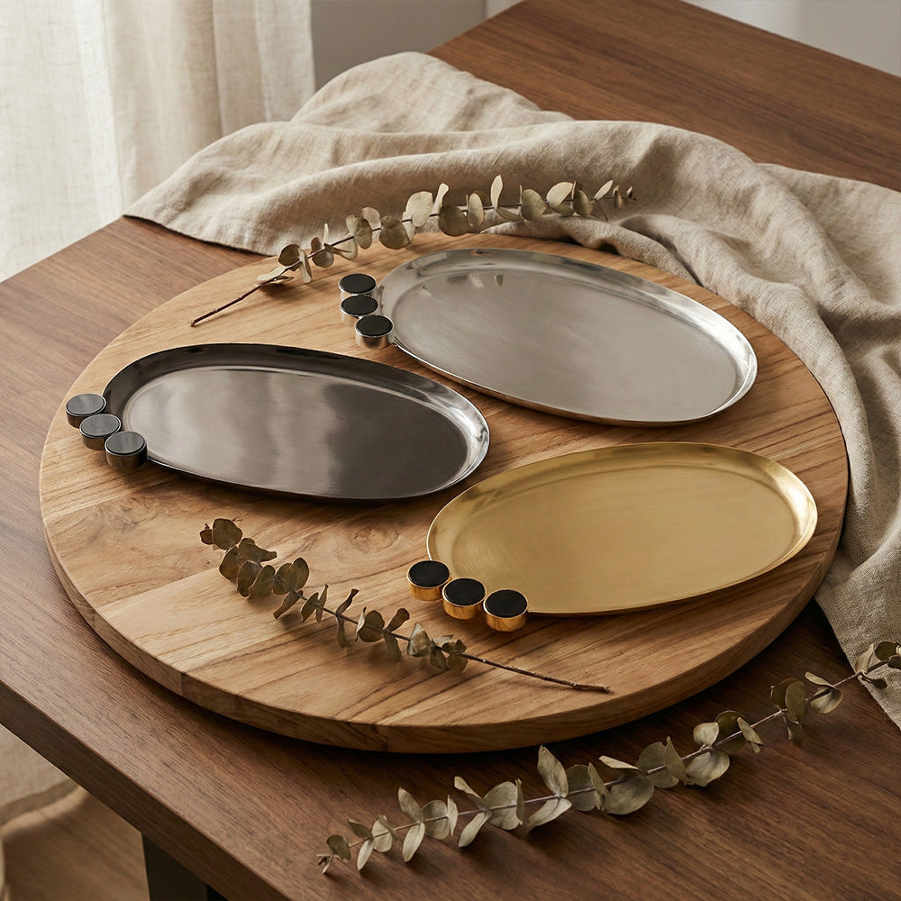 أضيفي لمسة من الأناقة الساحرة إلى منزلك مع مجموعة الصواني المعدنية الفاخرة. تتميز هذه الصواني بتصميمها البيضاوي الانسيابي المزين بثلاث دوائر سوداء وبني بارزة على الحافة، مما يمنحها طابعاً هندسياً فريداً يمزج بين الحداثة والكلاسيكية.
