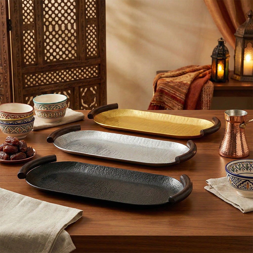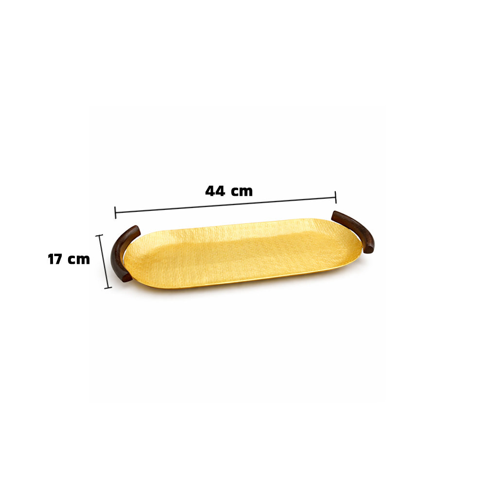 أضف لمسة من الرقي إلى ديكور منزلك مع صينية التقديم الفاخرة ذات التصميم الأنيق، فهي إضافة راقية وعملية لأي مساحة معيشة عصرية. يبلغ طول هذه الصينية عالية الجودة 44 سم وعرضها 17 سم، وهي مصنوعة من معدن متين بلمسة نهائية ناعمة وملمس مميز، لتجمع بين العملية والتصميم العصري.