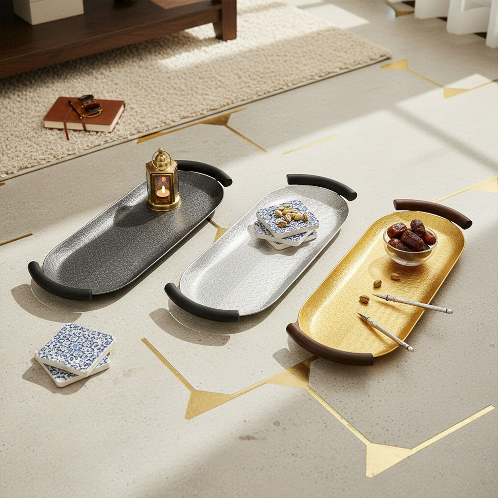 أضف لمسةً من الفخامة إلى منزلك أو مكتبك مع صينية التقديم الفاخرة والعملية هذه. أضف لمسةً من الأناقة العصرية إلى مساحتك واستمتع بحل عملي لجميع احتياجاتك في التقديم. مثالية لكل من يسعى إلى تحسين ديكور منزله بصواني فاخرة تجمع بين الأناقة والمتانة.